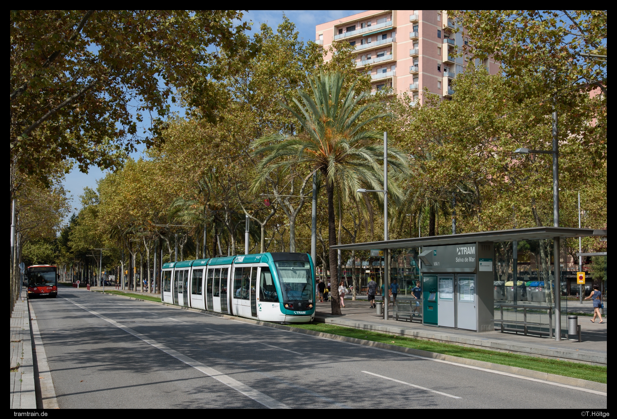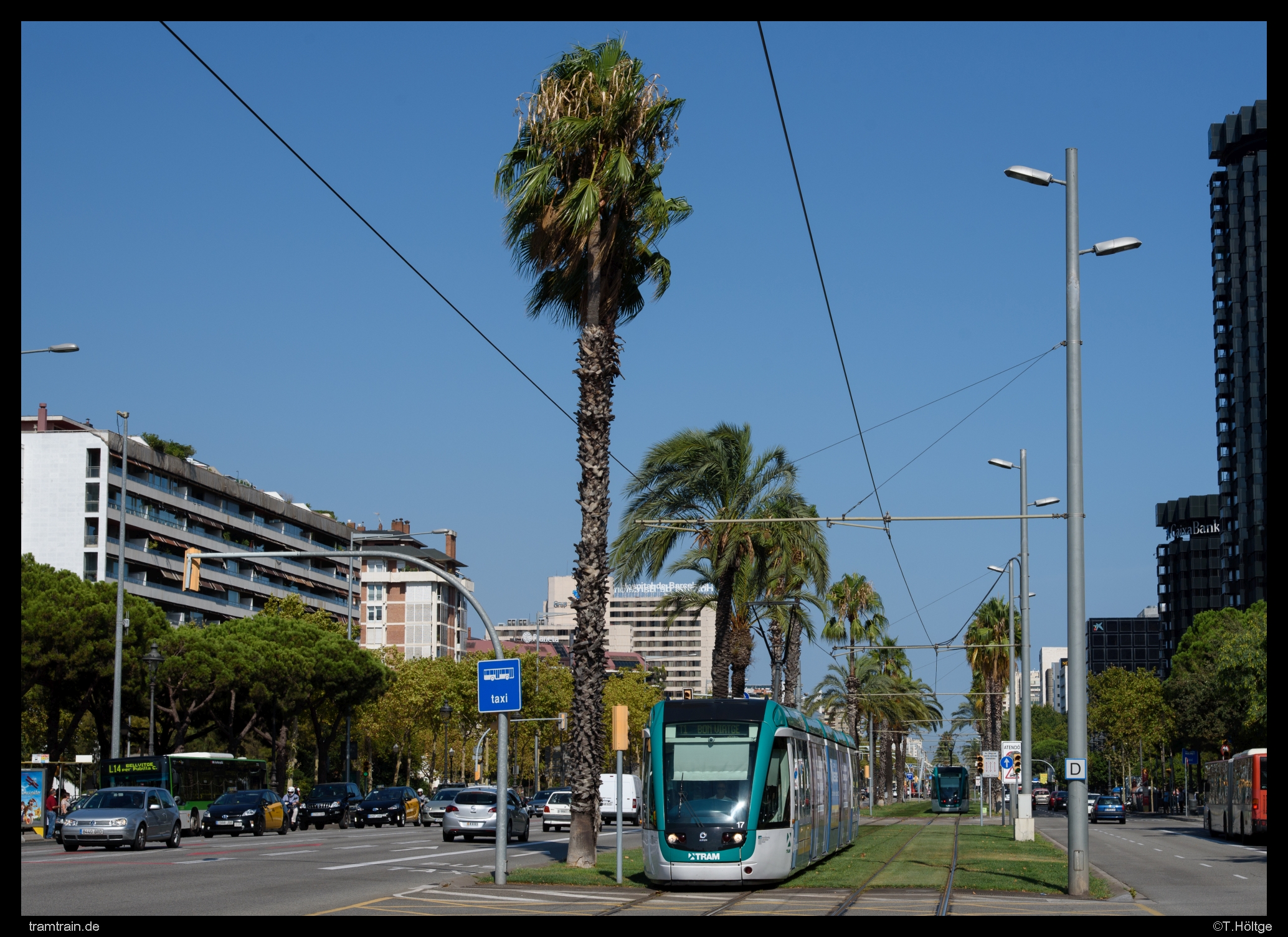 Kennzeichnend für den von allen drei Linien befahrenen Abschnitt auf der Avinguda Diagonal, sind die hohen Palmen rechts und links des Rasengleises.