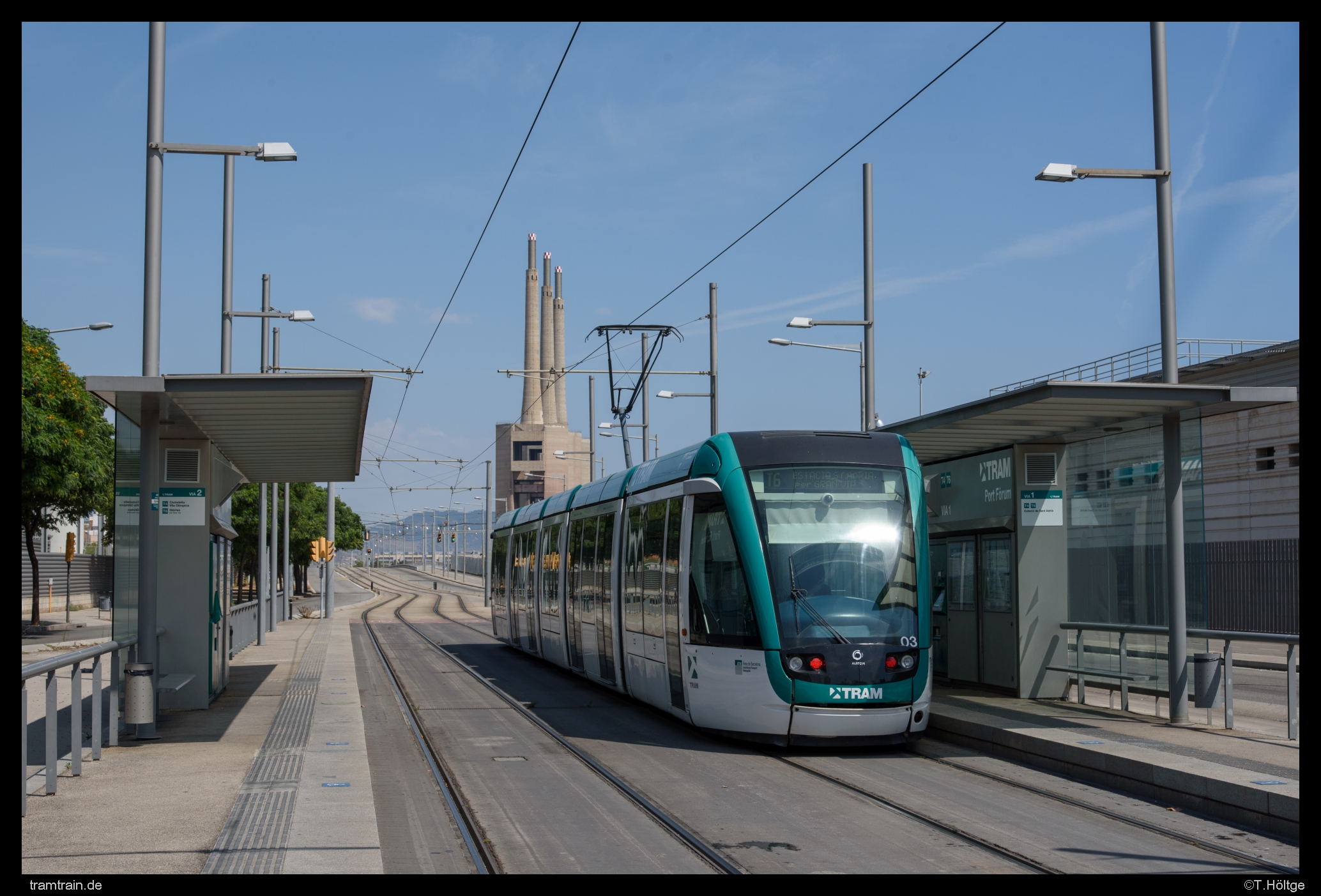 Die drei Kraftwerkstürme im Hintergrund sind von den zahlreichen Aussichtshügeln in Barcelona immer gut zu erkennen. Tw 03 steht in der Station “Port Fórum”.