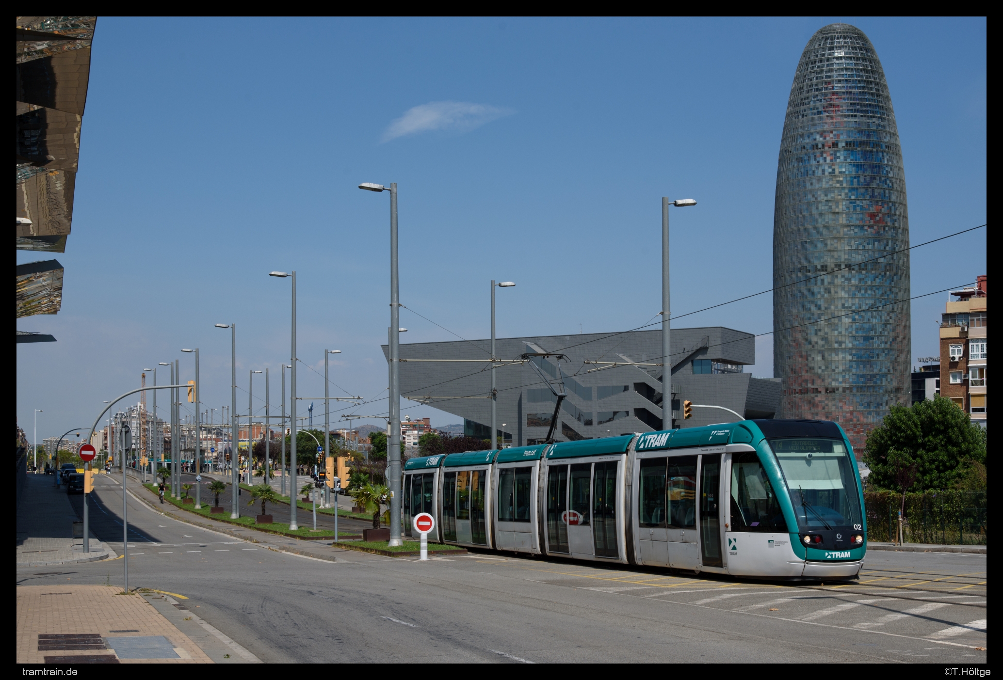 Wagen 02 auf der Avinguda Diagonal an der Haltestelle “Selva de Mar”. Über die 11 km lange Avinguda Diagonal sollten ursprünglich die beiden Netze verbunden werden.