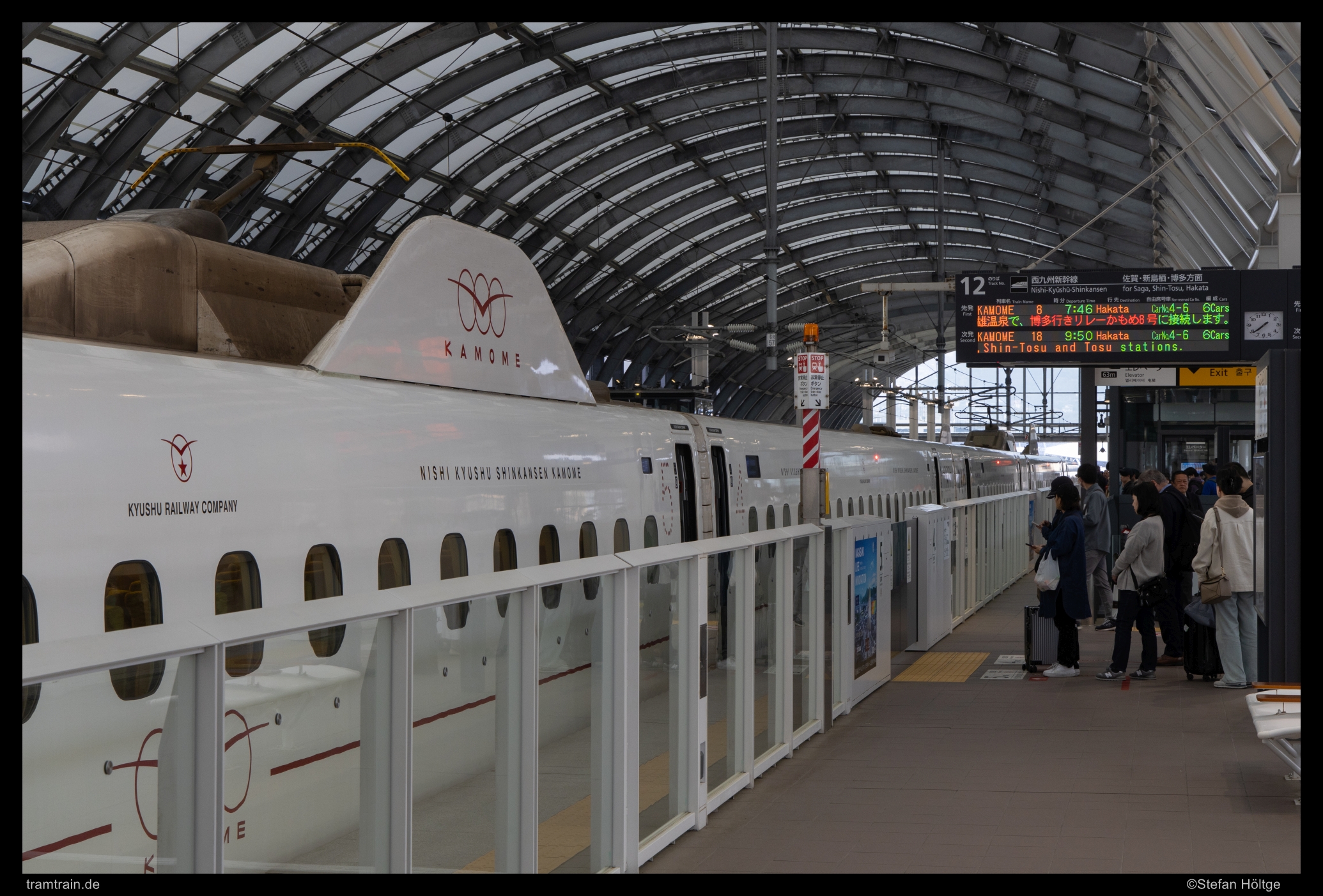 Der Plan für das Frühstück war denkbar einfach: Genau wie gestern drüben im Bahnhof was holen, nur das Zeug diesmal mit in den Zug nehmen und auf der kurzen Fahrt auf dem isolierten Nishi-Kyushu-Shinkansen verspeisen. Den ersten Teil so umgesetzt, standen wir dann wenig später – richtig – auf der Rolltreppe hinauf zu den Shinkansen-Plattformen. Für 7:46 Uhr war die nächste Abfahrt angeschrieben und der am Endbahnhof bereits wartende Zug öffnete schon wenige Minuten vorher die Türen. Das gab uns noch etwas mehr Zeit zum Frühstücken, denn die Fahrt selbst bis zum Transferbahnhof auf die Kapspur in Takeo-Onsen würde wieder nur eine halbe Stunde dauern.