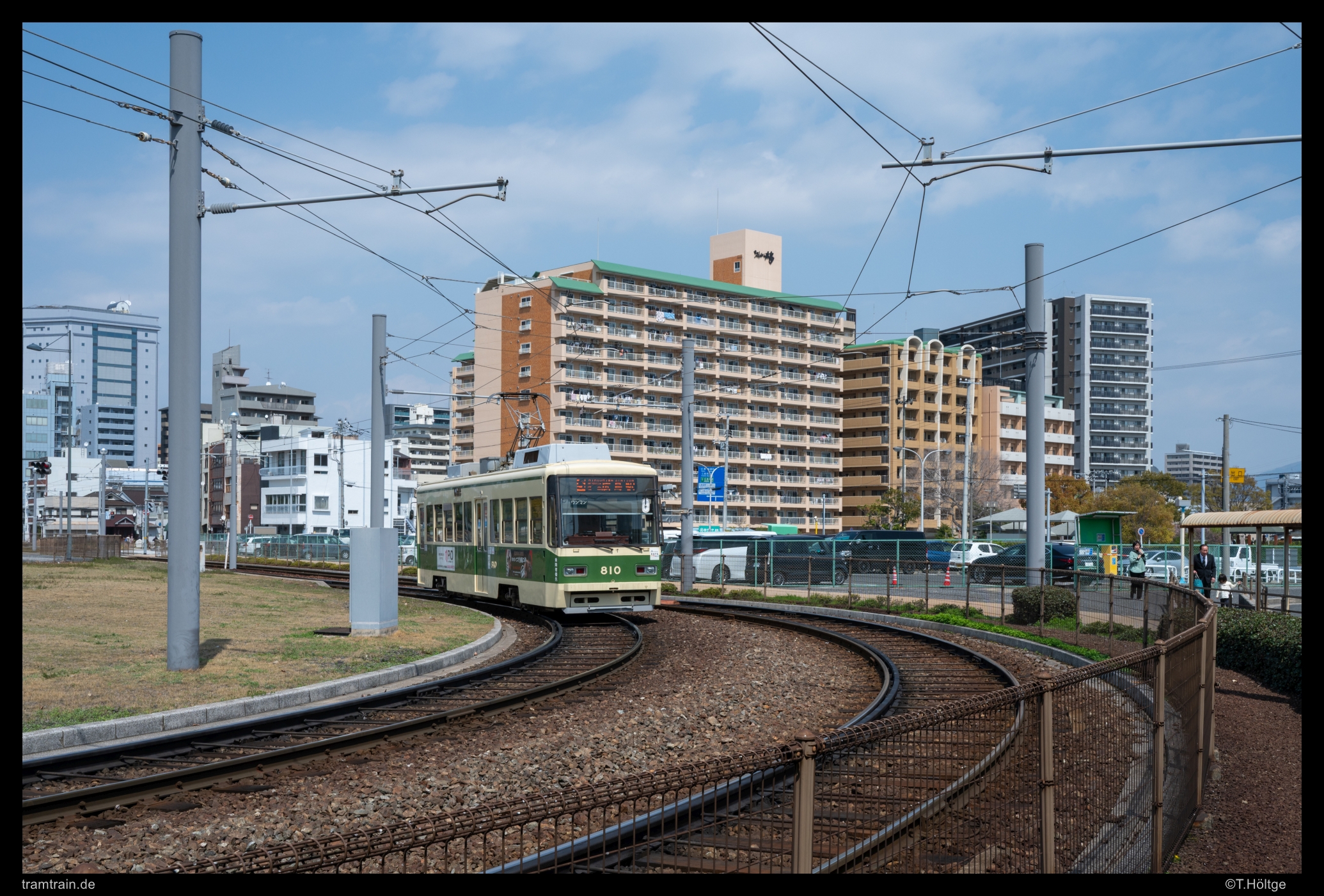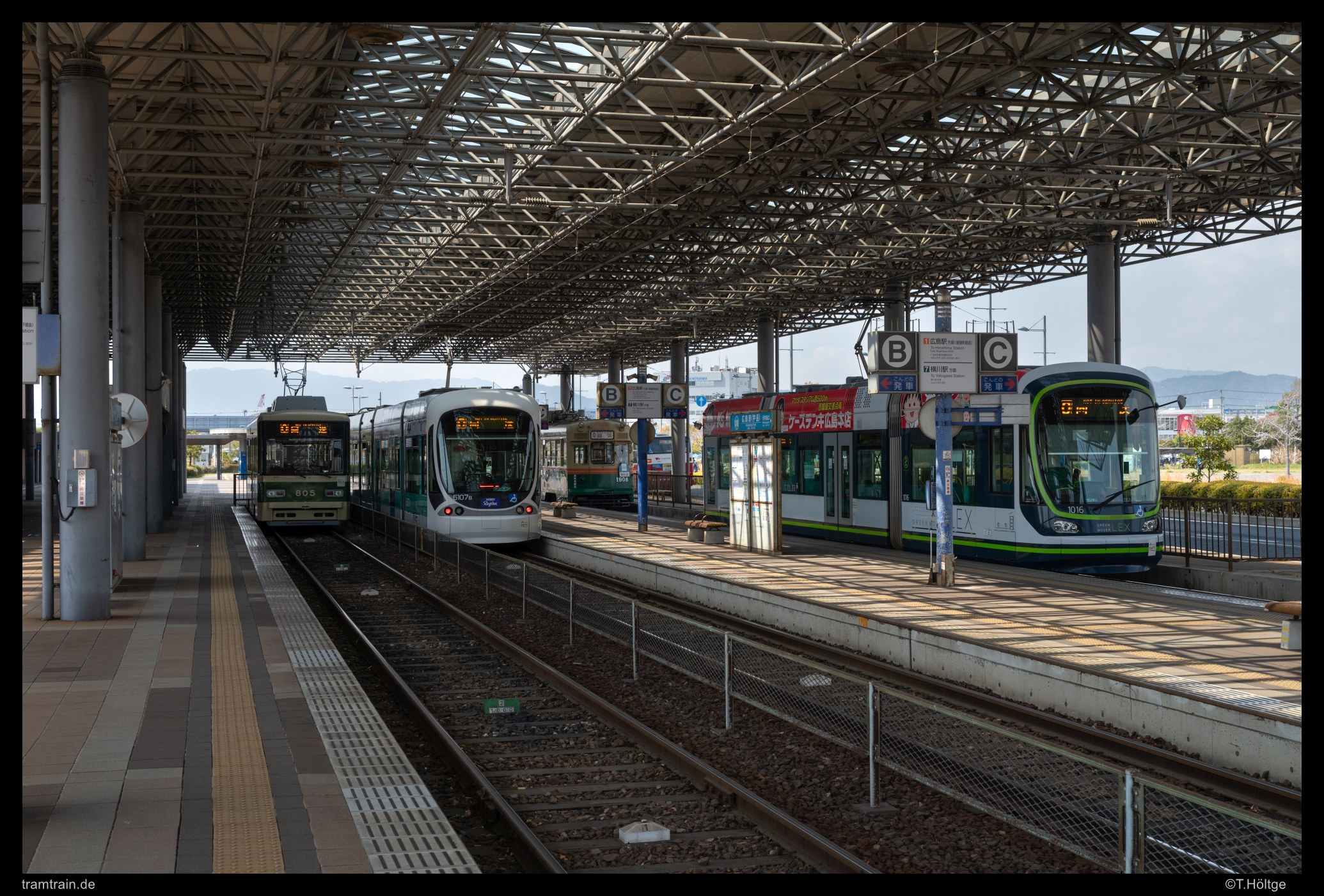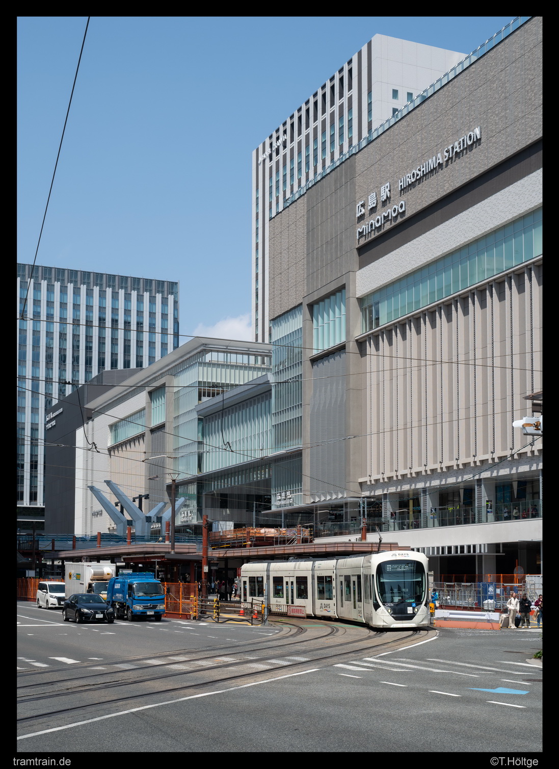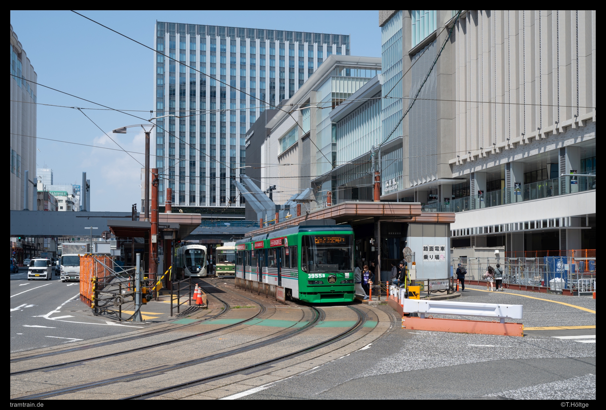 Die alte Endstationsanlage an der Hiroshima Station (M1). Hier herrscht ziemliches Gewusel. Im Haltestellenbereich liegt eine doppelter Gleiswechsel und dahinter schließen drei Abstellgleise für pausierende und wendende Wagen an, wobei nur zwei davon überhaupt lang genug für die Achtachser und fünfteiligen Multigelenker sind. Im Hintergrund links ist die bereits neue Straßenbahnbrücke für die neue Bahnhofsanbindung zu erkennen, die dann eine Ebene höher, quasi direkt in den Bahnhofskomplex hineinfährt. Die beengten Verhältnisse sollten sich dort deutlich verbessern und auch der Fußweg von den Bahnsteigen zur Straßenbahn vereinfacht sich ungemein. Für 2026 ist die Eröffnung geplant, die alte Strecke wird dann bis zum Dreieck Matoba-cho (M3/H3) eingestellt. Der GreenLiner 3955 nimmt hier gerade Fahrgäste für die Fahrt auf der Linie 2 auf.