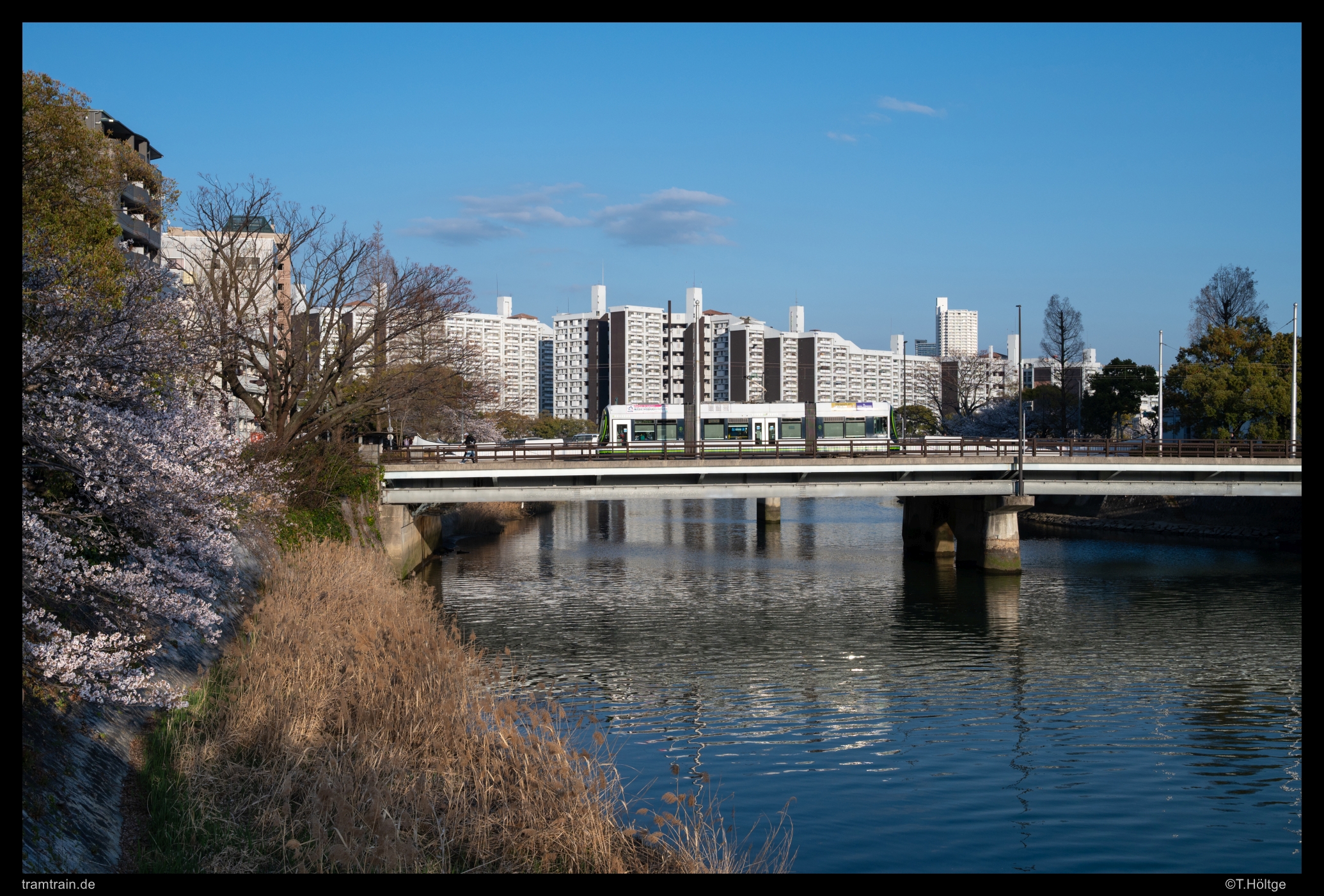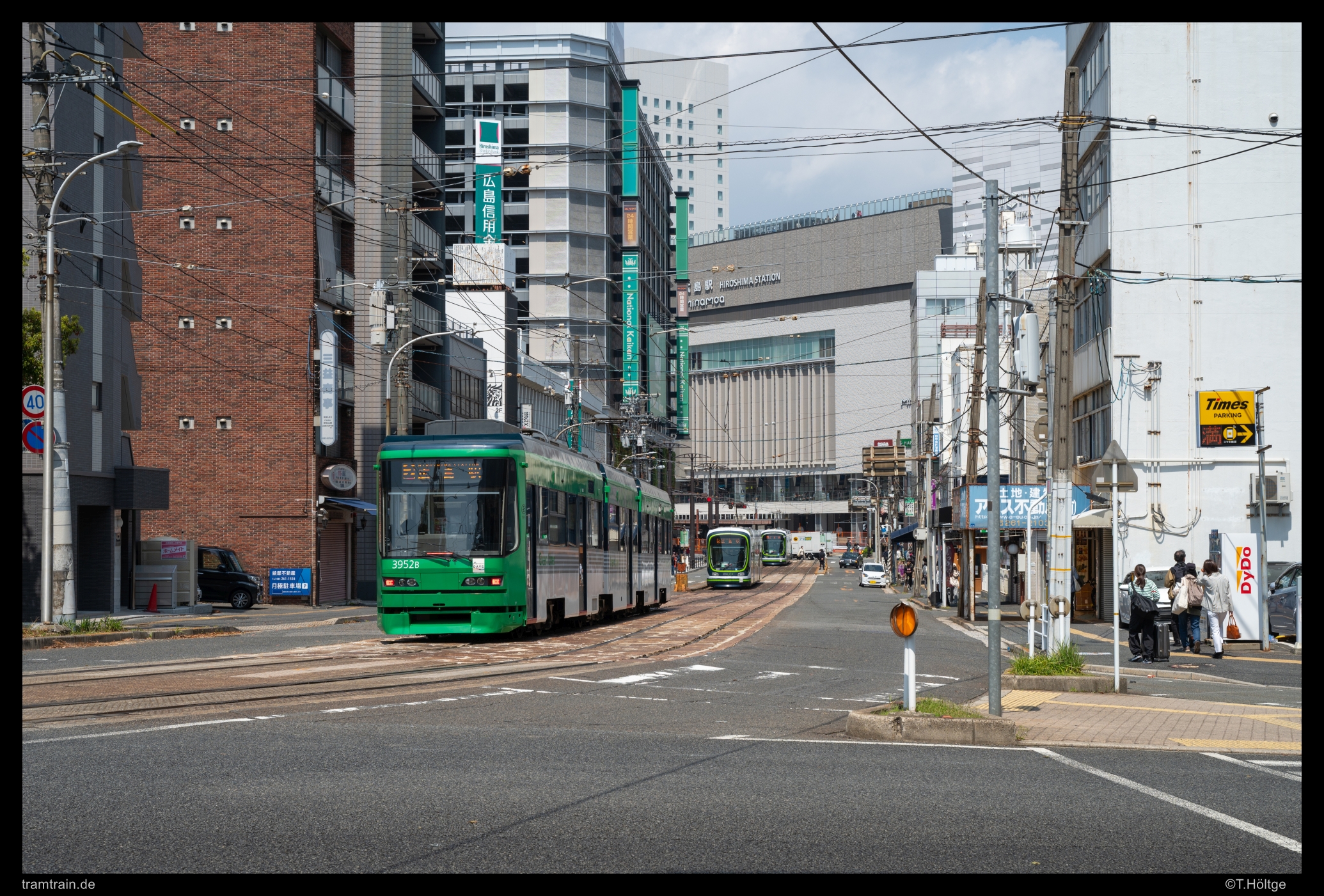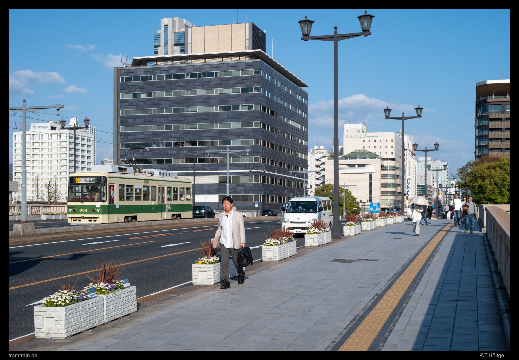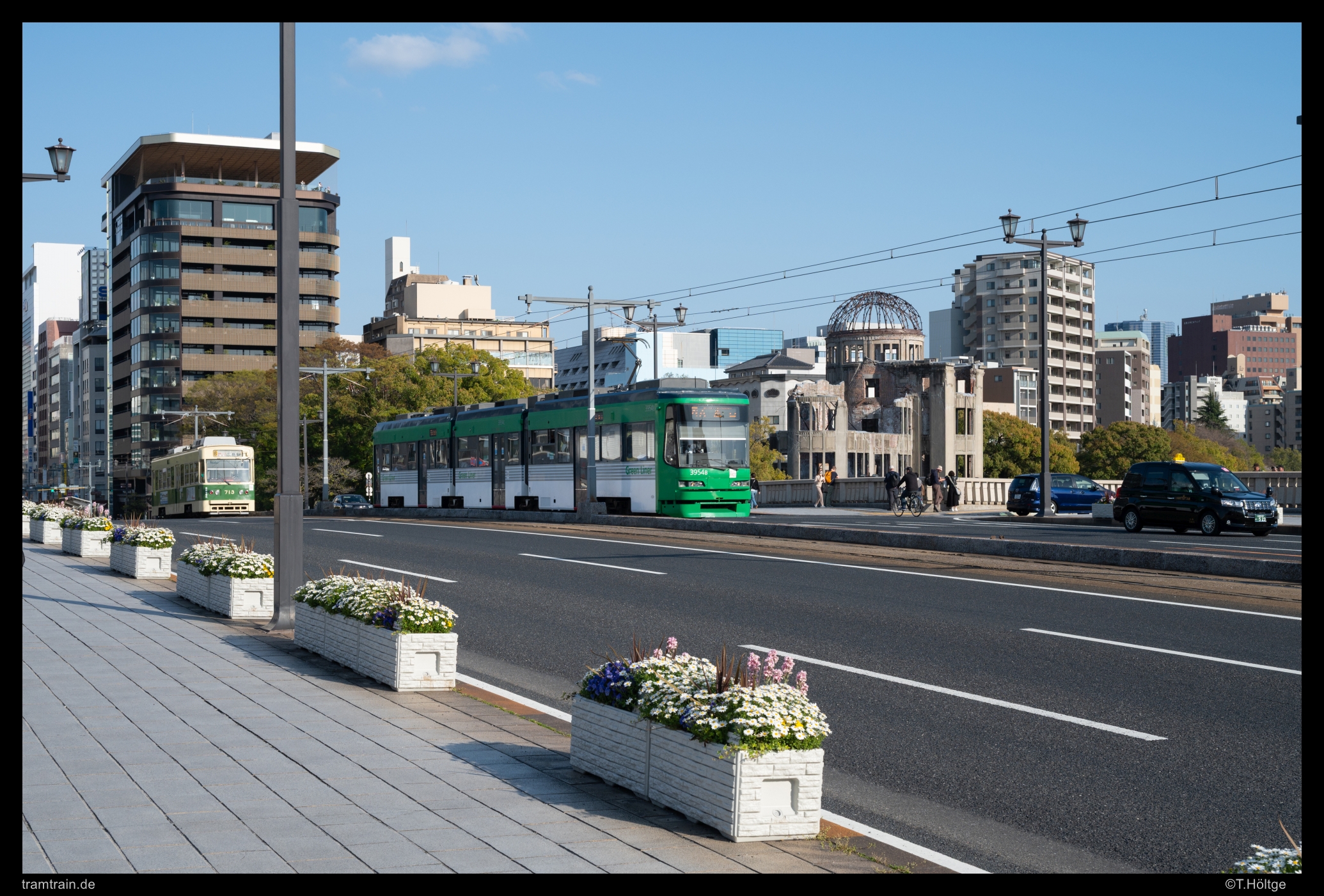 Ansonsten ist auf der Brücke auch bei der Straßenbahn viel los durch die zahlreichen Linien. Der Achtachser 3901 der Miyajima-Line begegnet hier vor der Haltestelle Genbaku Dome-Mae (M10) dem Wagen 703.