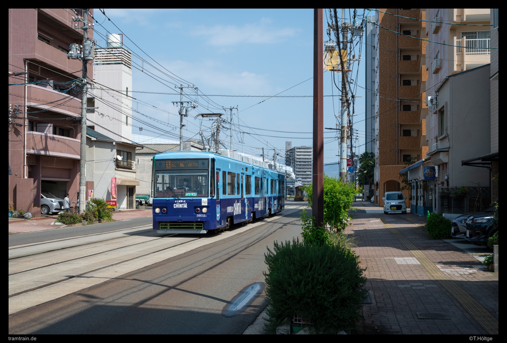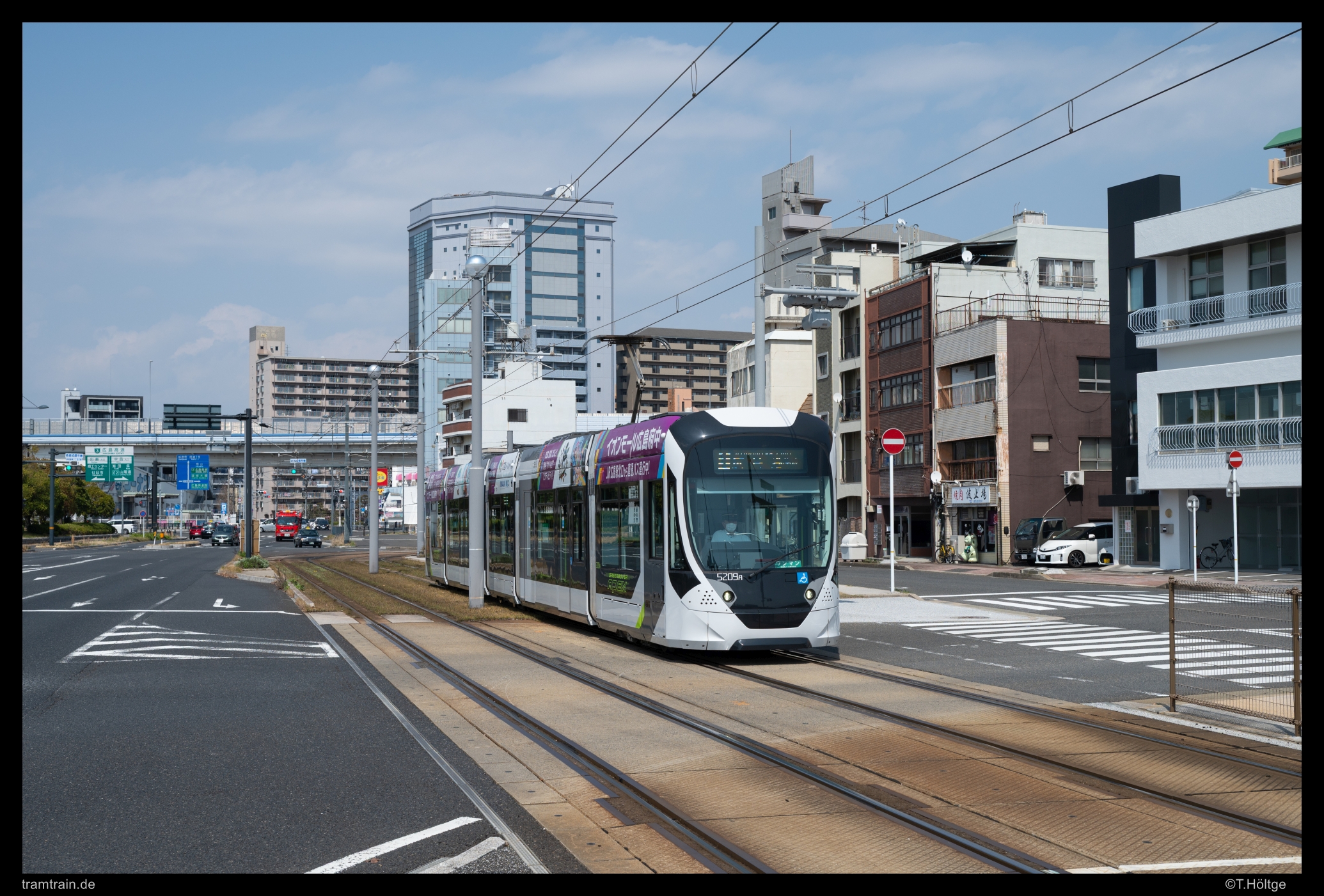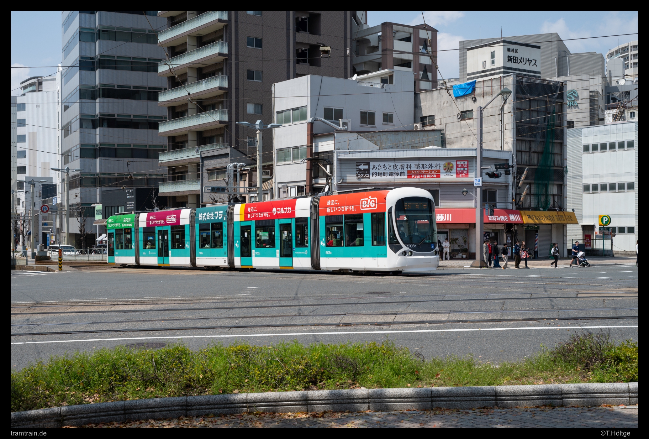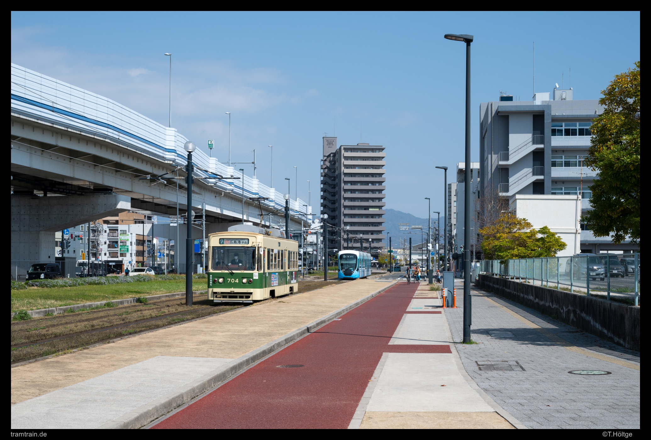Ebenfalls noch zur “Neubaustrecke” aus dem Jahr 2003 gehört der Abschnitt zwischen den Haltestellen Kaigan-dori (U16) und Motoujina-guchi (U17). Mit Grüngleis und großzügigem Radweg zeigt sich hier ein eher ungewöhnliches Bild. Wagen 704 gefolgt von Wagen 5208 erreichen gleich die Haltestelle Motoujina-guchi (U17).