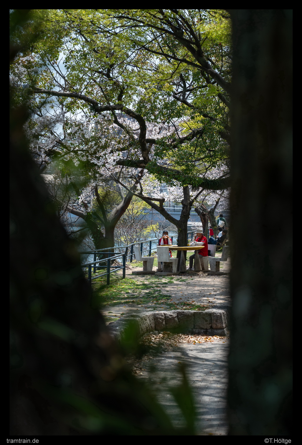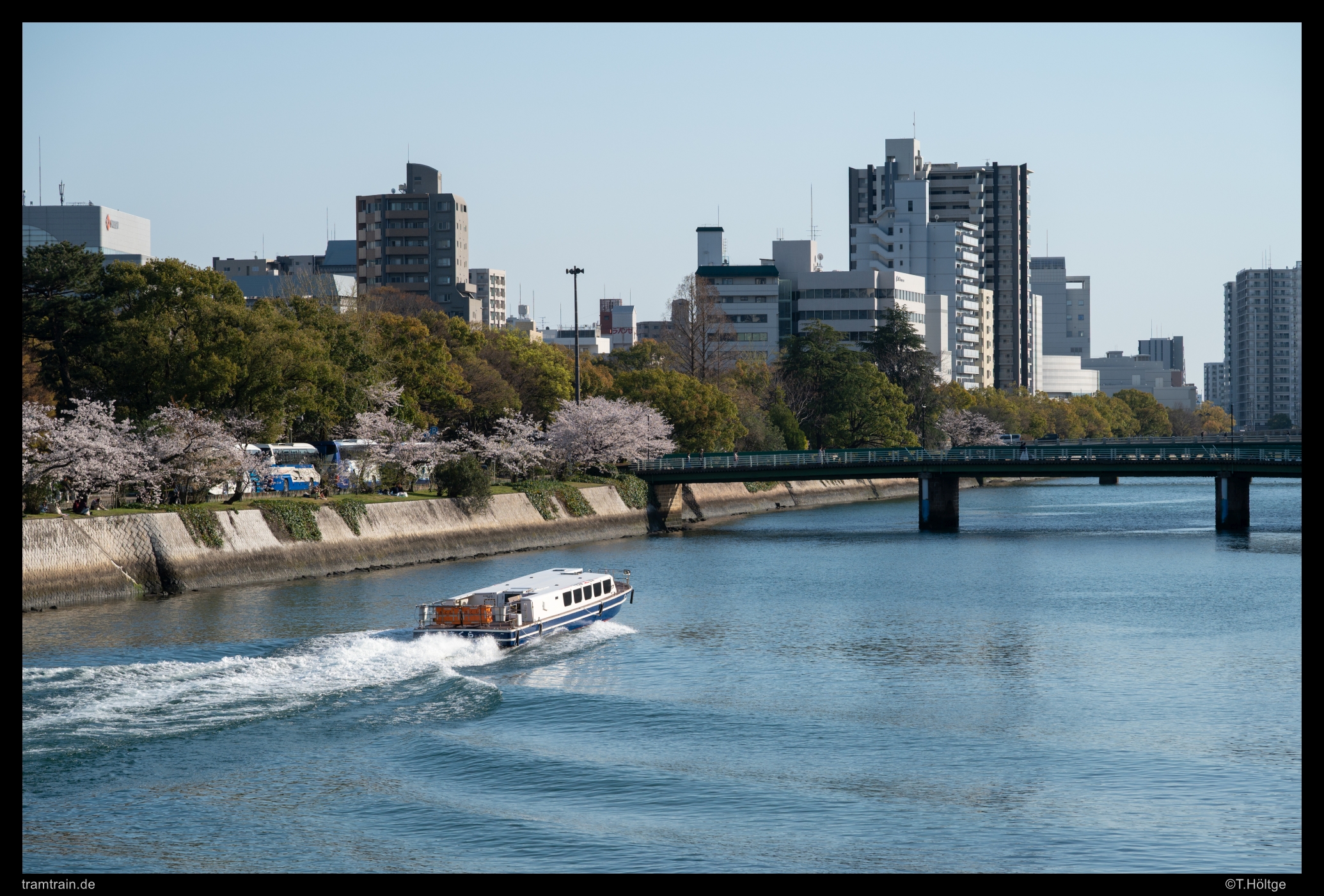 Auf dem Weg zum Hotel ein Blick von der Enko-Brücke. Die Kirschblüte scheint in Hiroshima gerade in voller Pracht zu stehen. Hinten trennen sich Enko und Kyobashi River, die südlich von Hiroshima wieder in die gleiche Bucht münden. Eines der Gebäude hinter der Brücke muss unser Hotel sein.