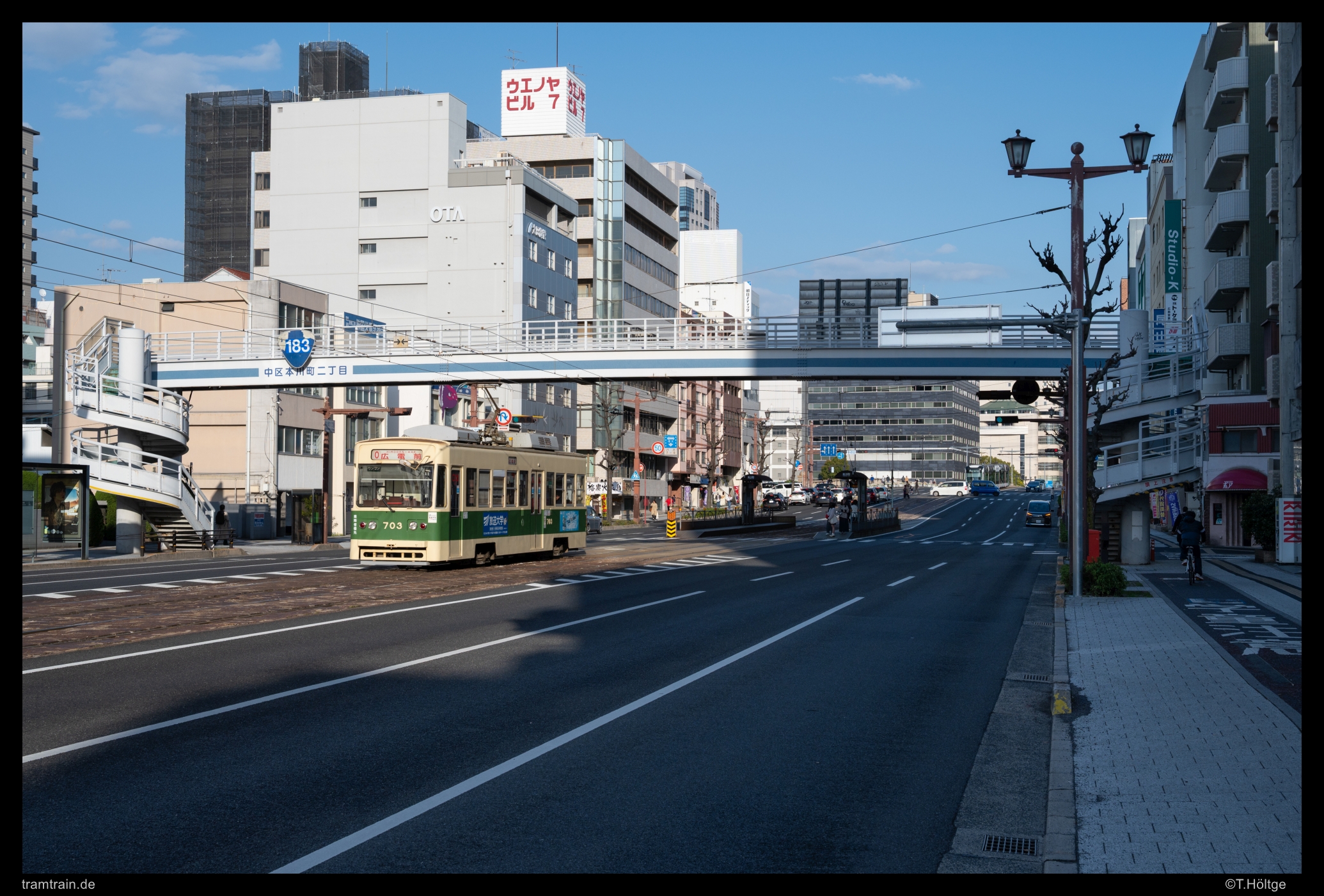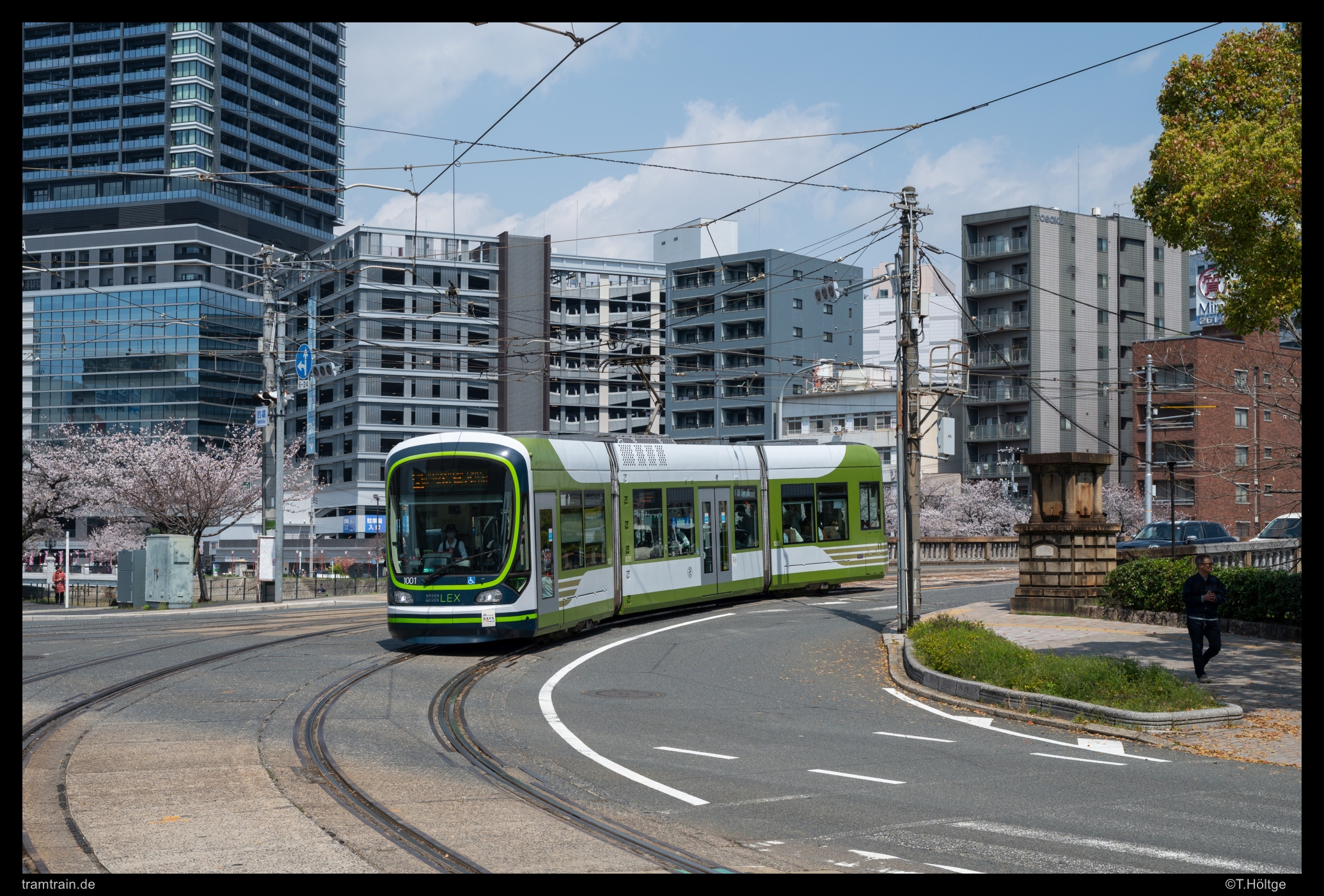 Wagen 703 kommt aus Nishi-Hiroshima zurück und rückt nun als Linie 0 in den Betriebshof Senda ein, hier kurz vor der Haltestelle Honkawacho (M11). Es scheint also auch am Sonntagnachmittag einige Verstärker zu geben. Die Brücke hier mit zwei symmetrischen Wendeln auf beiden Seiten ist auch mal ein schönes Modell. Irgendwie habe ich es in den Tagen verpasst, da mal hoch zu klettern.