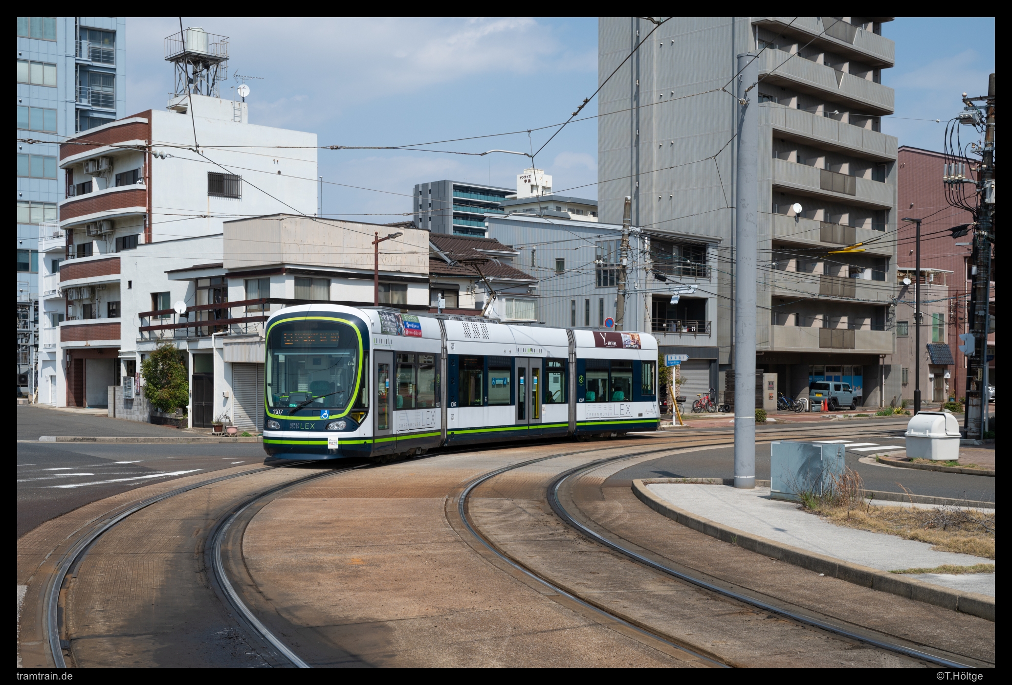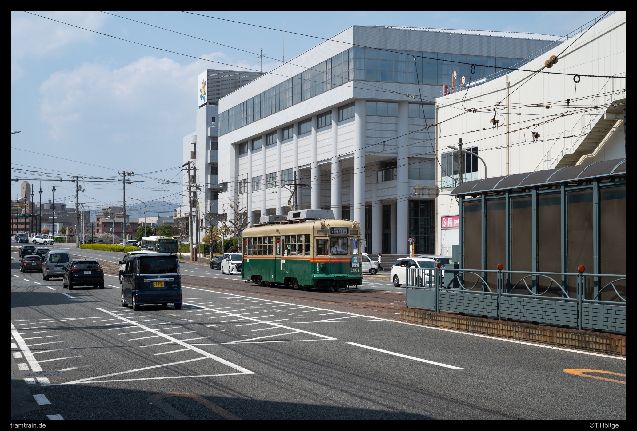 Auch hier war es schon wieder ein elendiges Geschleiche: Mit dem 5207 von der letzten Aufnahme hielten wir bis zur Haltestelle Enkobashi-cho (M2) an der nächsten Ecke locker Schritt und konnten eine weitere Aufnahme machen. Ich zeige aber an dieser Stelle lieber den Stau, der sich in Gegenrichtung gebildet hatte, da einerseits die Endstationsanlage schnell vollläuft, andererseits auch die Haltezeiten an der Haltestelle und der Kreuzung davor schon wieder so lang sind, dass mehrere Wagen auflaufen. Der GreenLiner 3952 auf der Linie 2 folgt hier zwei der kleinen GreenMover Lex auf den Stadtlinien.
