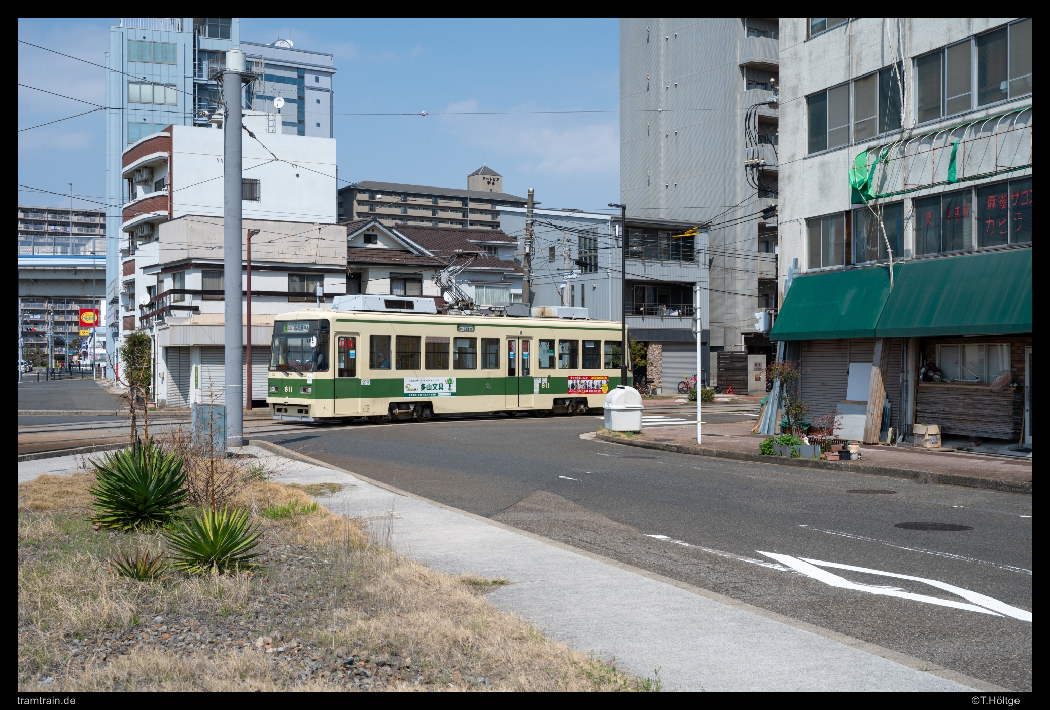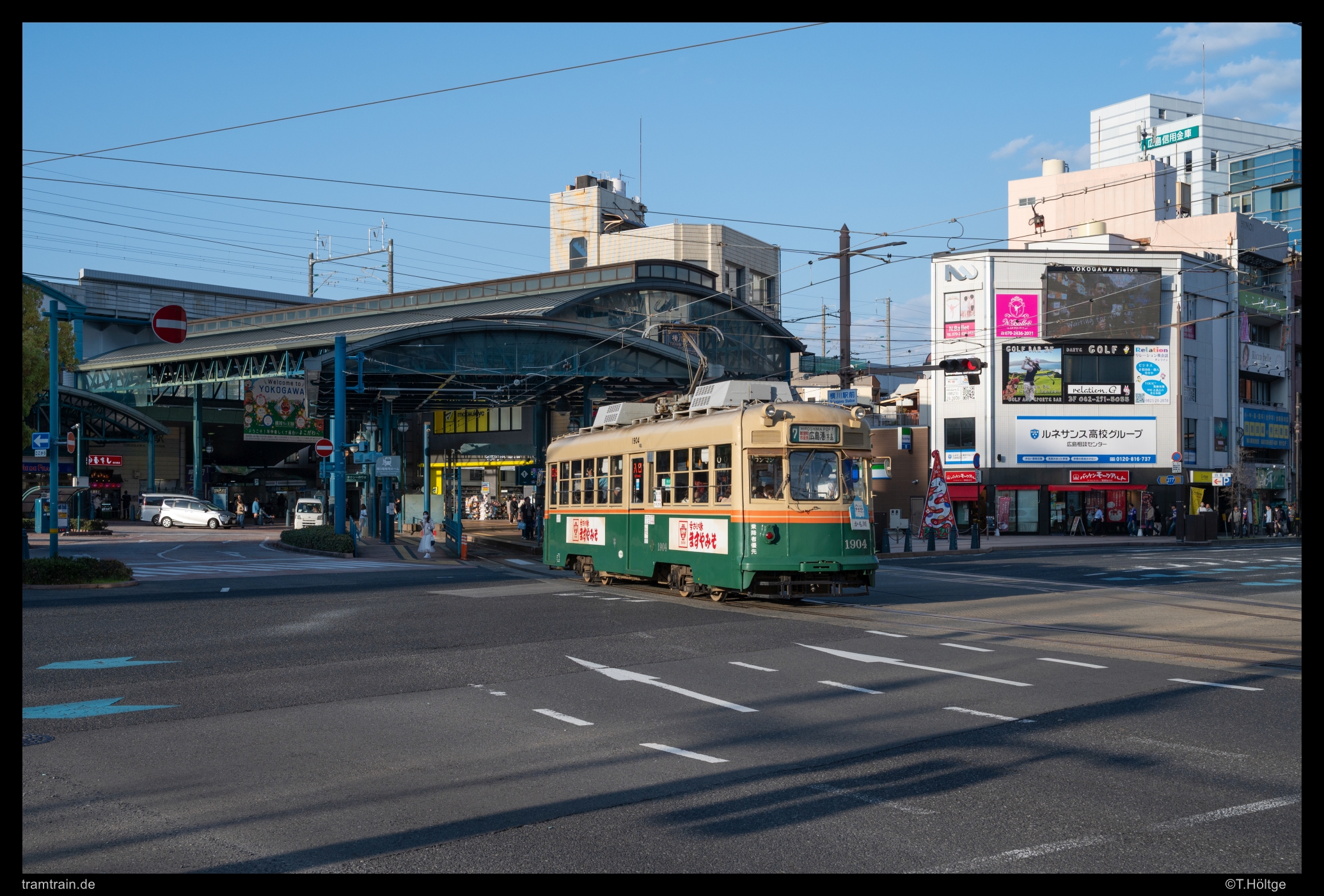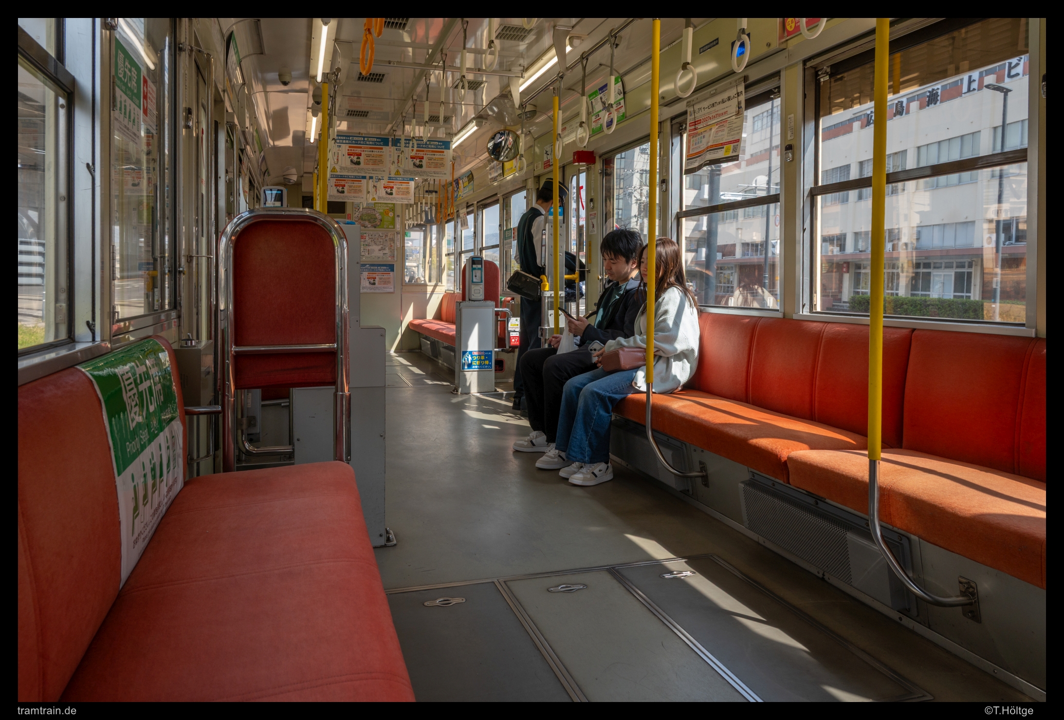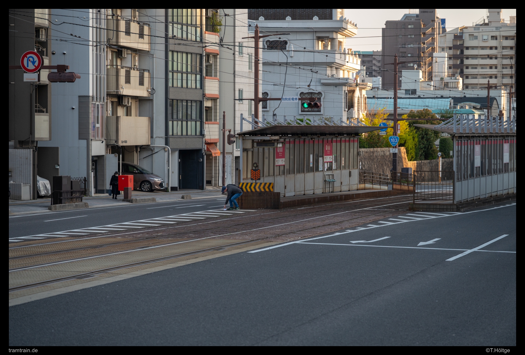 Mit dem nächsten Wagen sollte es dann zurück in die Innenstadt gehen. Und wieder so ein “Don’t Rush”-Moment: Wir stehen vom letzten Bild noch auf der anderen Seite der Kreuzung, müssen also, um zur Haltestelle zu gelangen, einmal die Längs-, einmal die Querphase der Ampel nehmen. Allein schon: Wozu hat es hier eine Fußgängerampel an dieser T-Kreuzung von zwei völlig unbedeutenden Quartiersstraßen? Hinten fährt der nächste Wagen Richtung Stadt um die Ecke. Weit und breit kein Auto in Sicht. Die gefühlt zweiminütige Phase der Ampel plätschert dahin, während uns von der Haltestelle nur wenige Meter trennen. Einfach rübergehen? Nein, das ist ja ein absolutes Unding hier in Japan. Also auf das Schneckenrennen eingelassen und kurz überlegt: Eigentlich konnte es der Wagen gar nicht mehr vor uns wegschaffen, denn mit unserer nächsten Grünphase würde er es beim hiesigen Tempo unmöglich schaffen, zu halten und wieder abzulegen. Konnte man also ganz entspannt auf grün warten, die Straße längs queren, zuschauen, wie der Wagen an der Haltestelle die Grünphase verpasst und dann mit der ebenso ewigen, kreuzenden Grünphase zur Haltestelle schlendern und gemütlich einsteigen. Wahrscheinlich wäre man zu Fuß in Fahrtrichtung auch an der nächsten Haltestelle noch rechtzeitig angekommen 😀