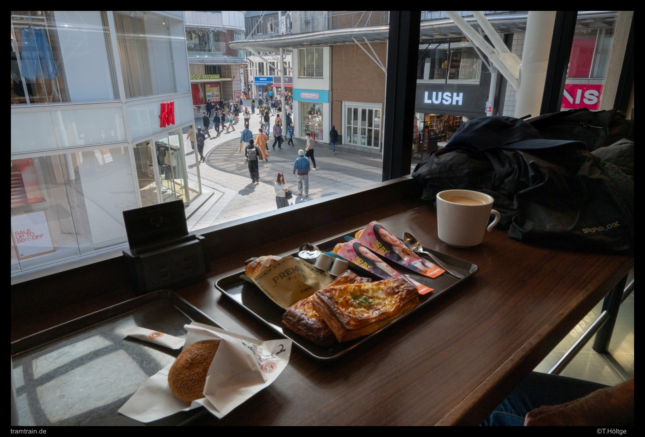 Kaffee, Schokocroissant und Kartoffel-Blätterteig-Stückchen. Das sollte reichen, um es durch die restlichen Sonnenstunden des Tages zu bringen. Auch dabei (im Vordergrund): Eine süßliches Teigstückchen mit zu einer Pampe verarbeiteten Black-Beans drinnen. Schmeckte irgendwie ganz seltsam. Nicht richtig einzuordnende Geschmacksnote. Mein Ding sollte es nicht werden. Ich dachte eigentlich, es sei mit Curry gefüllt 😀