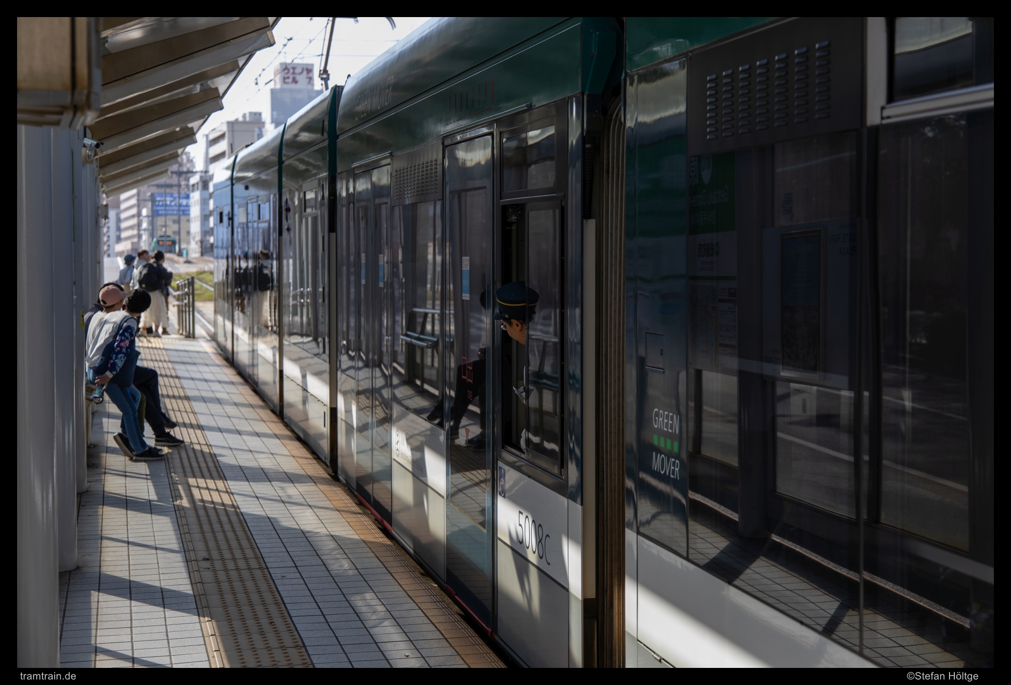 Wir liefen zunächst mal zurück zum Bahnhof, denn noch waren wir nicht im Besitz von Tageskarte. Meist kann einem dort geholfen werden. Wir erwischten allerdings zunächst eine Touristen-Info, die uns nichts verkaufen konnte, aber irgendwo hinschickte. Uns kam das wenig hilfreich vor und so suchten wir in dem Baustellengewirr des Bahnhofes den Ausgang zu Straßenbahn auf Ebene null. Das war schon zielführender. Zwar gab es hier physisch auch nichts zu erwerben, aber den wie immer zahlreichen Info-Tafeln war zu entnehmen, dass das Ganze hier wohl ausschließlich digital läuft mit den Tageskarten. Vorteil: Es wären dafür erstmals 24h-Karten. Nachteil: Man musste sich doch tatsächlich registrieren, anstatt einfach mit VISA zu zahlen und fertig. Das dauerte jetzt zwar einige Minuten, beim zweiten Versuch akzeptierte das System dann aber doch eine meiner VISA-Karten. Interessanterweise läuft das Ganze nicht über eine App, sondern eine klassische, browserbasierte Webanwendung. Möglicherweise gibt es auch eine japanische App, aber die Webanwendung sprach englisch, das sollte genügen. Dort konnte man nach Anmeldung dann seine Fahrkarte starten und abrufen, woraufhin auf dem validierten Ticket eine Straßenbahn begann hin und her zu fahren. Zumindest in der Theorie – wir kommen noch darauf zurück…
