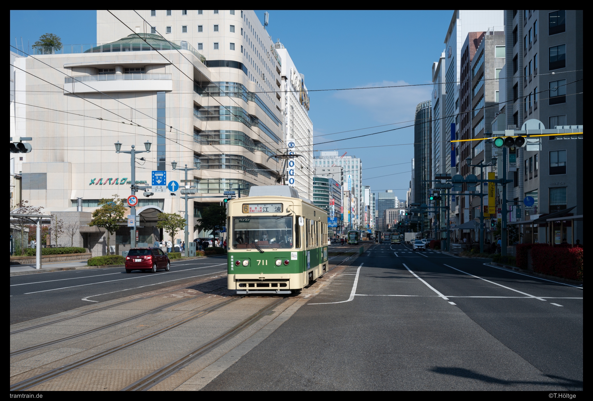 Der umgekehrte Blick von der Haltestelle Genbaku Dome-Mae (M10) auf den einfahrenden Wagen 711 der Linie 6 nach Eba.