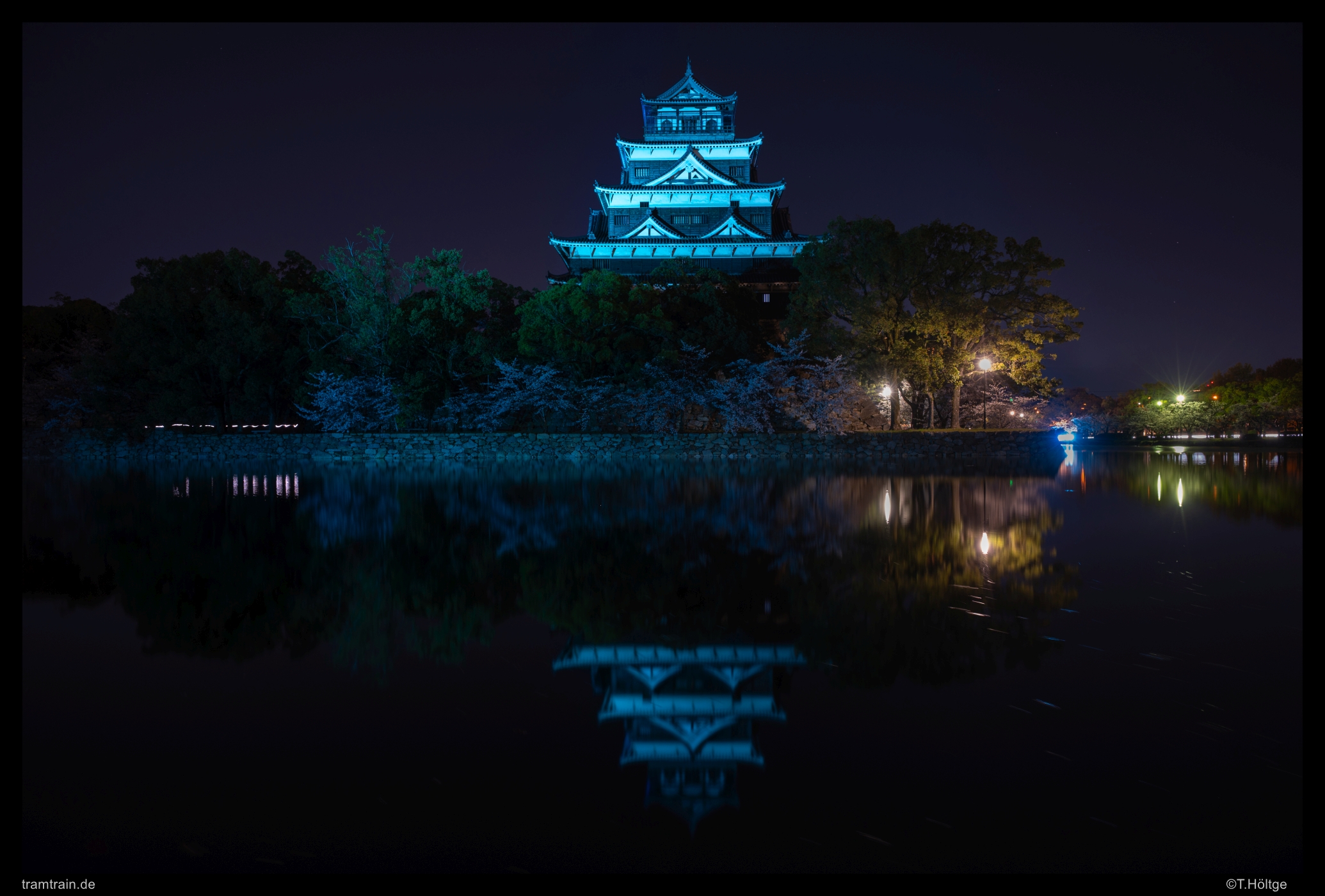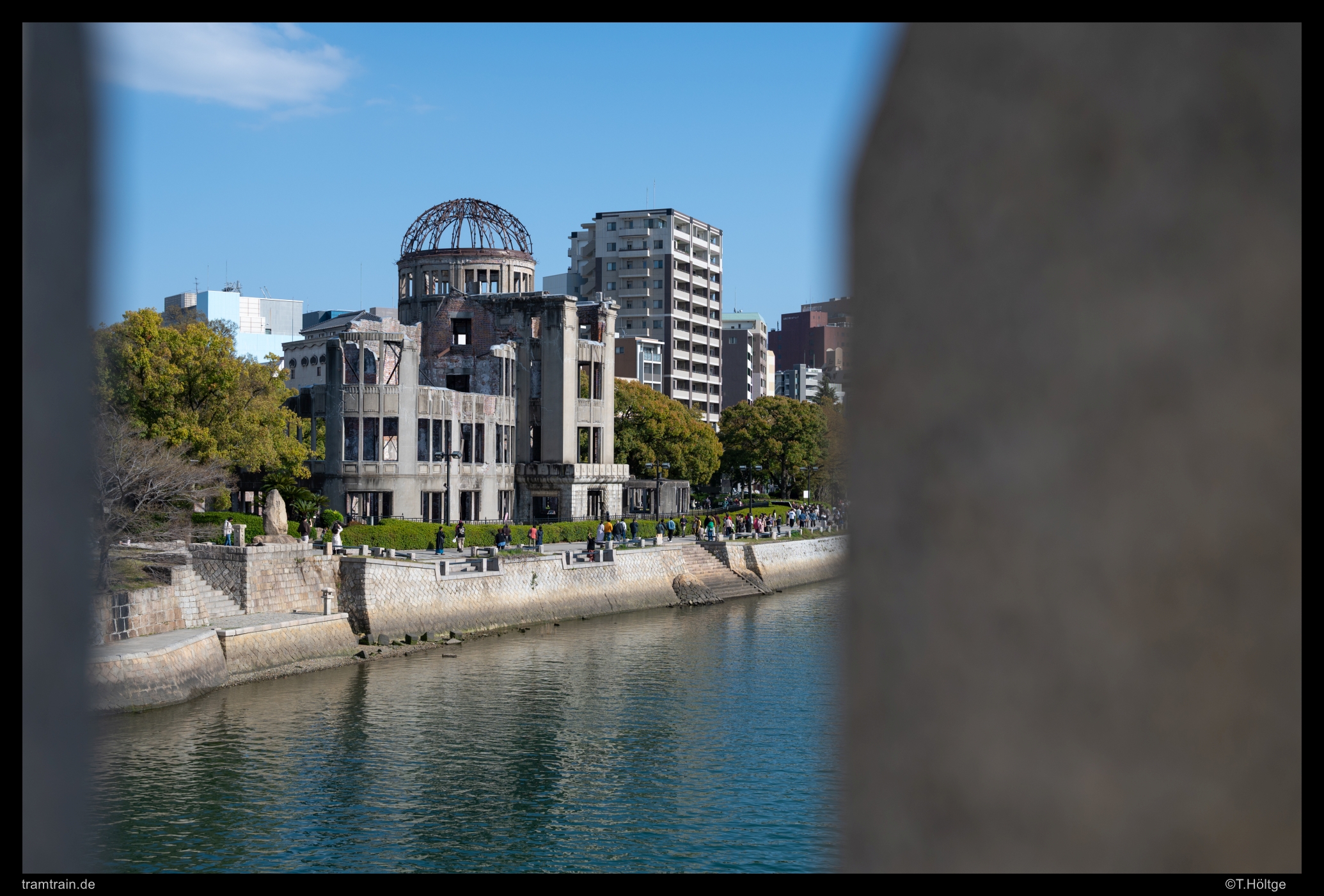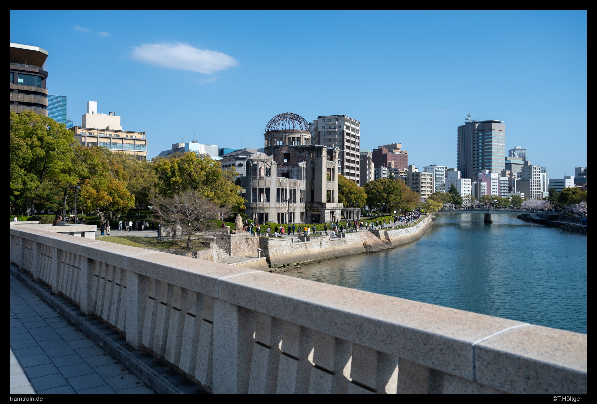 Auf der Aioi-Bridge lassen sich zwar Straßenbahn und Atomic Bomb Dome zusammen ins Bild bringen, allerdings steht die Sonne nie richtig. Am ehesten noch jetzt am späten Nachmittag. Vielleicht reicht es an den längsten Tagen des Jahres aus. Ein etwas höherer Standpunkt wäre auch nicht schlecht. So reicht es mit 3954 zwar für eine dokumentarische Aufnahme, aber fotografisch ist Luft nach oben. Jetzt im Nachhinein habe ich überlegt, ob vielleicht die blaue Stunde auch einen Versuch wert gewesen wäre.