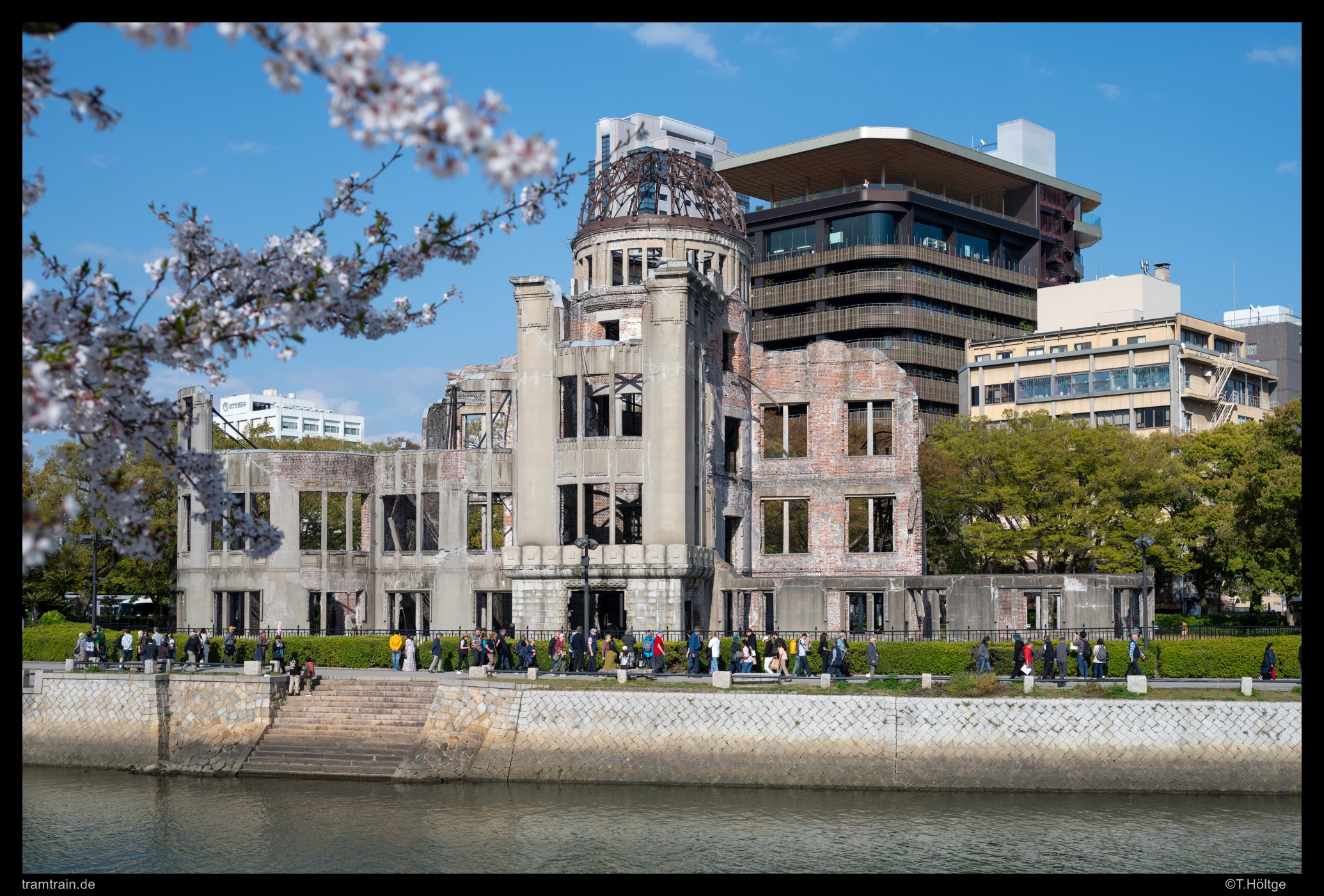 Die Brücke war das genaue Ziel der am 6. August 1945 abgeworfenen, ersten kriegerisch eingesetzten Atombombe der Geschichte. Allerdings wurde die Brücke um rund 250m verfehlt und bei der Explosion nicht zerstört. Und so unglaublich es klingt, rollten schon nach kurzer Zeit wieder die Straßenbahnen über die Brücke, durch eine ansonsten apokalyptische Szenerie fast vollständiger Zerstörung. Heute ist nurmehr der Atomic Bomb Dome, die stehengebliebenen Grundmauern der 1915 gebaute Prefectural Industrial Promotion Hall, anschaulicher Zeuge des Zerstörungsausmaßes. Wie bei der Aioi-bashi Bridge, sorgte die steinerne Bauweise für das Überstehen von Druckwelle und Feuersturm. Der Großteil der Häuser in Hiroshima bestand in dieser Zeit aus Holz und Papier und wurde in der Innenstadt entweder schon durch die Druckwelle dem Erdboden gleich gemacht, oder verbrannte im folgenden Feuersturm zu unkenntlichen Überresten. Insgesamt kamen rund 70.000 bis 80.000 Menschen im Bereich der Innenstadt direkt ums Leben, bis 1946 stieg die Opferzahl auf geschätzt bis zu 160.000 Menschen. Man kommt hier durch den Atomic Bomb Dome und den Friedenspark kaum umhin, sich Gedanken über die damaligen Ereignisse zu machen. Durch den 80. Jahrestag der beiden Atombombenabwürfe in diesem Jahr, gibt es derzeit viele eindrückliche Dokumentationen zu den Ereignissen. Zwei Verweise möchte ich dabei auf die beiden aktuell bei arte verfügbaren Dokus setzen: