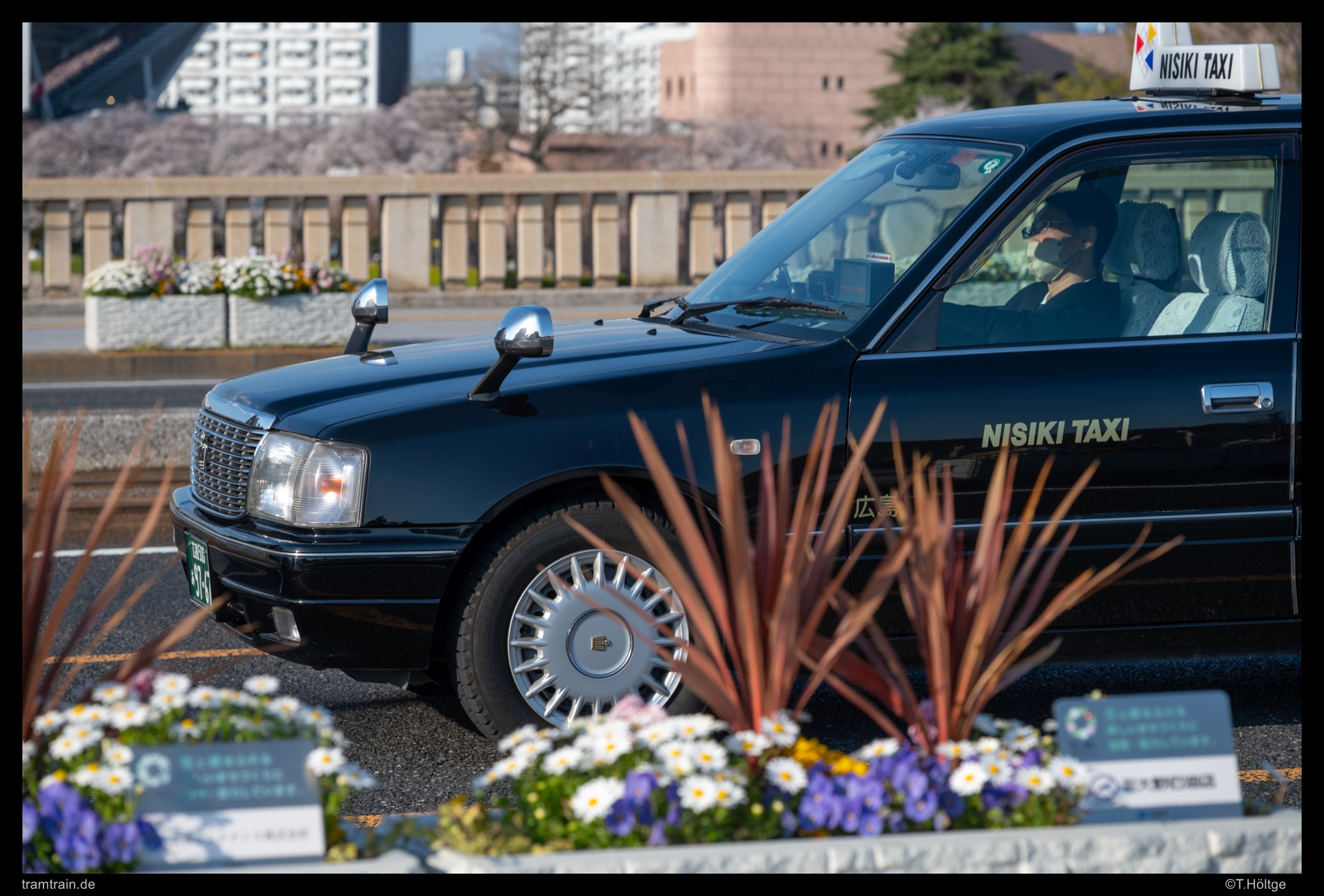 Diese seltsamen Spiegel an den Toyota Comfort und Crown Taxis ließen mir keine Ruhe. Hier am edleren Crown sind die Spiegel, wie der Kühlergrill, sogar in Chrom gehalten.