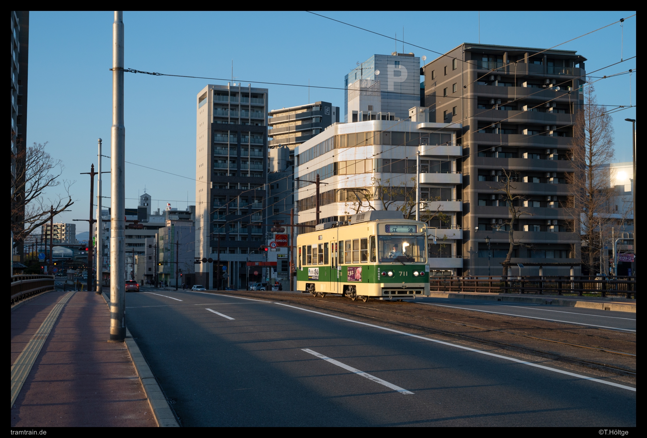 Die letzten Sonnenstrahlen erreichen derweil noch immer die Yokogawa Shinbashi Bridge und beleuchten den Wagen 711 fast schon von unten.