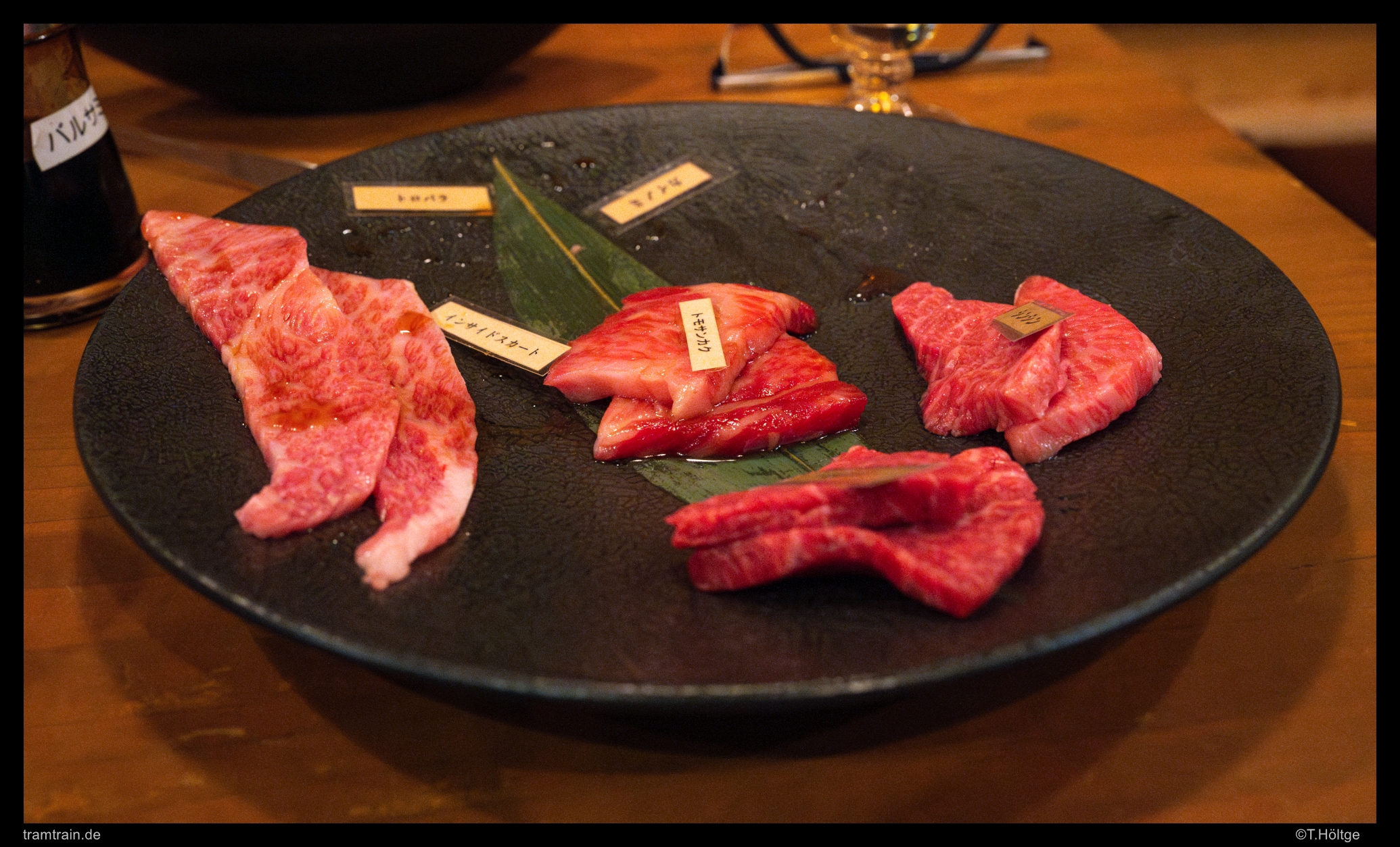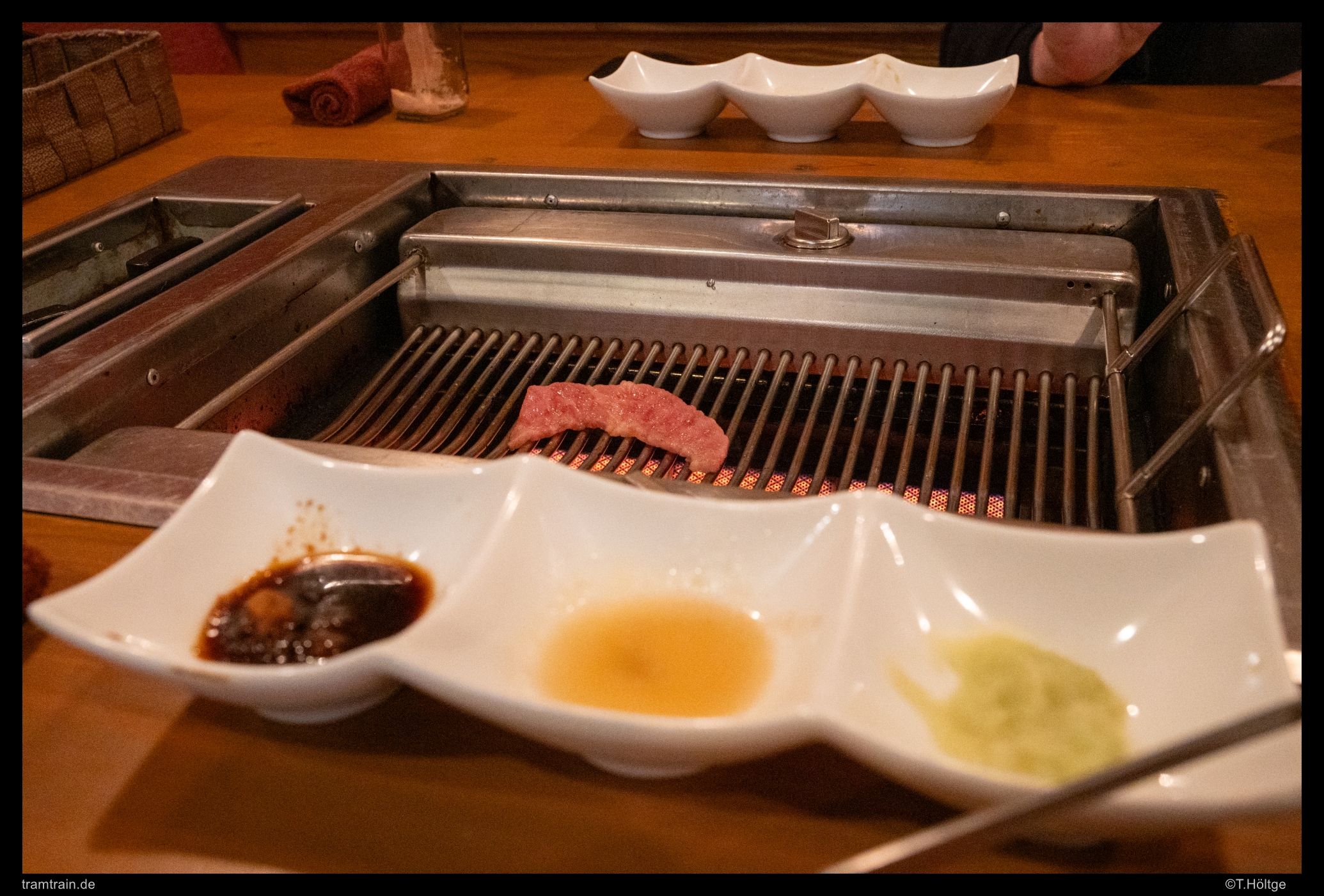 Von dem Passagensystem der Shōtengai lohnt es sich meist ein wenig in die kleinen Nebenstraßen abzubiegen. Dort finden sich meist noch zahlreiche kleine Lokale. So schlenderten wir etwas durch die Gegend und natürlich gab es an jeder Ecke wieder Ramen, gebackenes Hühnchen auf Reis und unzählige Variationen von Meeresgetier. Unser Interesse weckte aber in einer der Nebenstraßen ein im Souterrain gelegenes kleines Restaurant. Dort befanden sich kleine, eingelassene Gasgrills in den Tischen, auf denen man sich scheinbar selbst was grillieren konnte. Wir hatten Lust, das einfach mal auszuprobieren und fragten mal, ob es noch ein Plätzchen für uns gäbe. Gab es und so fanden wir uns wenig später mit einer Karte, von der wir, obwohl auf Englisch, nicht viel verstanden, an einem der Grilltische wieder. Uns war nicht ganz klar, wie das hier funktionierte, also fragten wir einfach mal die wie üblich zuvorkommende Bedienung, was man denn so bestellen sollte. Wir bestellten dann einfach eine Platte “zum Ausprobieren” mit verschiedensten Leckereien vom Rind. Dazu paar Kartoffelecken und ein Gezapftes.