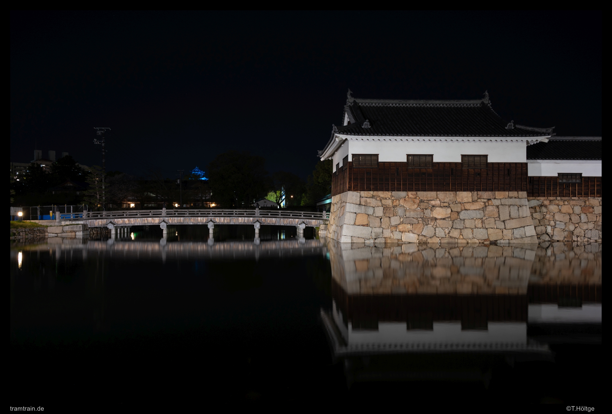 Der Tenshu, der große Hauptturm der Burg, steht ganz außen auf der nordwestlichen Ecke der Insel. So lässt er sich wunderbar über das Wasser hinweg inszenieren.