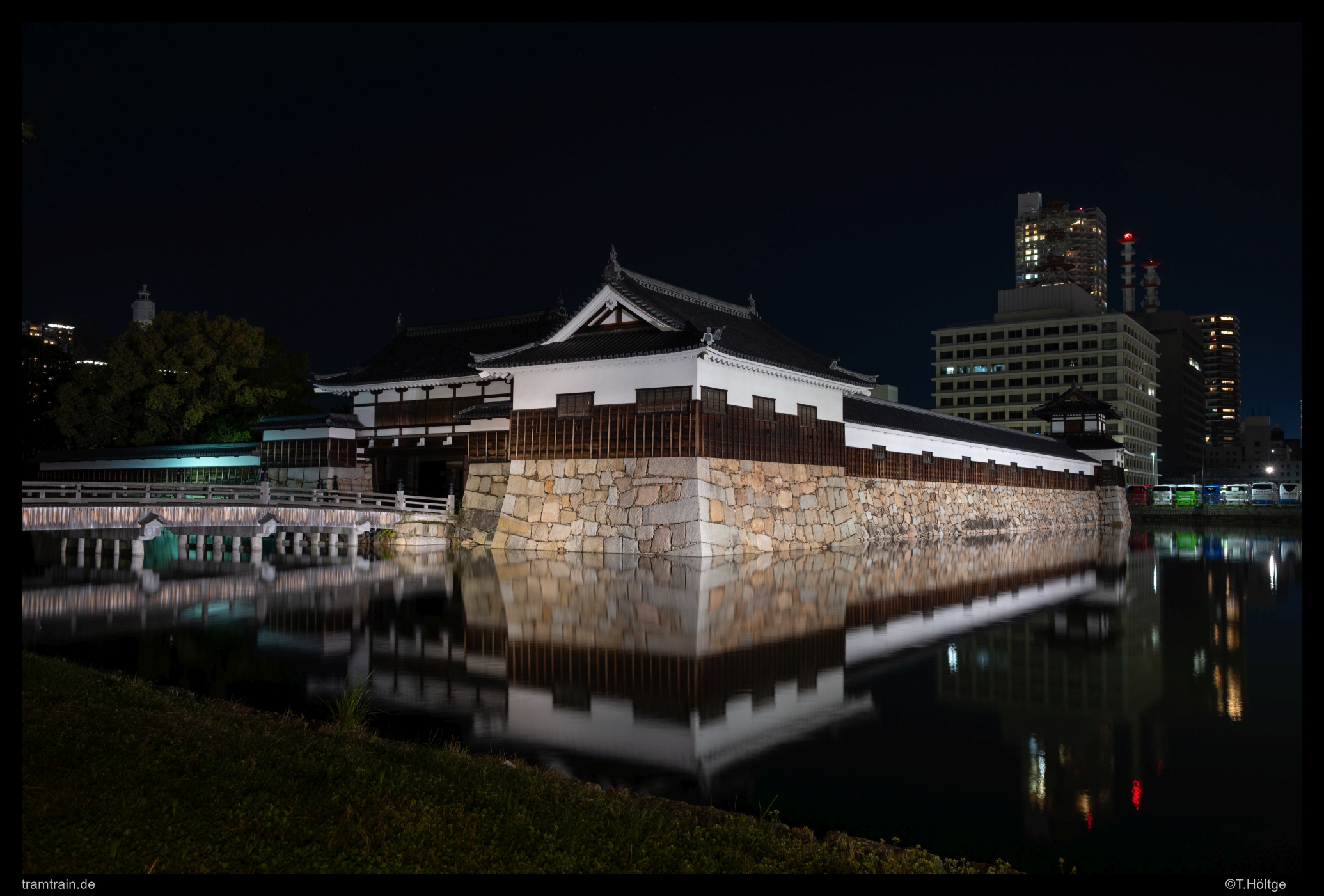 Das Castle selbst erreichten wir von der Seite des Main Gates, dass quasi eine kleine Zwischeninsel vor der von einem großen Wassergraben umgebenen Burg bildet. Das Castle diente während der letzten Kriegsmonate als Kommandozentrale und wurde durch die Explosion der Atombombe fast vollständig zerstört. Was man heute sieht, ist daher weitgehend wiederaufgebaut, der Hauptturm heute eine verkleidete Beton-Rekonstruktion aus dem Jahr 1958. Ursprünglich reicht die Geschichte des Hiroshima Castle bis in die 1590er zurück.