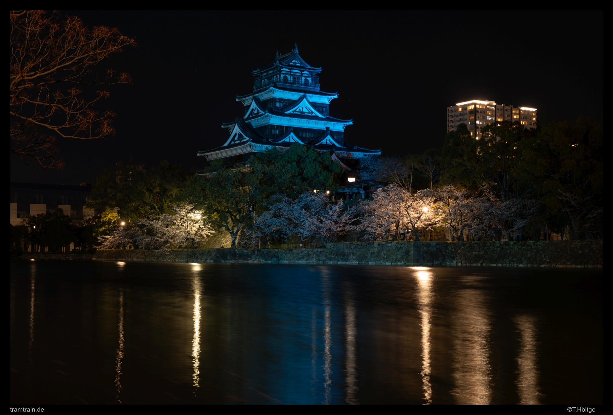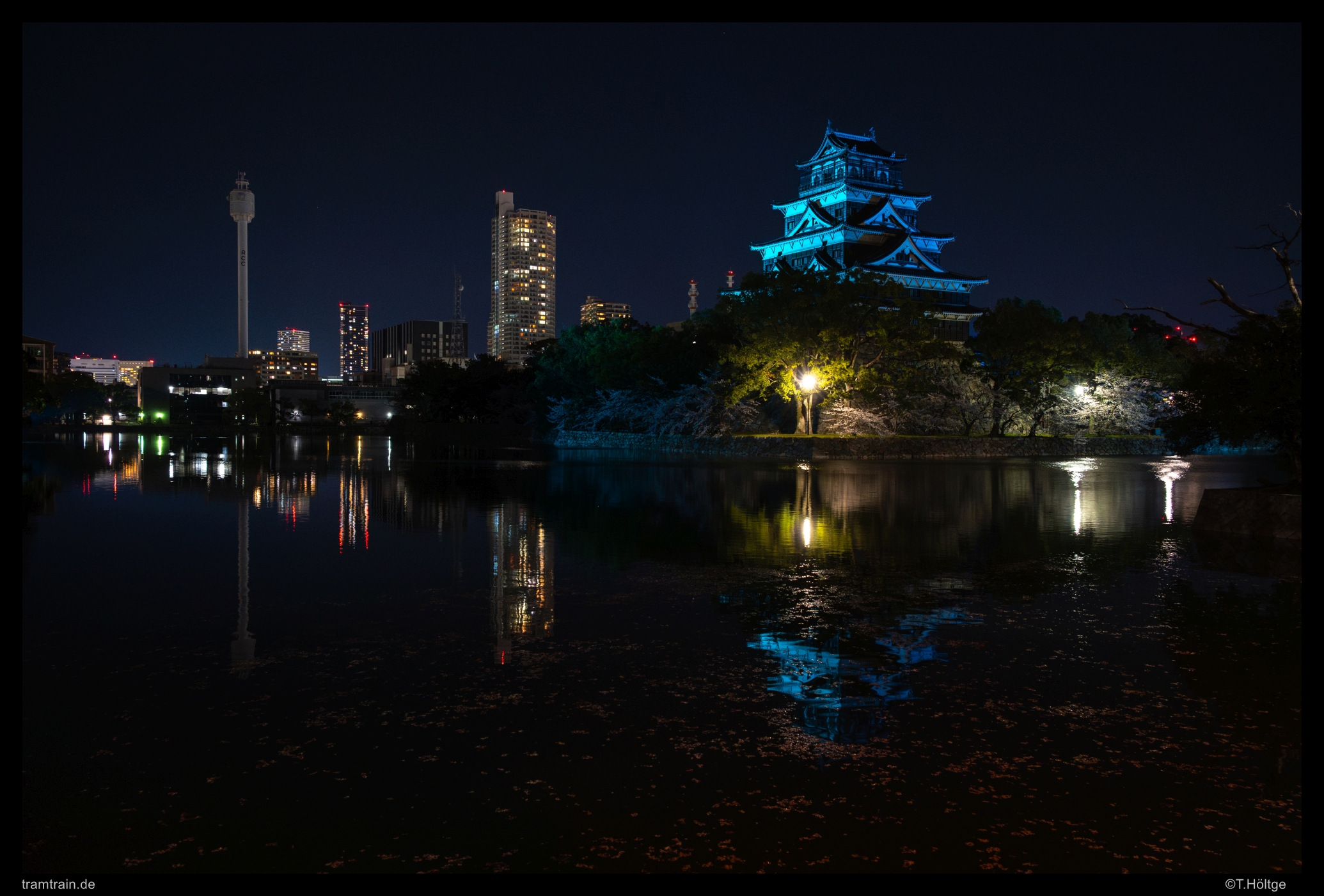 Rundherum ragen die Hochhäuser von Hiroshima in den Nachthimmel.