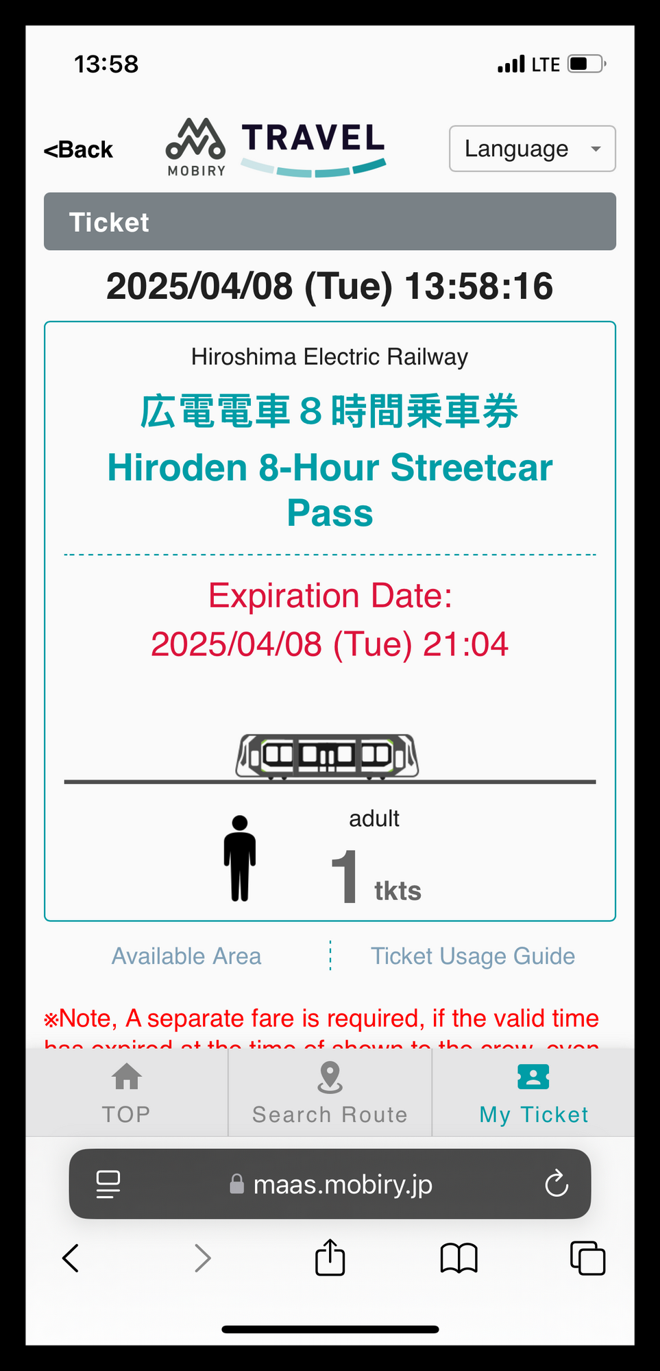 Das Ticket aus der Webanwendung: Hier mein für 8h nachgelöstes Ticket für die letzten Stunden des dritten Tages. Vorher kam ich mit zwei 24h-Tickets recht weit. Die kleine Straßenbahn sauste bei mir auch brav hin und her. In der Version, die zusätzlich die Fähre nach Miyajima beinhaltet, schwimmt dann auch noch ein kleines Schiffchen hinterher.