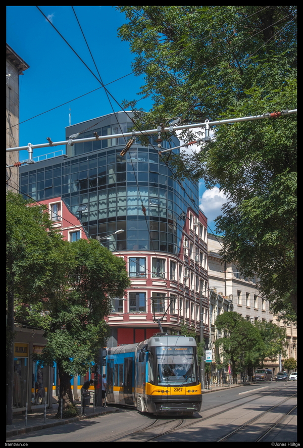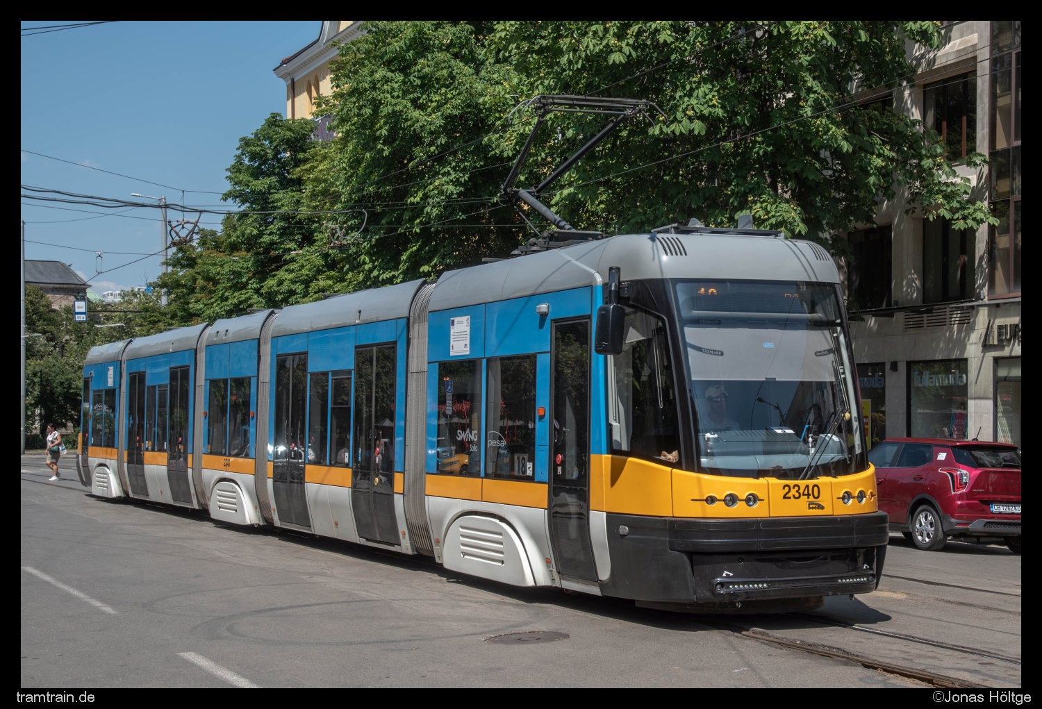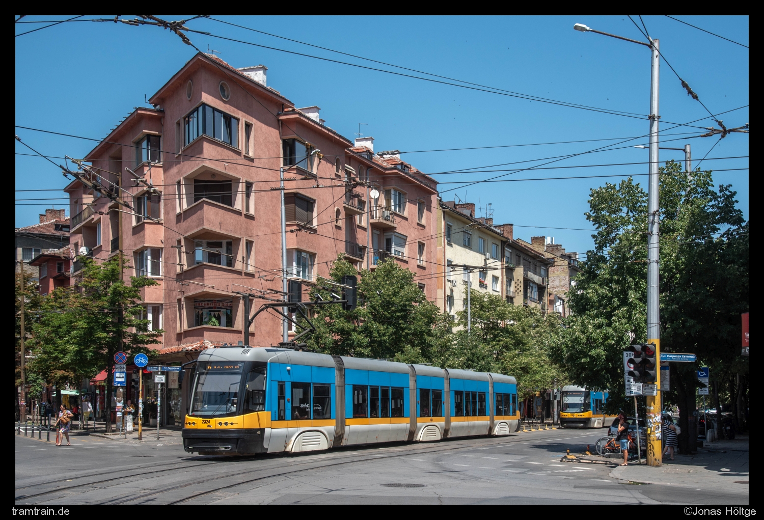 Das erste Straßenbahnbild in Sofia sollte an meiner “Haushaltestelle” entstehen. Knapp fünf Minuten Gehzeit entfernt von meinem Hotel befand sich die Haltestelle Bul. Praga, an der gleich mit der 1, 6, 7 und 27 gleich vier Linien verkehrten. Ein wenig beschäftigt hatte ich mich mit dem Einsatzgebiet der Fahrzeuge im Vorhinein schon. Ganz genau wusste ich jedoch nicht, was mich jetzt hier auf den vier Linien erwarten sollte. Daher schoss ich das erstbeste Bild mit Pesa 2324, der gerade die große Kreuzung überquerte, um im Folgenden in die Haltestelle einzufahren.