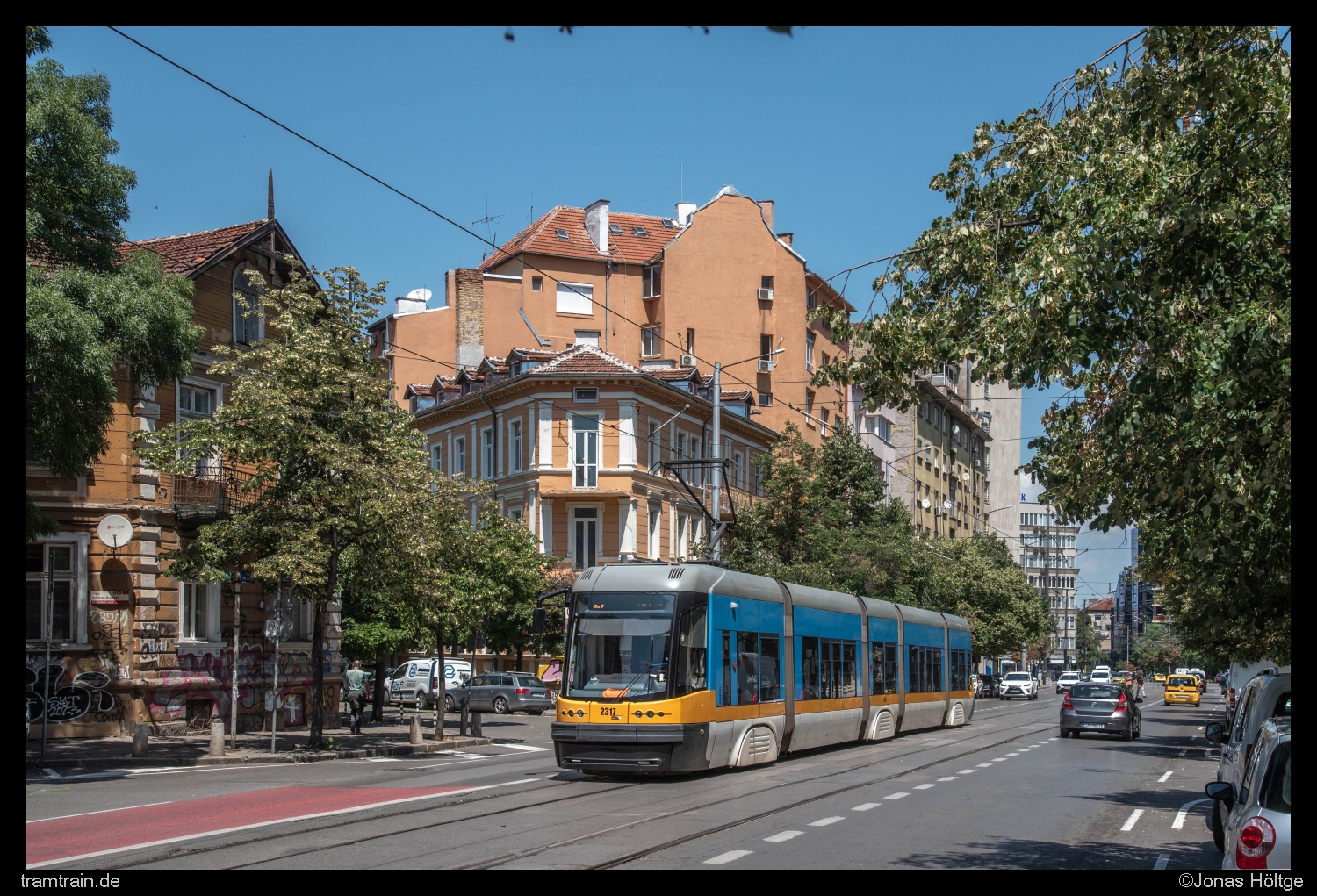 Direkt neben dem angesprochenen Laden ergab sich eine schöne Kulisse auf der anderen Straßenseite. Mit dem passend auf der Linie 27 kommenden Pesa 2317 entstand daraus das zweite Bild des Tages. Dass ich hier eine Menge Glück mit einer Autolücke gehabt hatte, wurde mir erst zu einem späteren Zeitpunkt bewusst. Schon an dieser Stelle konnte ich feststellen, dass es beim Straßenbahnbetrieb von Sofia nicht unüblich war, dass sich die Haltestellen auf der Straße befinden. So verließ Pesa 2317 gerade die “Haltestelle” Pl Makedoniya.
