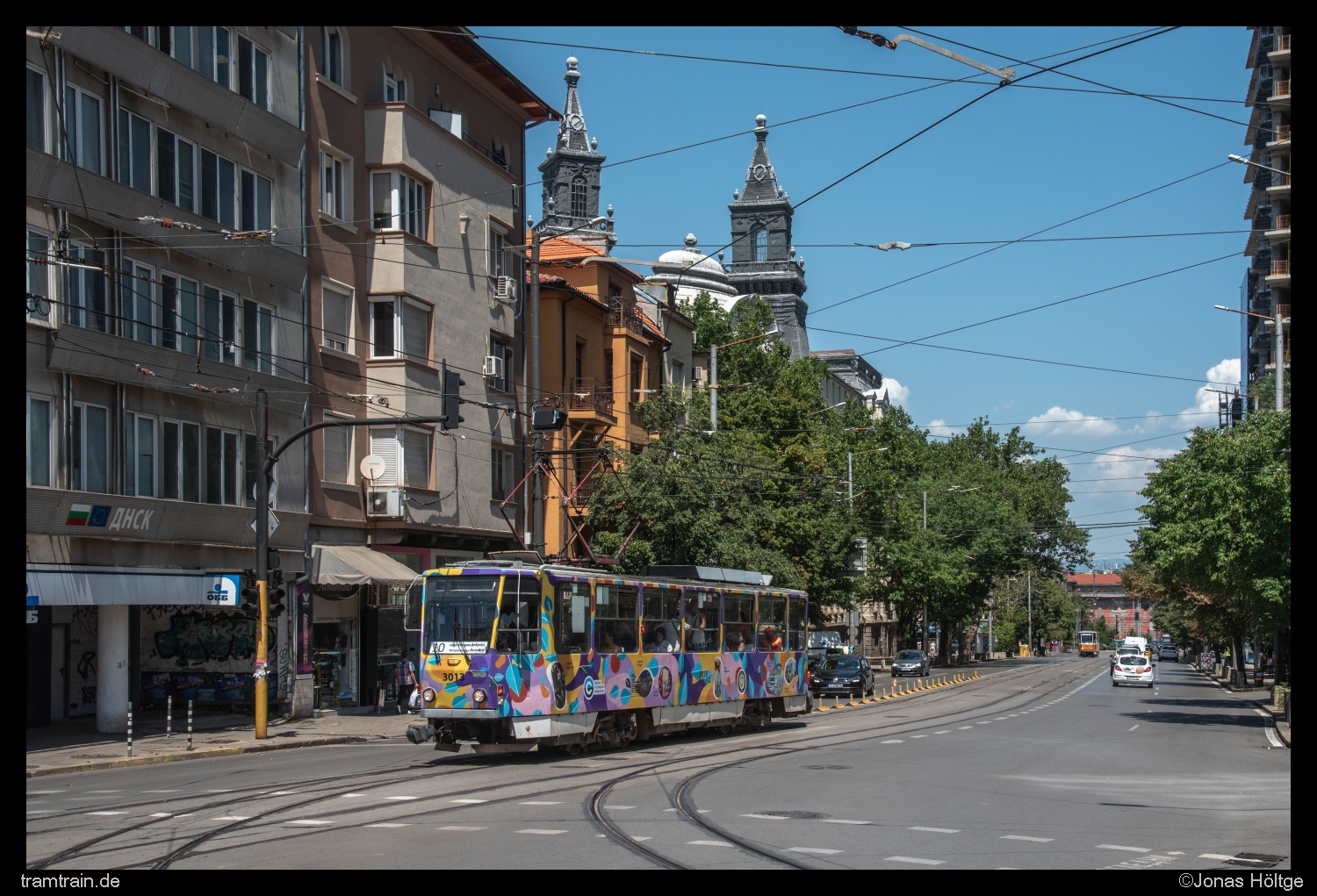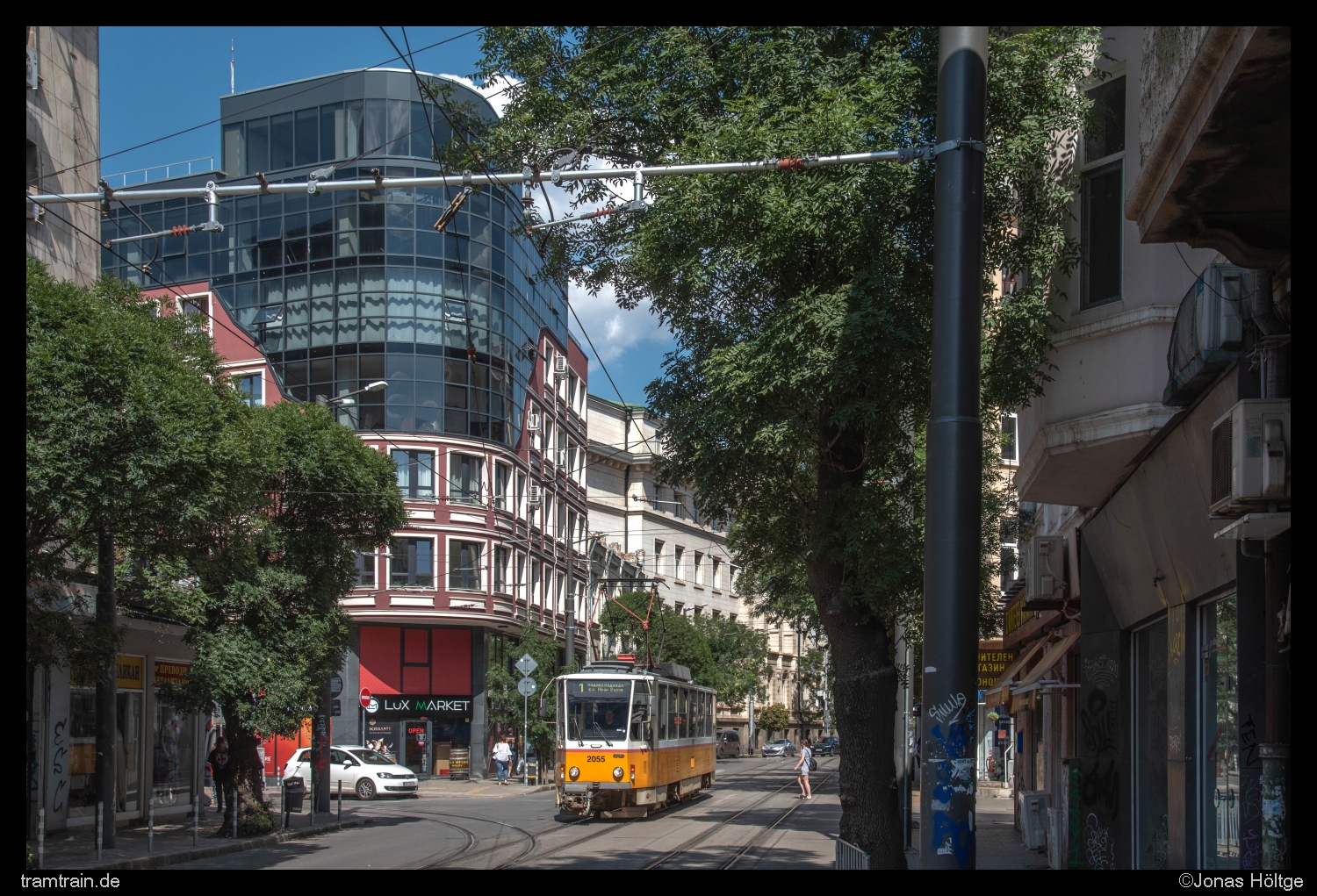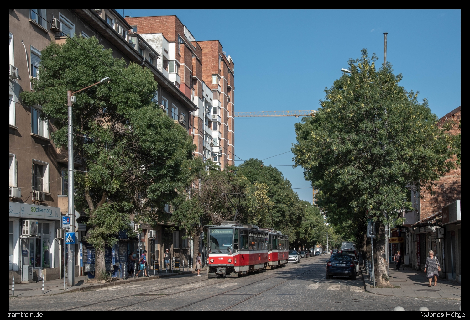 Weiter wollte ich der Linie 10 erstmal nicht folgen. Daher ging es zurück zur Hauptachse und dort bis zur nächsten Station weiter. Schon aus der Ferne hatte ich gesehen, dass es hier bereits die nächste Querachse der Straßenbahn gab. Auf dem Weg die Straße herunter kreuzte auch ein erstes T6A5-Doppel in der auffälligen Prager Lackierung die Straße, wodurch mit klar wurde, dass es sich bei der Querachse um die Regelspurstrecke handeln musste, die einmal quer durch die Stadt verläuft. Somit würde ich zumindest direkt zwei weitere neue Fahrzeugserien mit den auf den Regelspurlinien verkehrenden T6A5 und T6B5B ablichten können. Daher gab es in den nächsten Minuten einige Bilder zwischen der an der Kreuzung liegenden Station Bul. Hristo Botev und der auf den Regelspurlinien 20, 21 und 22 folgenden Station Zhenski pazar. Da die Linien kombiniert fast im 5-Minuten-Takt verkehrten, ging das Fotografieren in einer dichten Taktung von Statten.