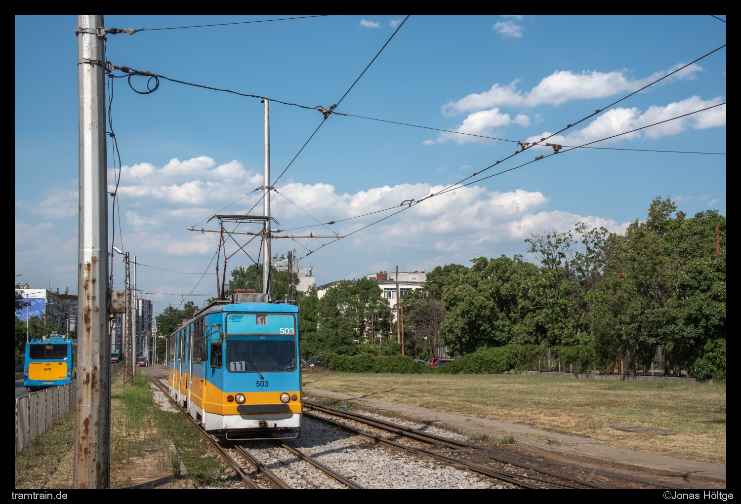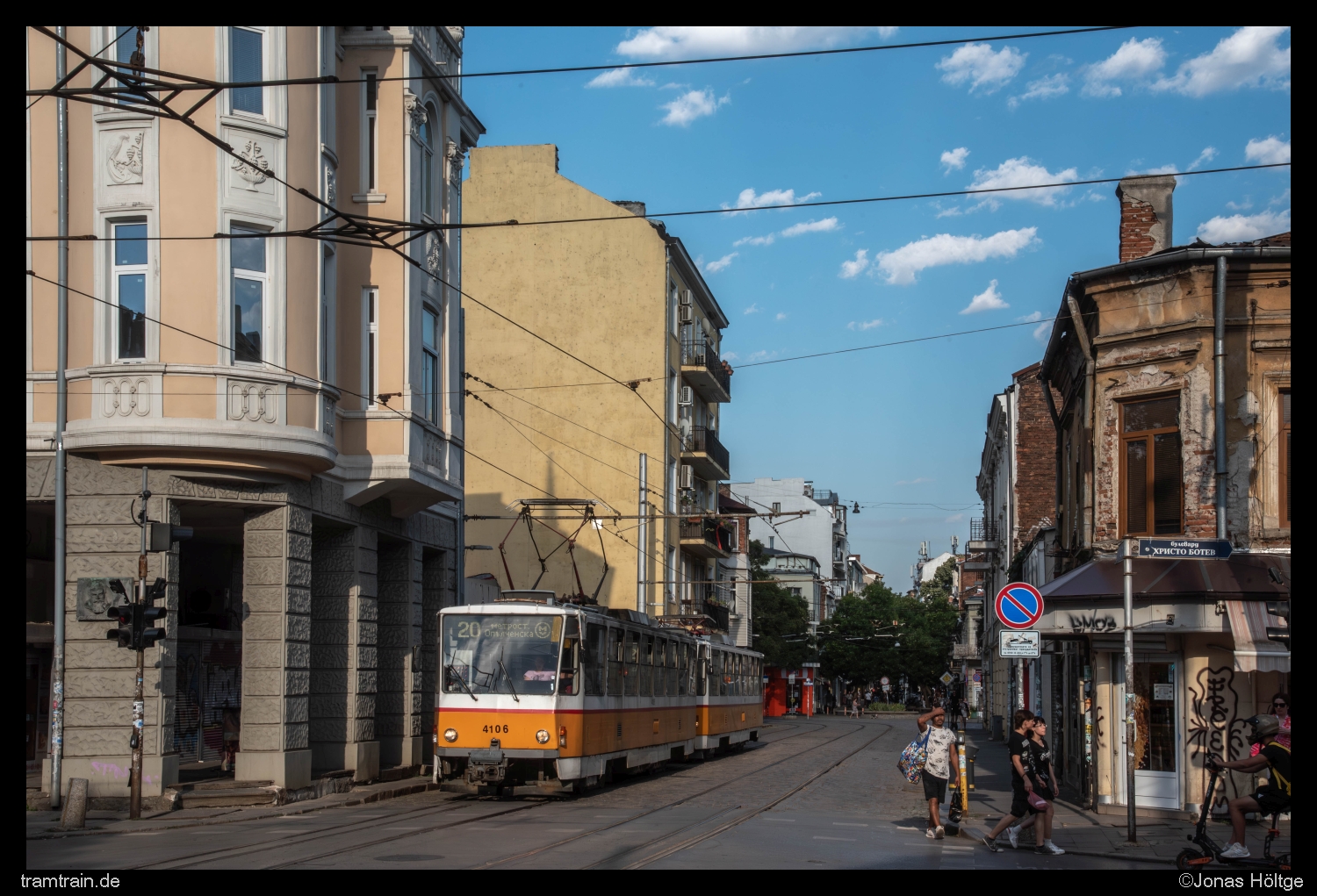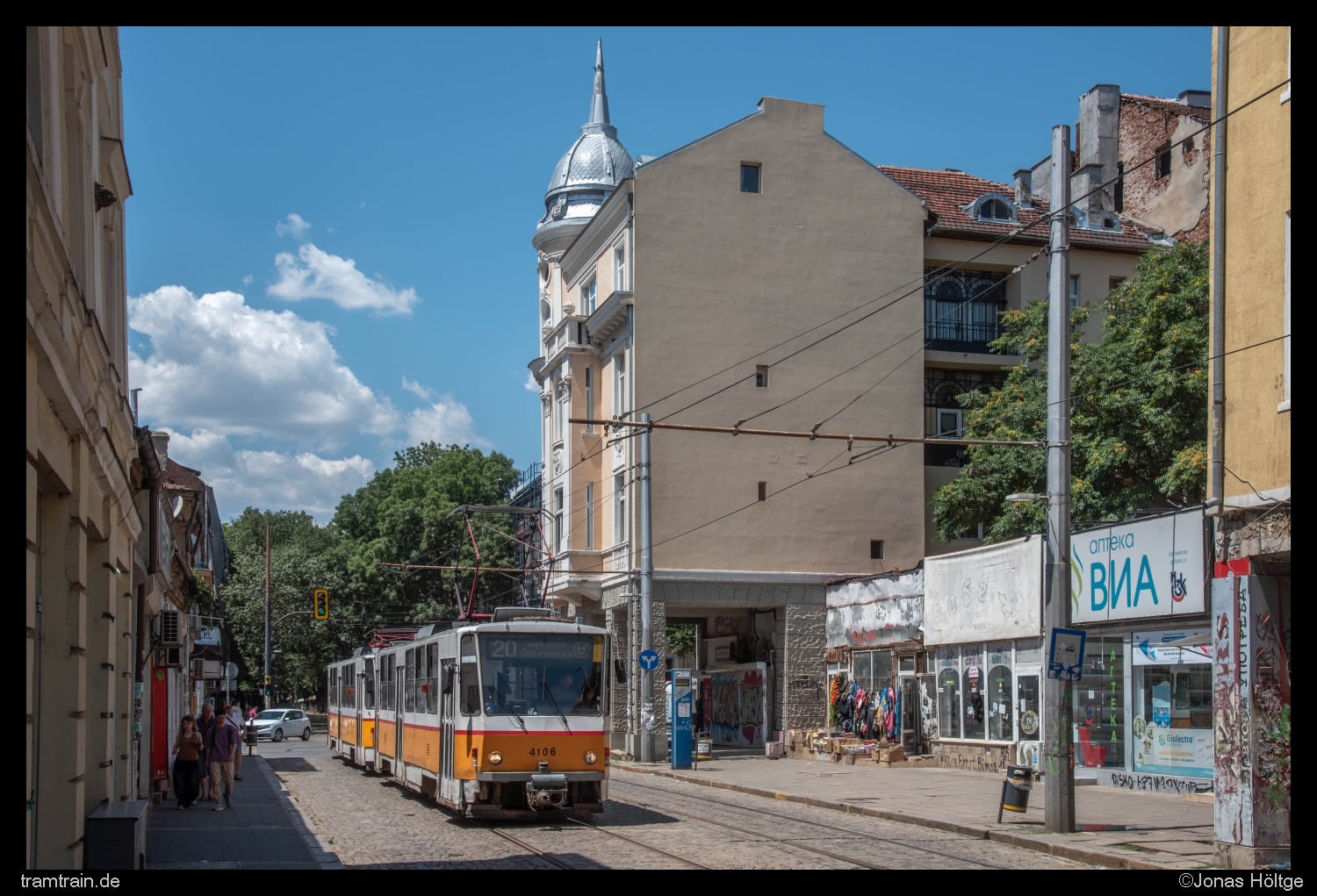 Weiter wollte ich der Linie 10 erstmal nicht folgen. Daher ging es zurück zur Hauptachse und dort bis zur nächsten Station weiter. Schon aus der Ferne hatte ich gesehen, dass es hier bereits die nächste Querachse der Straßenbahn gab. Auf dem Weg die Straße herunter kreuzte auch ein erstes T6A5-Doppel in der auffälligen Prager Lackierung die Straße, wodurch mit klar wurde, dass es sich bei der Querachse um die Regelspurstrecke handeln musste, die einmal quer durch die Stadt verläuft. Somit würde ich zumindest direkt zwei weitere neue Fahrzeugserien mit den auf den Regelspurlinien verkehrenden T6A5 und T6B5B ablichten können. Daher gab es in den nächsten Minuten einige Bilder zwischen der an der Kreuzung liegenden Station Bul. Hristo Botev und der auf den Regelspurlinien 20, 21 und 22 folgenden Station Zhenski pazar. Da die Linien kombiniert fast im 5-Minuten-Takt verkehrten, ging das Fotografieren in einer dichten Taktung von Statten.