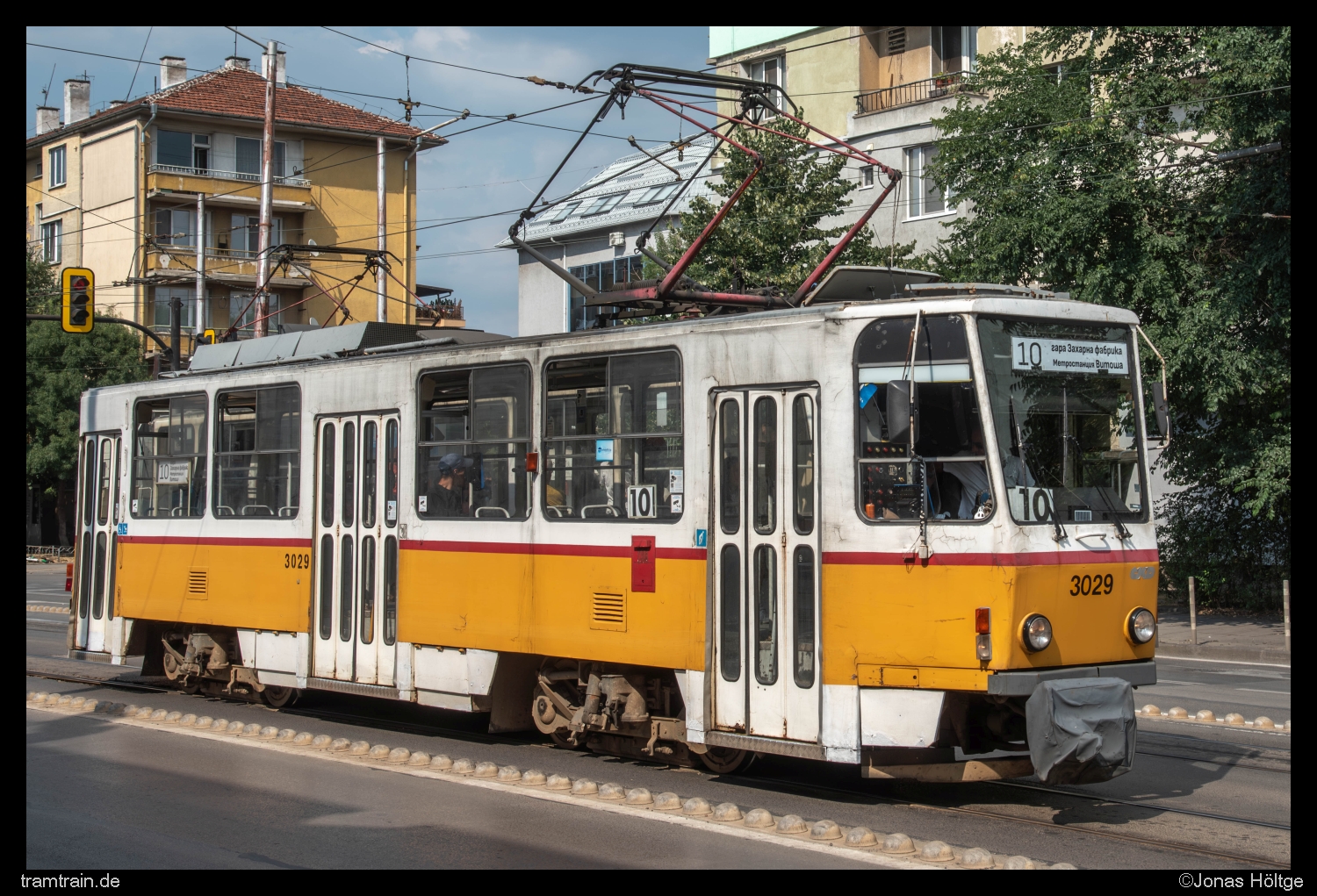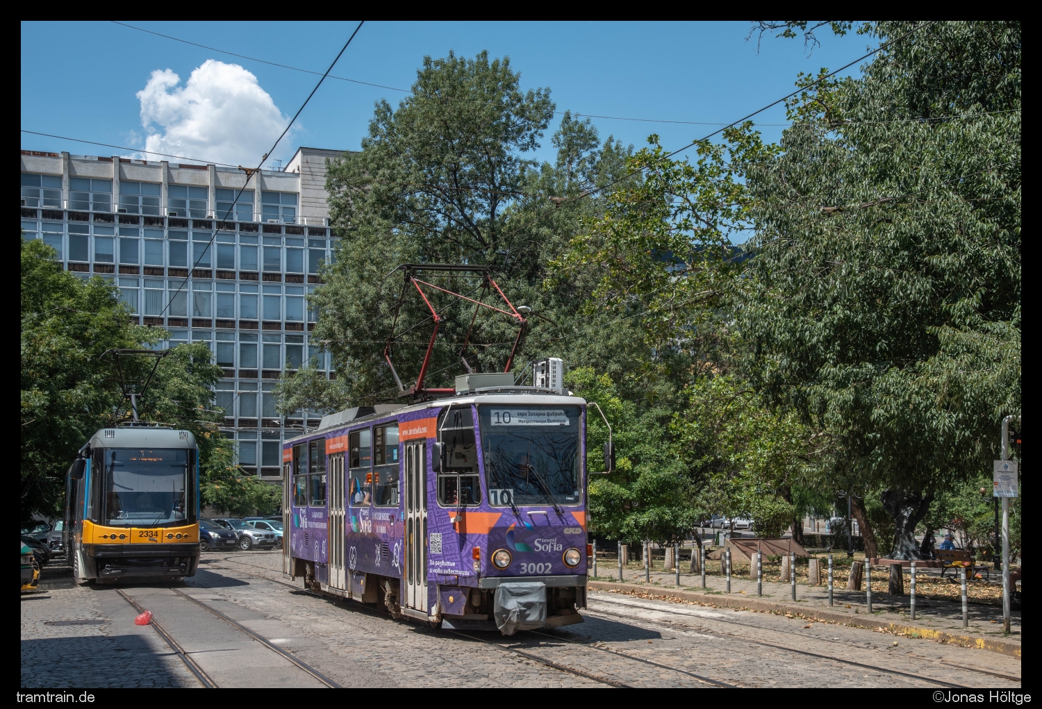 Inzwischen war ich an der Kreuzung angekommen. Aus der entgegengesetzten Richtung näherte sich mit Wagen 3013 ein sehr farbenfroher Vertreter der T6A2-Baureihe. Bevor es für den Wagen als Linie 10 nach links um die Ecke weitergehen konnte, musste zunächst einige an Zeit vor der Kreuzung ausgeharrt werden. Denn in Sofia gibt es für die Straßenbahn keine eigenen Ampelphasen. Dadurch kann es dazu kommen, dass ein Wagen auch mal eine ganze Ampelphase vor der Weiterreise warten muss, wenn er zum falschen Zeitpunkt an der Kreuzung ankommt.