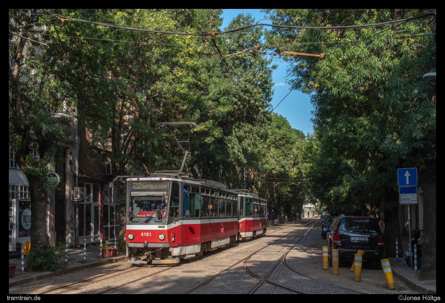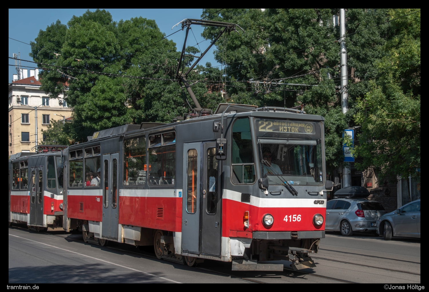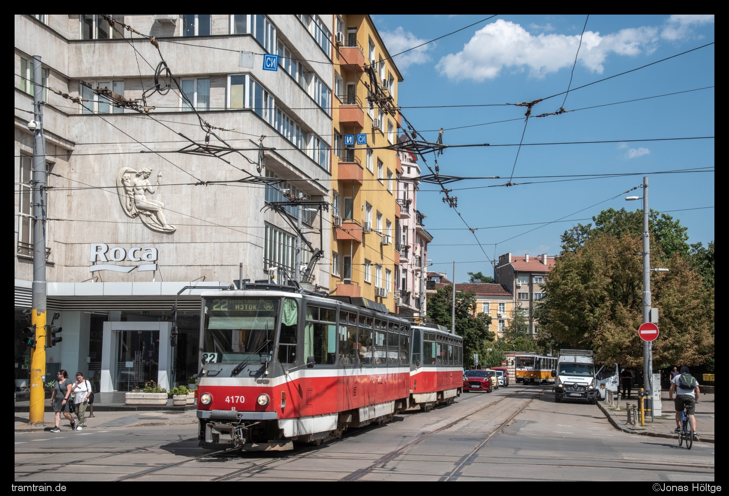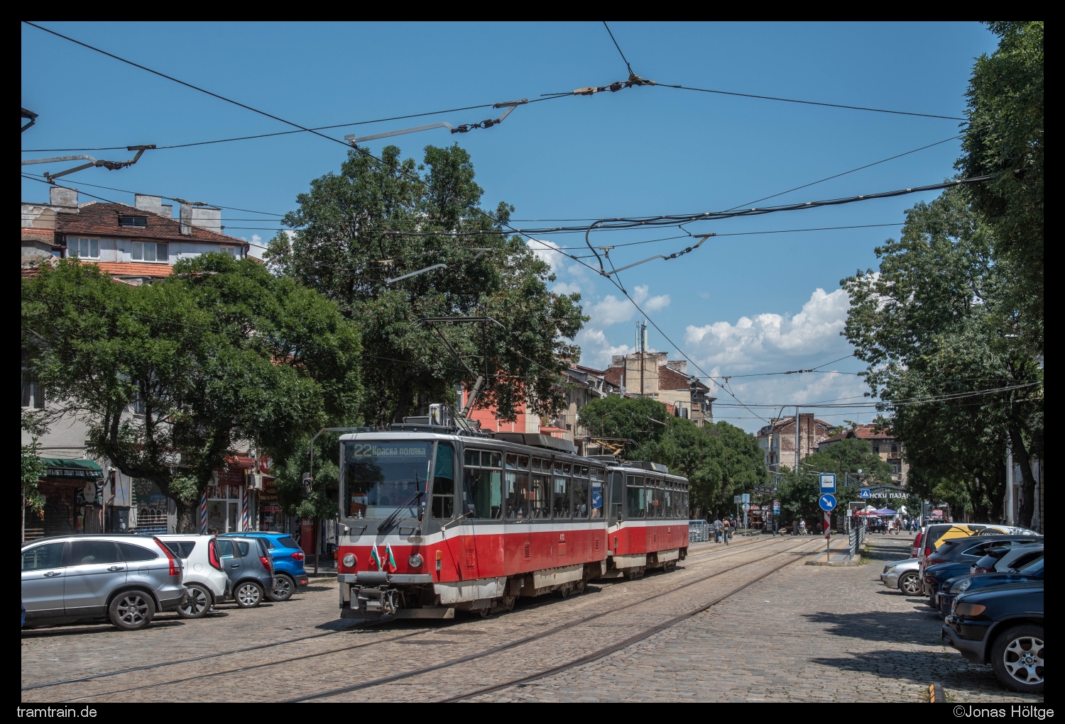 Zuletzt stellen die T6A5 die mit Abstand größte Baureihe im Regelspurnetz und die zweitgrößte Baureihe im gesamten Betrieb mit 54 Fahrzeugen dar. Die von CKD gebauten Fahrzeuge wurden ursprünglich 1995 bis 1997 nach Prag geliefert. In den Jahren 2016 bis 2020 gelangten alle 54 heute vorhandenden Fahrzeuge nach Sofia und verkehren dort seitdem mit den Nummern 4140 bis 4193. Wie bereits bei den Baseler Fahrzeugen, wurde auch hier auf eine Umlackierung verzichtet, weshalb die Wagen noch immer mit der Prager Lackierung durch Sofia verkehren. Der Einsatz beschränkte sich bei meinem Besuch lediglich auf die Linie 22.