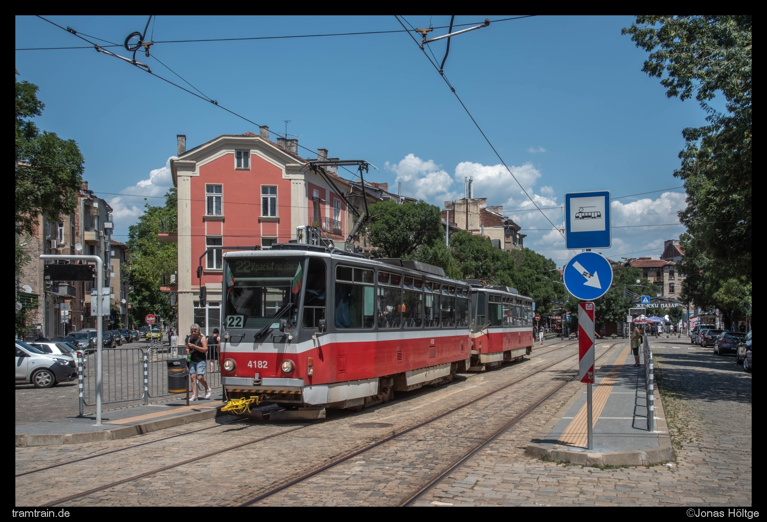 In der Station Zhenski pazar lichtete ich den nächsten Kurs der Linie 22 bestehend aus den Wagen 4182+4183 ab. Zwischendurch war keine Linie 20 gekommen, so ganz wechselseitig verkehrten die Linien also offenbar nicht. Wobei auch die Linien selbst nicht so ganz taktgenau fuhren. Verwunderlich war das bei den langen Wartezeiten an den Kreuzungen aber nicht. Zumindest Google-Maps hatte immer sehr genaue und zuverlässige Informationen, wann die nächsten Kurse kommen würden.