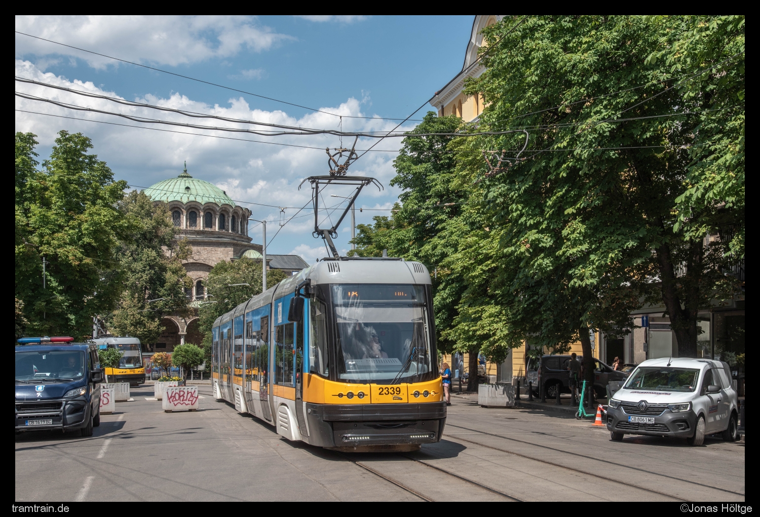 Nach dem Bild hatte ich mich ein wenig weiter die Strecke entlang bewegt. Nach dem Schlenker nach rechts, dreht sich die Strecke wieder ein Stück nach links, um somit insgesamt einen Halbkreis um die Kathedrale Sweta Nedelja (sicherlich der Grund für die umständliche Gleisführung) zu drehen. Danach ging es in der gleichen Lichtachse wie vor der Kathedrale weiter. Somit würde auf dem Gleisabschnitt nach Umrundung der Kathedrale noch immer nichts beim jetzigen Sonnenstand gehen. Blieb noch ein kleines Stück, auf dem sich die Straßenbahn direkt vor der Kathedrale bewegte. Dort bot sich ein kleiner Sonnenspot, gerade groß genug für einen T6A2. Bei einem Kurs alle halbe Stunde war die Chance da jetzt nicht so groß, gerade weil im Moment auch einige Wolken durchzogen. Versuchen wollte ich es aber trotzdem. Kurz bevor die nächste 1 kommen sollte, stellte sich noch ein Polizeiauto ein wenig ins Bild, was die ganze Situation zusätzlich erschwerte. Als dann noch das Licht ausging, als der T6A2 kam, war das Bild endgültig zerstört. Das wollte ich mir aber nicht bieten lassen, also nochmal eine halbe Stunde auf den nächsten Kurs gewartet. Inzwischen war die Temperatur ohnehin auf fast 38 Grad angestiegen, sodass sich mein Bewegungsdrang auf ein Minimum begrenzt hatte. Hier unter einem schattigen Baum zu stehen, war da noch das Angenehmste. Mit dem nächsten T6A2 funktionierte das Bild zumindest mit Streiflicht, da ich dieses Motiv in den nächsten Tagen aber noch besser umsetzen sollte, lasse ich es hier außen vor. Durch die lange Wartezeit war nun auch das Gleisstück hinter der Kathedrale ins Licht gerückt und so wollte ich dort mein Glück versuchen. Die nächsten 20 Minuten hatte sich jedoch erstmal eine Wolke vor die Sonne geschoben, sodass ich zumindest bei gefühlt zwei Grad weniger auf die Rückkehr der Sonne warten konnte. Nachdem immerhin hier ein Bild mit Kathedrale im Hintergrund gelang, ging es zurück zur Kreuzung mit der Regelspurlinie und der Moschee, die sich inzwischen im richtigen Licht befand.
