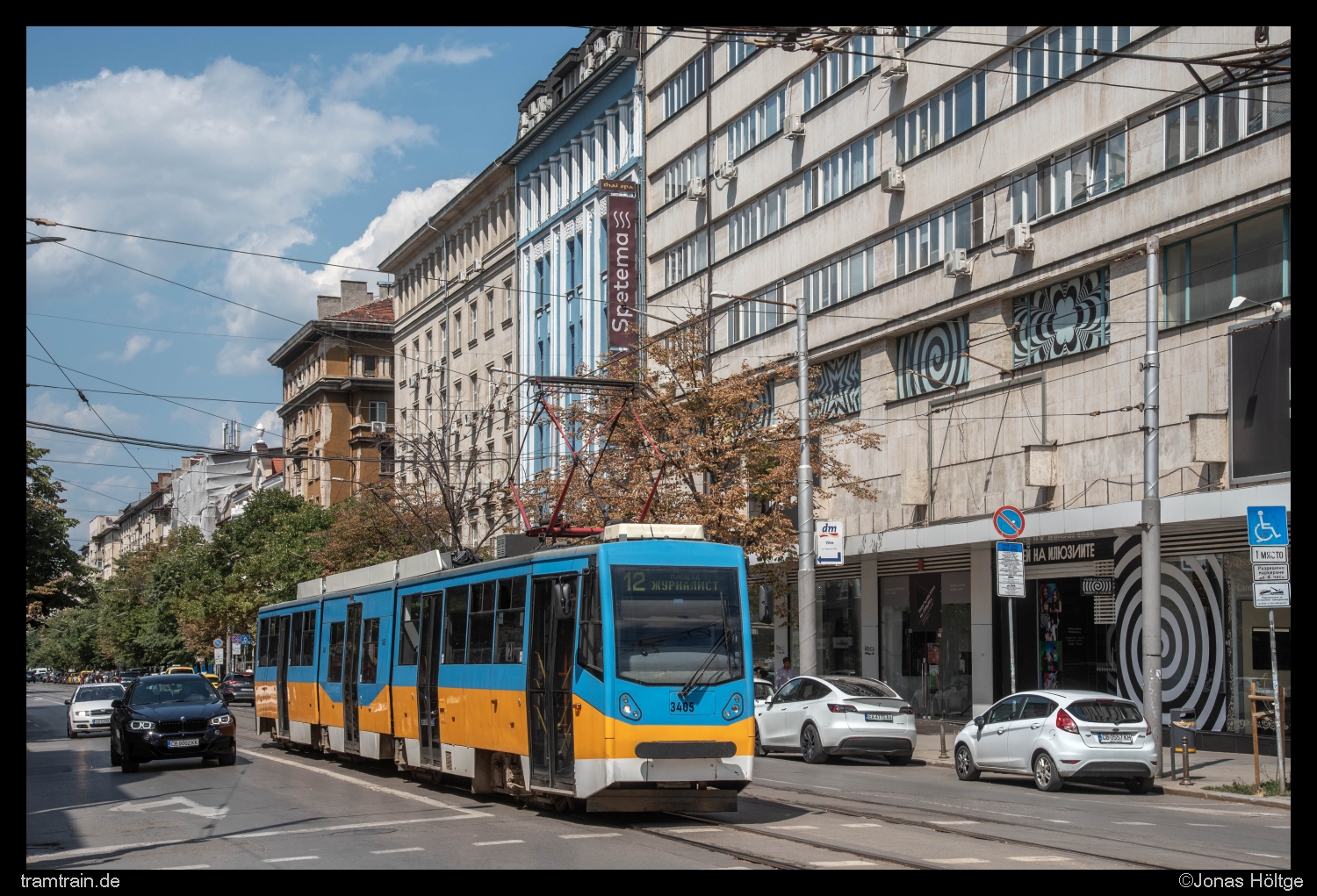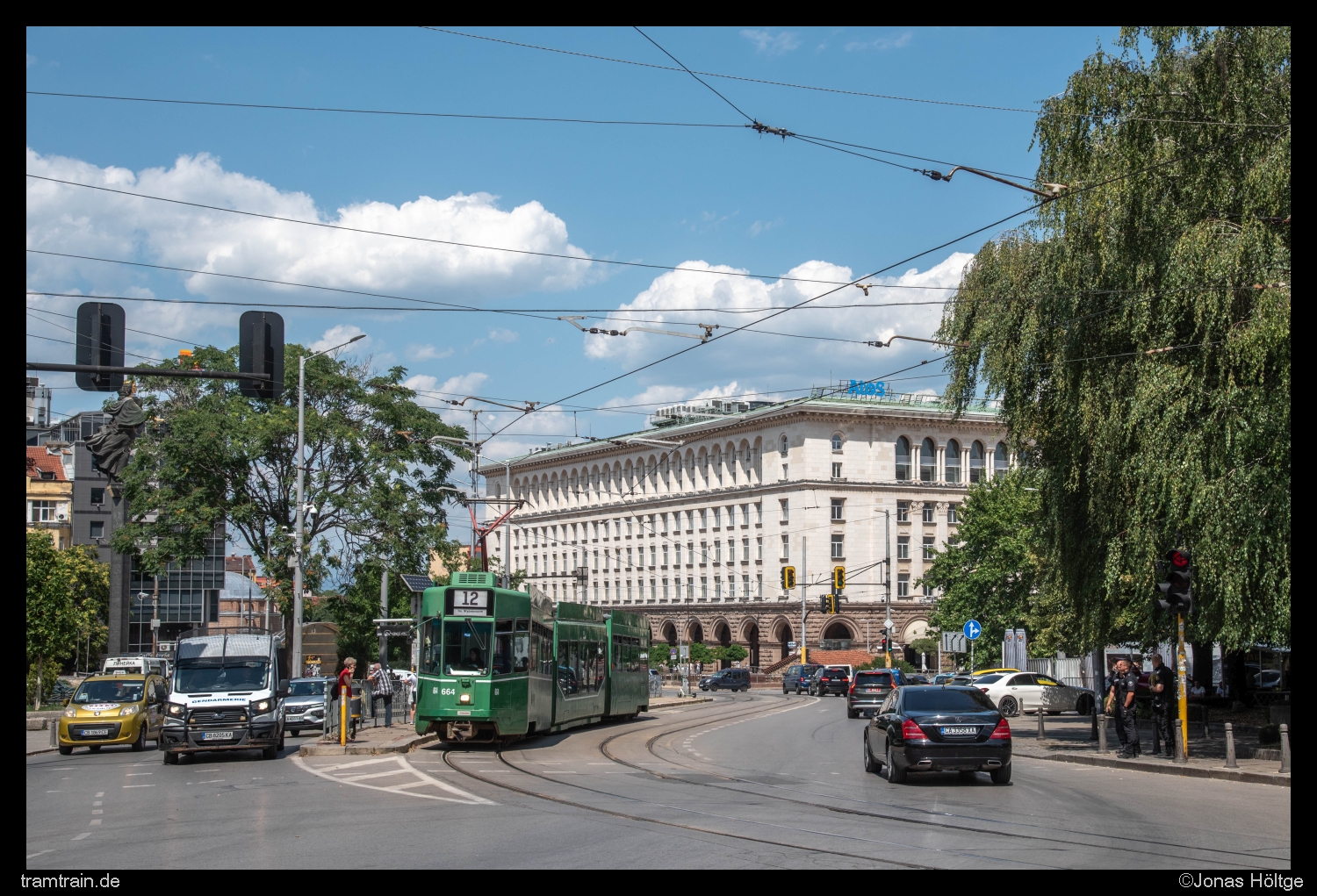 Zurück an der Haltestelle Pl. SV. Nedelya hatte sich das Licht 1½ Stunden später so weit gedreht, dass die Hausfassade des Einkaufszentrums im Hintergrund ins Licht gerückt war. Zwar befand sich der Wagen selbst dafür nicht mehr im richtigen Licht, bei so einem hohen Sonnenstand war aber auch das verkraftbar. Die lange Wartezeit am letzten Motiv zeigte sich auch darin, dass Wagen 664 inzwischen einmal einen ganzen Umlauf geschafft hatte und sich erneut an dieser Station zeigte.