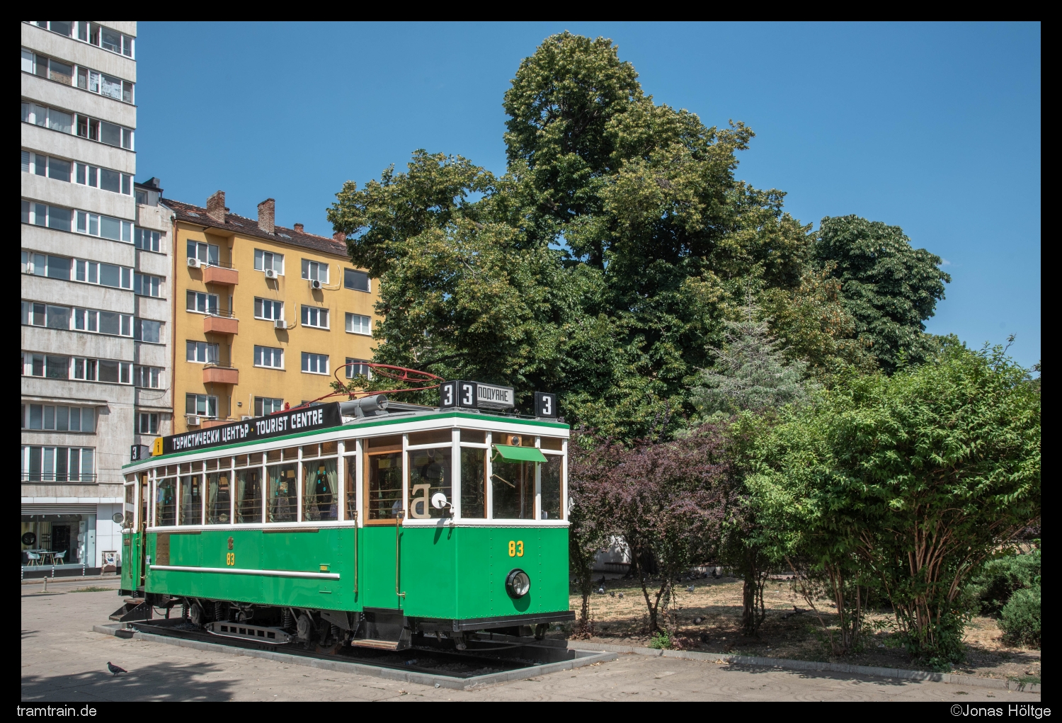 Direkt neben der Moschee und an der Ecke der Kreuzung von den Meterspurlinien und den Regelspurlinien erblickte ich noch eine nette Überraschung. Der Wagen war mit schon vorhin aufgefallen, inzwischen befand sich das Fahrzeug auch im richtigen Licht. Bei dem Wagen 83 handelt es sich um den zwischenzeitlich umnummerierten historischen Wagen 553. Das Fahrzeug wurde 1935 von Siemens gebaut und mit der Nummer 83 nach Sofia geliefert. Damit handelt es sich um ein originales Fahrzeug aus Sofia. Erst 2015 wurde der Wagen nach langem Verrotten auf dem Betriebshof komplett äußerlich restauriert, behielt aber zunächst die Nummer 553. 2024 folgte eine weitere äußere Veränderung, bei der der Wagen seine ursprüngliche Nummer 83 zurückbekam und einige kleine äußeren Veränderungen erfuhr. Ende 2024 wurde das Fahrzeug an seinen jetzigen Standort gebracht, wo er fortan als Touristeninformation dient.