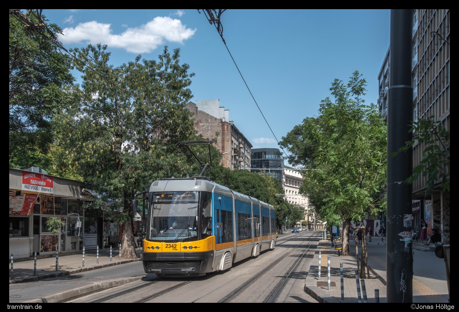 Pesa 2342 kam als Linie 5 gerade in die Station Pl. Makedoniya eingefahren. Hier befand sich die einzige Station im gesamte Netz, bei der zwar auf der Straße eingestiegen werden musste, dafür aber die Straße ein wenig erhöht wurde, sodass ein Niederflureinstieg möglich war. Passend dazu verkehrte hier mit der Linie 5 eine reine Pesa-Linie fast im 5-Minuten-Takt, weshalb auch das Angebot zu der Haltestelle passte. Die Linie 5 endet kurz hinter der Station in einer Blockumfahrung, sodass es sich bei der Station Pl. Makedoniya sozusagen um die erste richtige Haltestelle handelte.