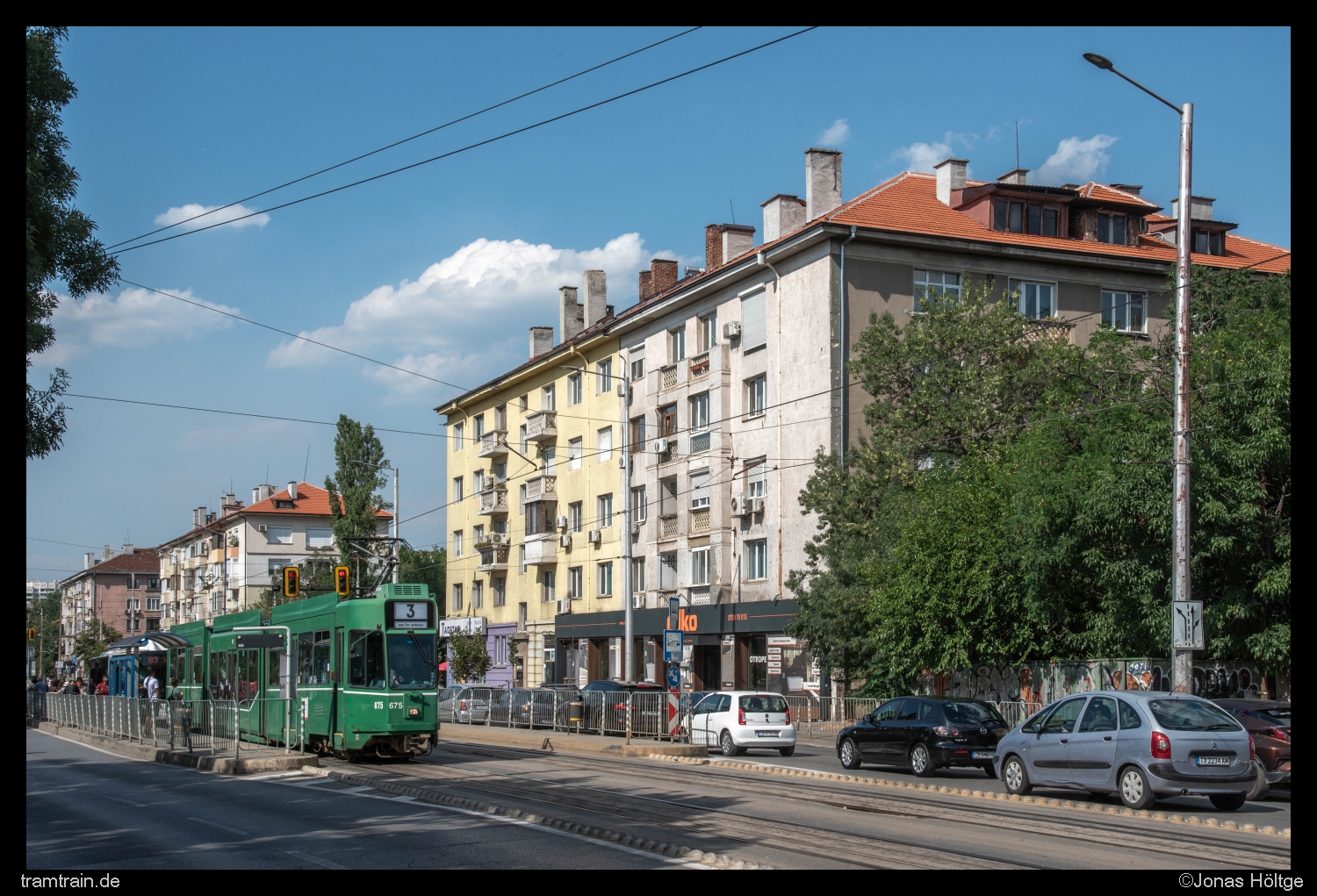 Dafür passte bei Wagen 675 auf der meterspurigen Querachse alles. Der ex Baseler bediente die Linie 3 und hatte als solche soeben die Station UI. Pirotska erreicht. Wie so viele Stationen in Sofia, befand sich auch diese Station mit Einstieg auf der Straße. Dadurch kann man sich zumindest sicher sein, dass kein Auto hinter der Straßenbahn das Bild stört. Aber auch von der anderen Straßenseite konnte gerade mal kein Auto auf der viel befahrenden Straße ins Bild fahren, da die Ampel rot war und die nächste T6A5-Traktion über die Kreuzung schepperte. Ein wenig seltsam war der Anblick der Prager und Baseler Lackierung in Sofia vor allem in der Kombination schon. Kurz nach dem Bild setzte sich auch Wagen 675 laut klappernd in Bewegung. Für eine ruhige Geräuschkulisse sorgen die Einzelräder unter dem Mittelteil nicht gerade.