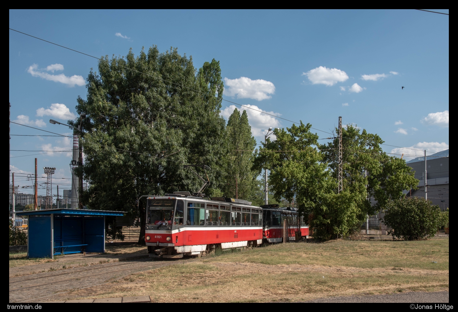 Zumindest etwas Grün hat die Endschleife ZH.K. Krasna Polyana der Linie 22 zu bieten, wobei das Grün im Moment eher Braun war. Trotzdem war es schöner als alles, was sich mir vorher an dem Abschnitt geboten hatte. Die Schleife befand sich zwar zu einem kleinen Teil auf dem Depotgelände, beheimatet waren die Regelspurfahrzeuge hier aber ohnehin nicht, es handelte sich um eines der großen Meterspurdepots. Doppel 4161 und 4163 hat seine kurze Pause beendet und rückt zur Abfahrtshaltestelle vor.