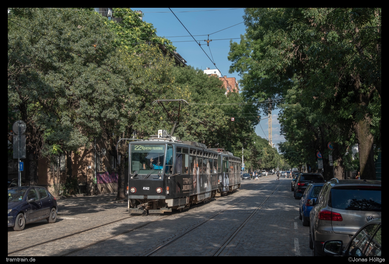 Das einzige Doppel der T6A5-Baureihe, welches mir mit Vollwerbung während meines Besuches begegnete, waren die Wagen 4142+4140. In einer genau von der Länge her passenden Lücke zeigte sich das Doppel fast direkt am Anfang der Straße. Wie einige Fahrer in Sofia, war auch der Fahrer dieses Doppels sehr erfreut über meine Anwesenheit und grüßte freundlich in die Kamera.
