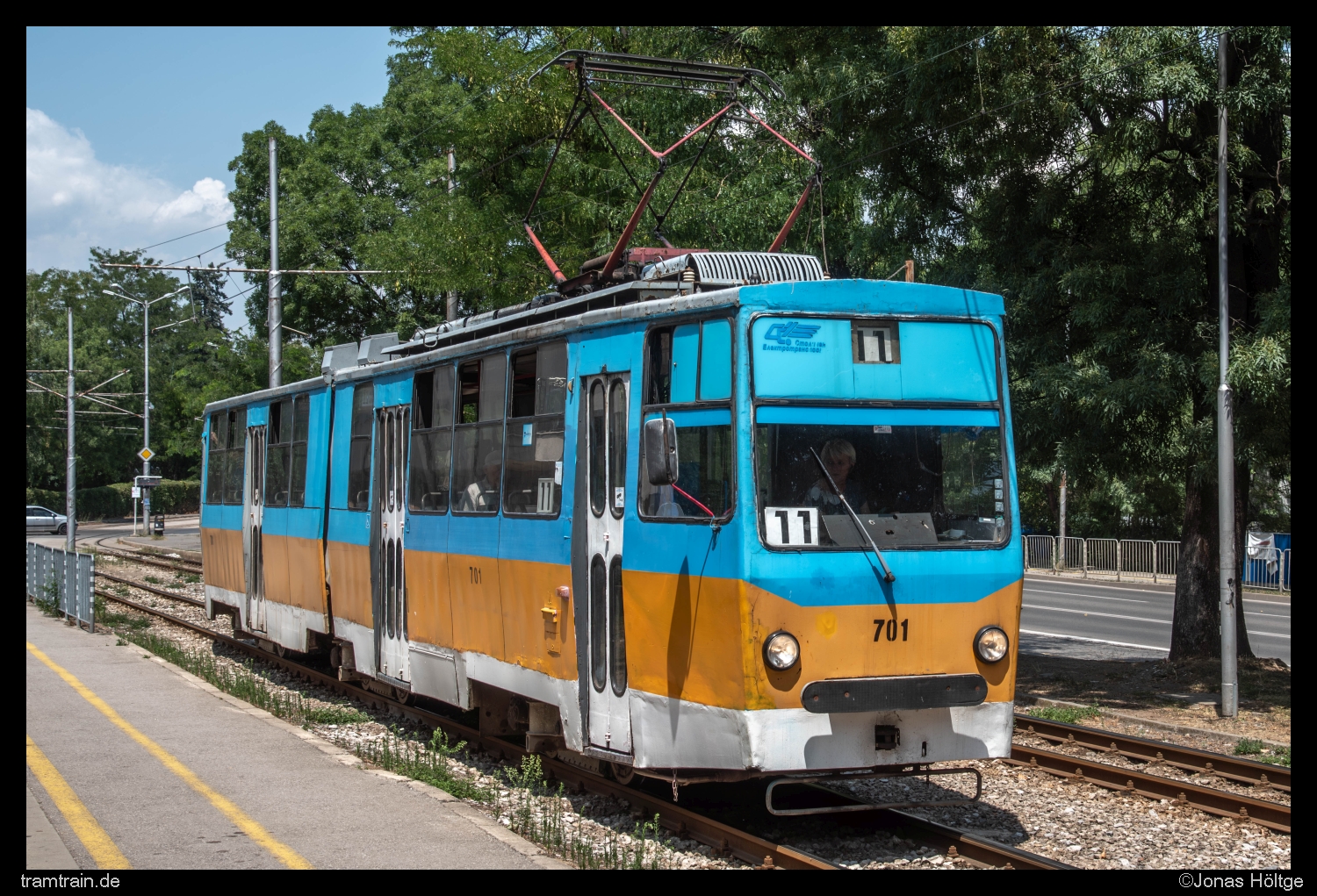 Ein letzter Wagen mit der Fahrzeugnummer 701 ist von der einst fast 40 Fahrzeuge umfassenden Serie der T6M-700 übrig geblieben. Die vom in Sofia heimischen Hersteller Tramkar (zum Zeitpunkt des Baus der Wagen hieß der Hersteller noch “Tramvaen zavod”) in den Jahren 1985 bis 1987 gelieferten Fahrzeuge wurden größtenteils im Laufe ihrer Einsatzzeit mit einer neuen Front ausgestattet. Dadurch erhielt die Fahrzeugserie den Zusatz T6M-700 F. Das Frontdesign lässt sich noch immer an den Fahrzeugen der Serie T8M-900 F wiederfinden. Da es bei dem Wagen 701 aber zu keiner Modernisierung kam, ist er hier unter der Bezeichnung T6M-700 aufgeführt. Abgesehen von Wagen 701 wurden die letzten Fahrzeuge der Serie 2023 mit der Lieferung der dritten Pesa Swing 122 NaSF Serie aus dem Verkehr gezogen. Der Wagen 701 wurde nie mit einer neuen Front ausgestattet und trägt somit noch immer die Front, die die Fahrzeugserie bei ihrer Auslieferung hatte. Das Fahrzeug verkehrte bei meinem Besuch auf der Linie 11.