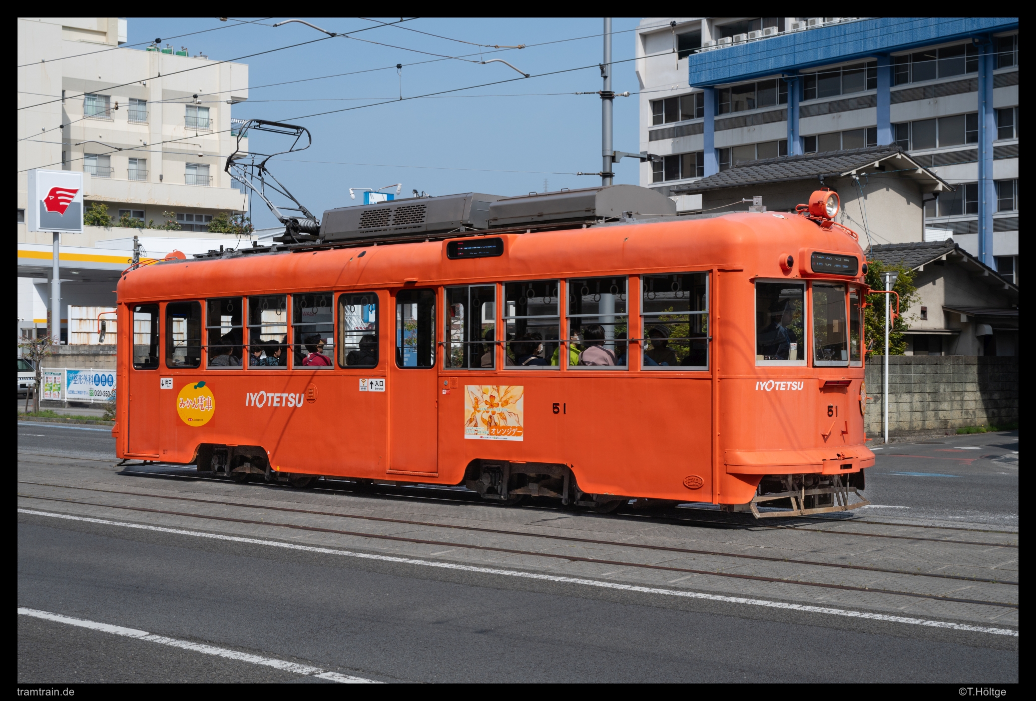 Wir sind nun am Abzweig vorbei und verlassen mit den Linien 3 und 5 den Ring in Richtung Dogo Onsen. Auf der kurzen Linie 3 dauert es nie lang, bis Wagen 51 wieder des Weges kommt, diesmal in Richtung Dogo Onsen hinter der Haltestelle Minamimachi (22).