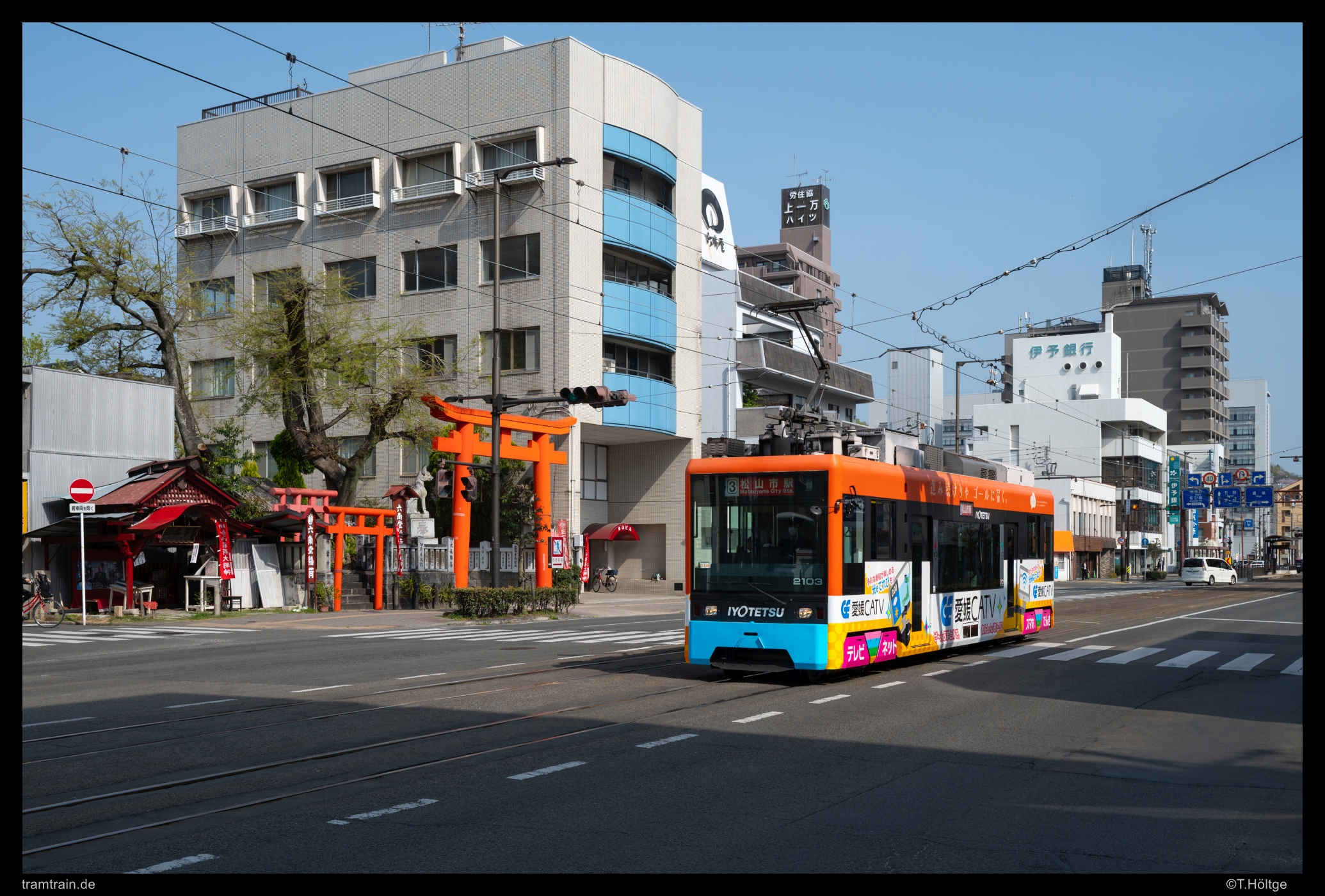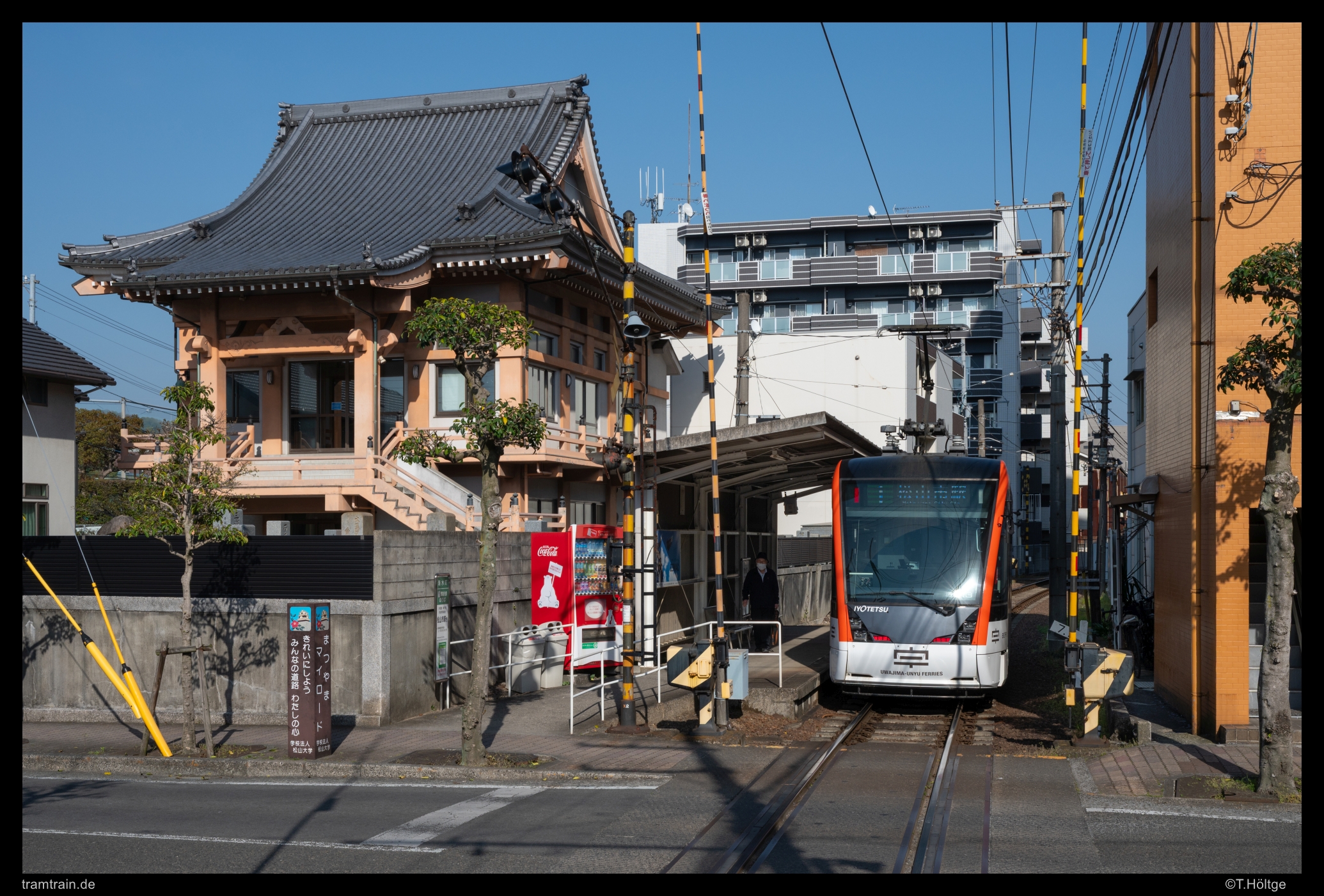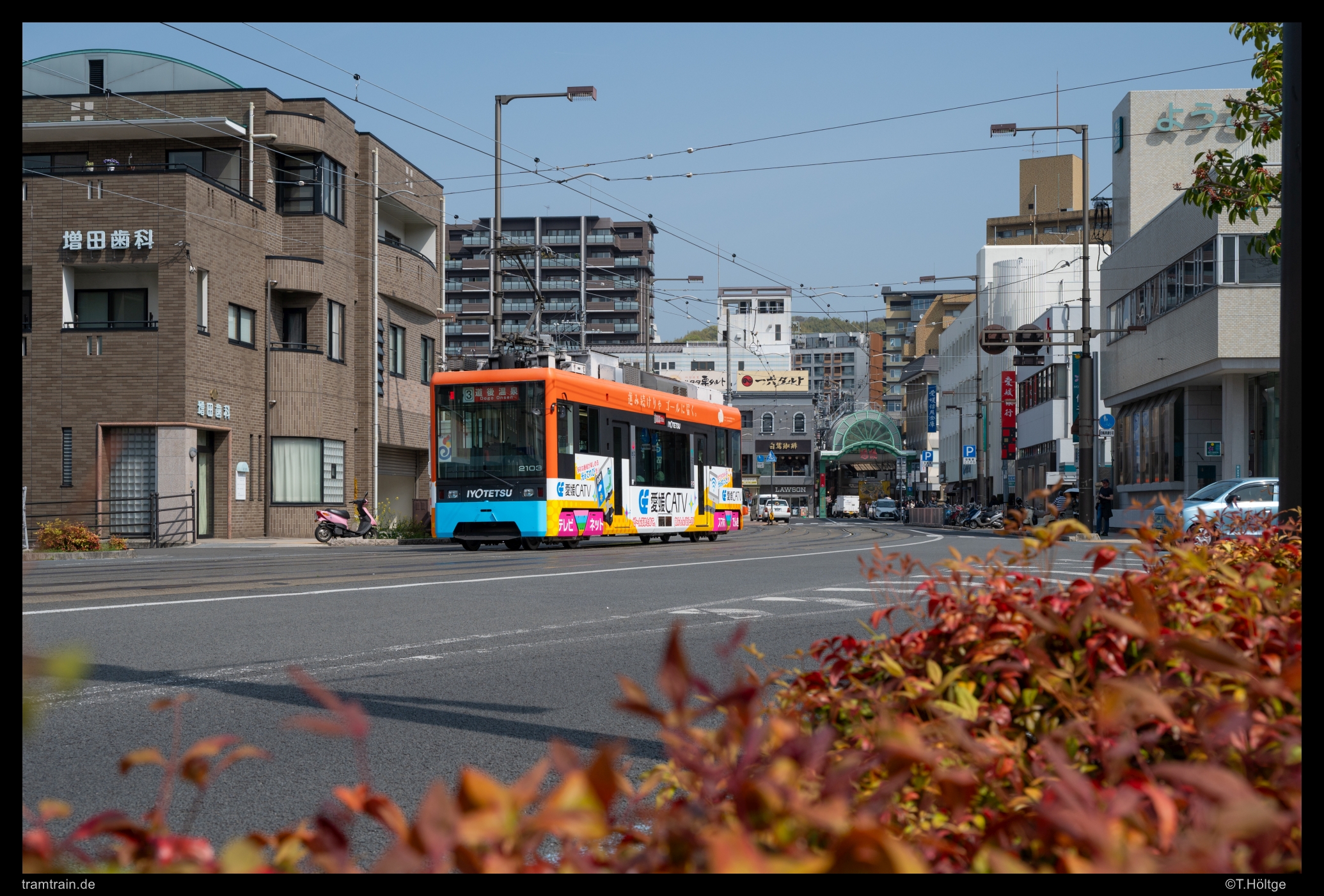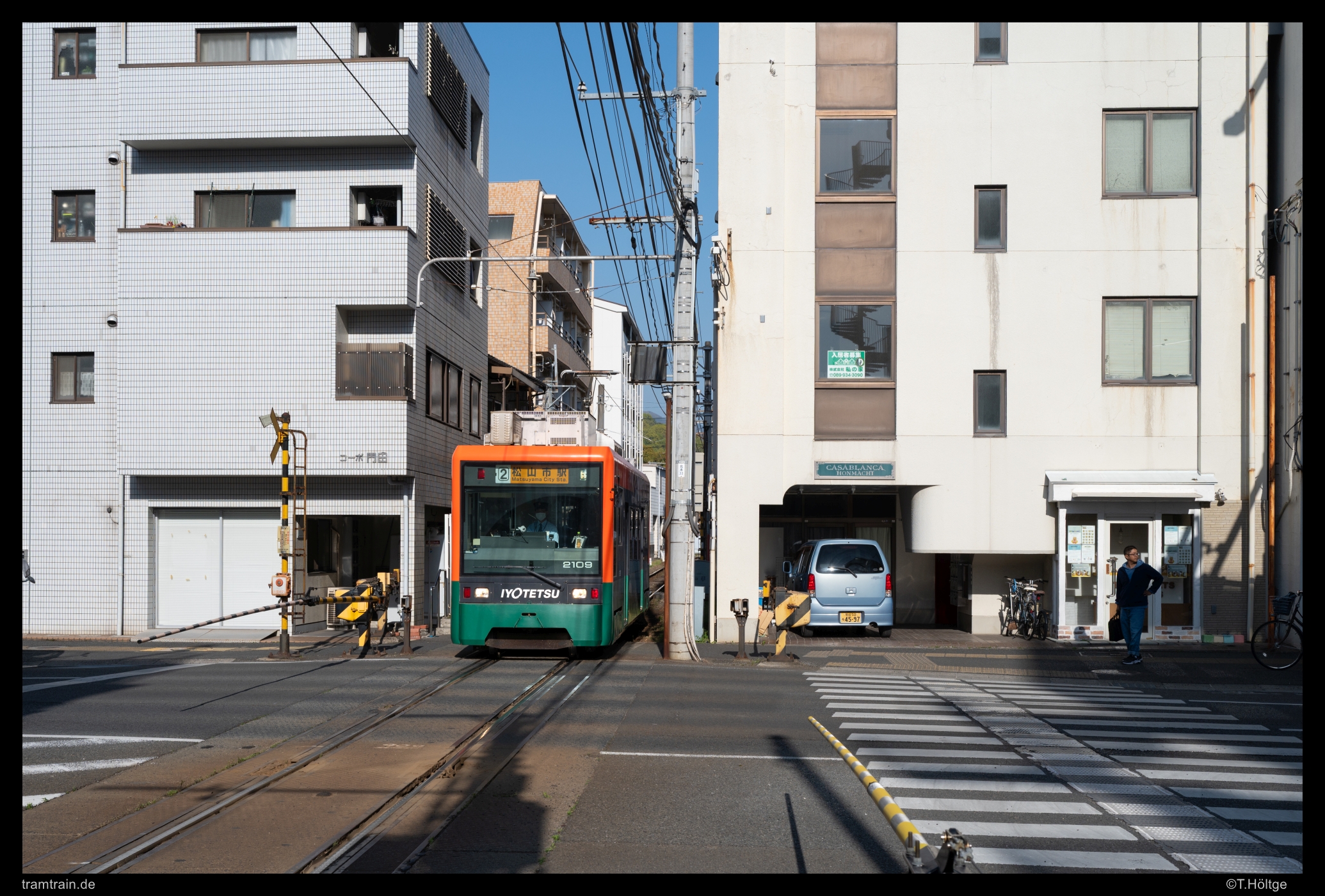 Kurz vor der Endstation Dogo Onsen (24) passiert uns Wagen 2103. Der Eingang in die Shoutengai des bekannten Viertels ist im Hintergrund bereits zu sehen.