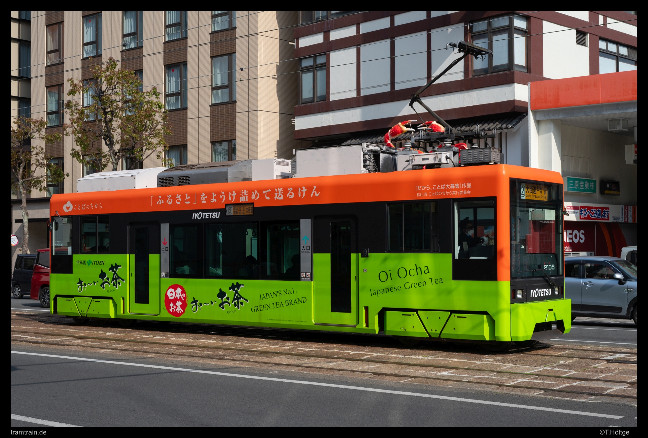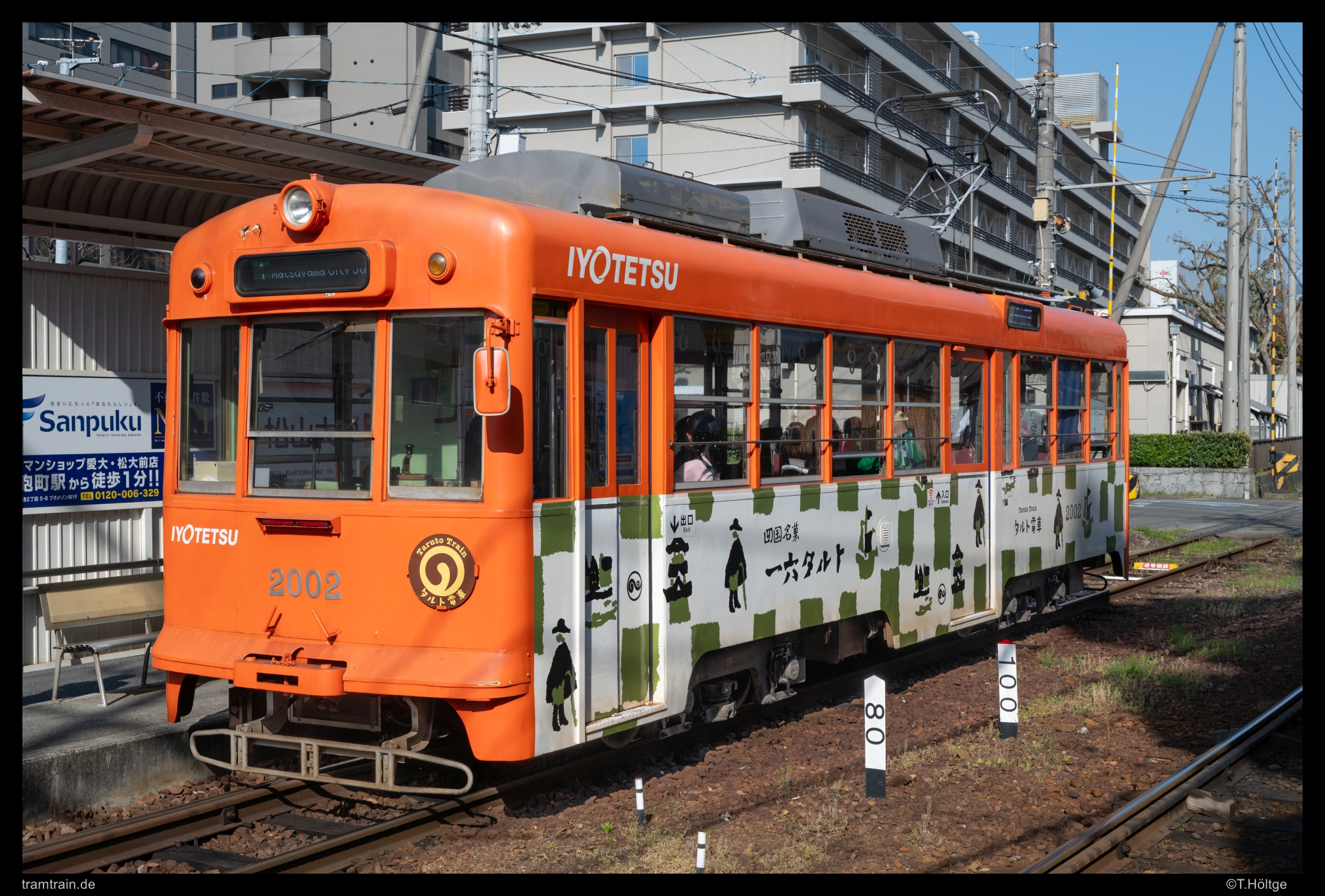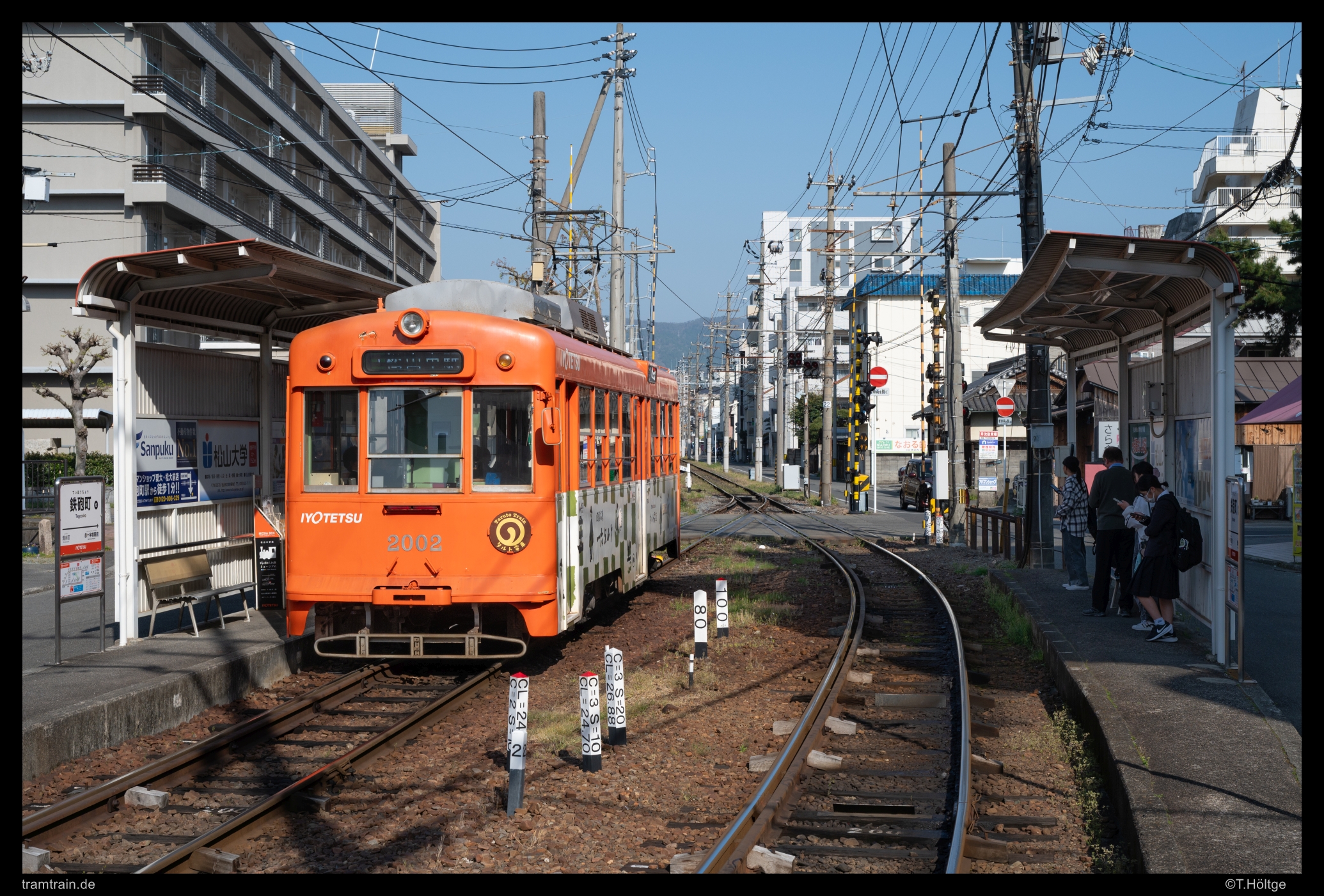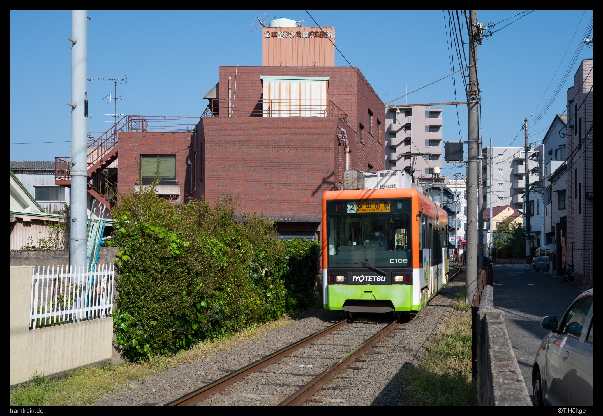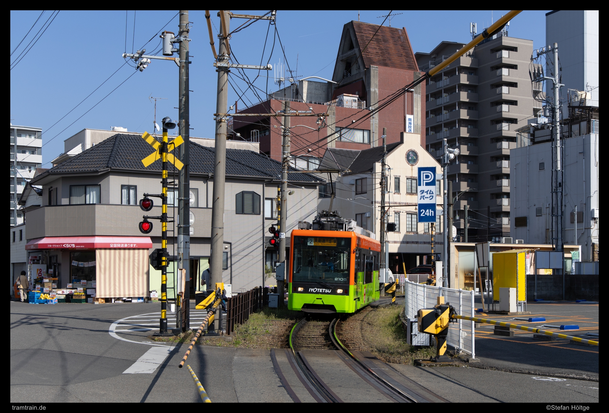 Kurz vor der Endstation Dogo Onsen (24) passiert uns Wagen 2103. Der Eingang in die Shoutengai des bekannten Viertels ist im Hintergrund bereits zu sehen.
