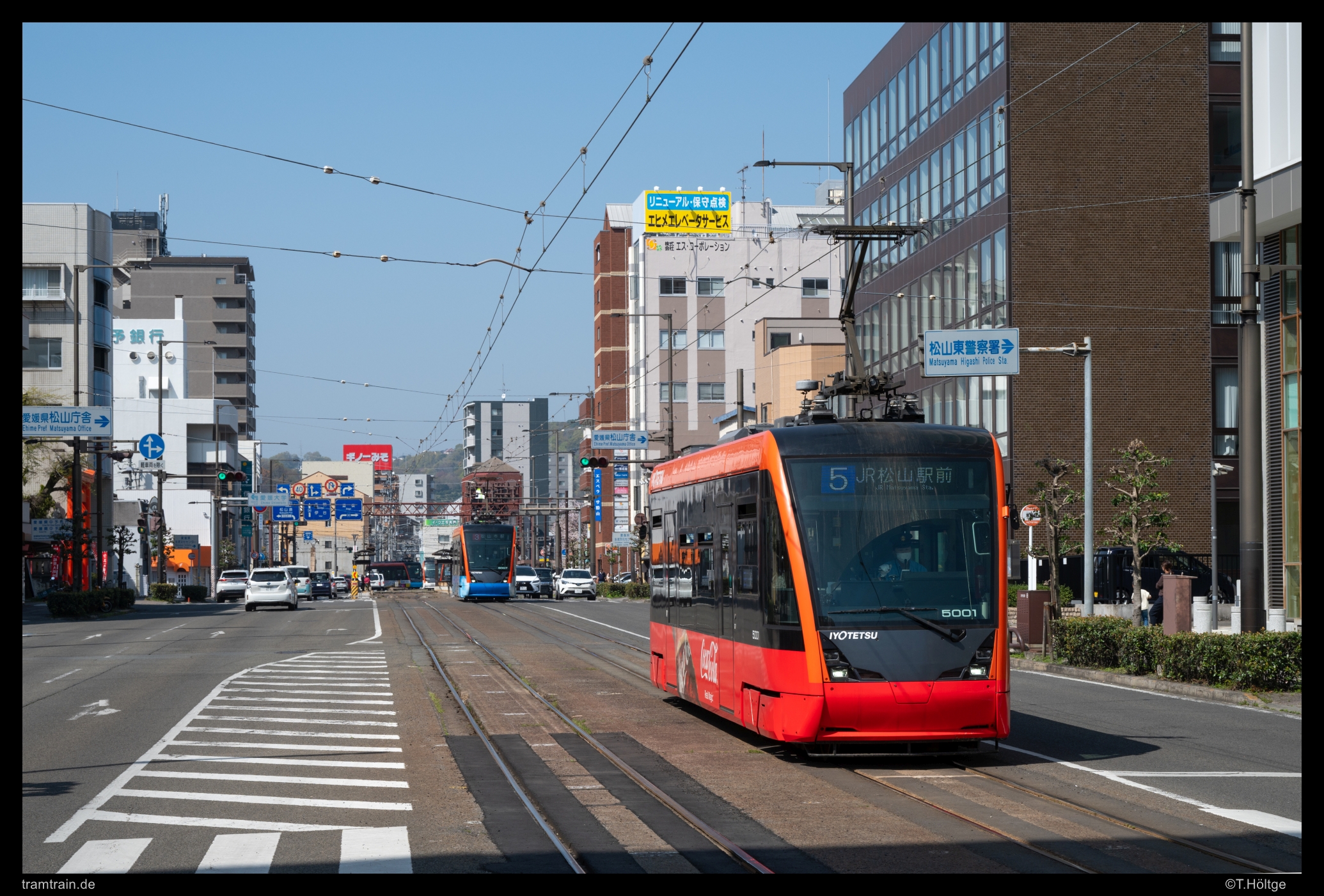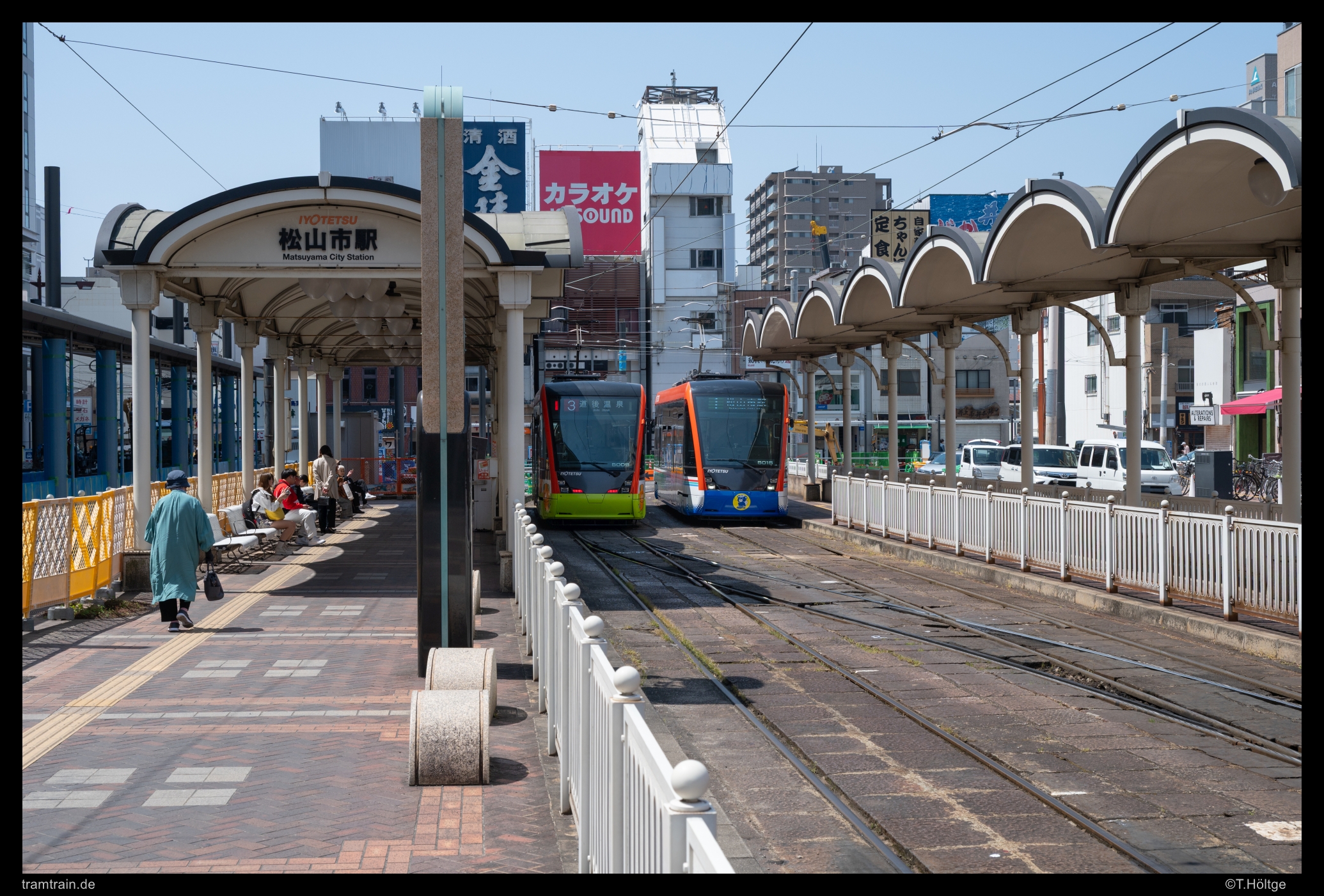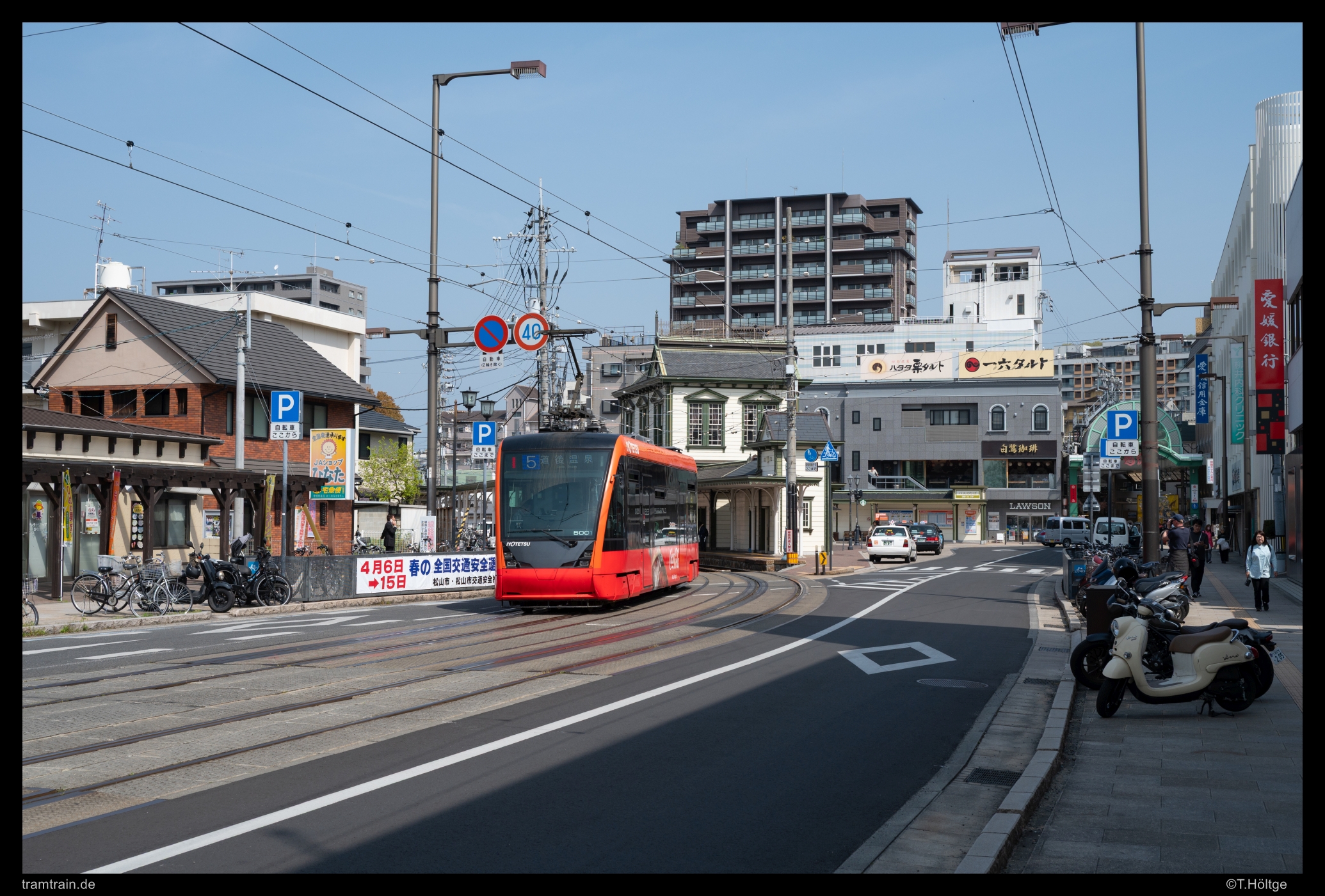 Auf der Straße vor der JR Station (05) verläuft die Loop-Line mit den Ringlinien 1 und 2 und der hier endenden Linie 5. Der gesamte Nordwestbogen von hier zum Abzweig zum Dogo Onsen, also rund die Hälfte der Loop, ist eingleisig mit Ausweichen trassiert.