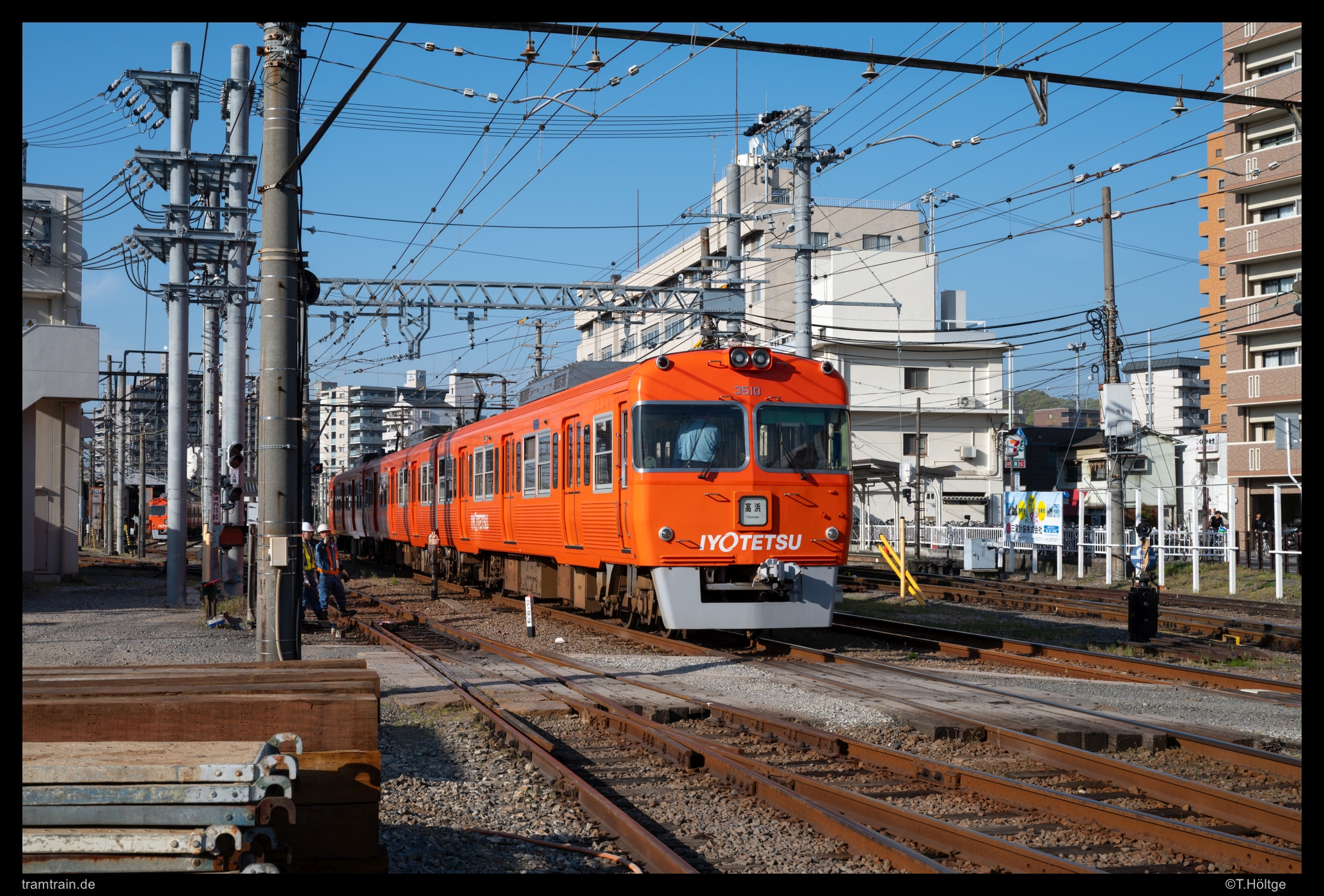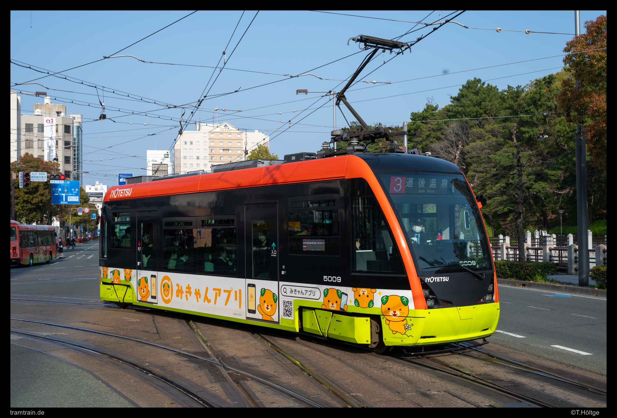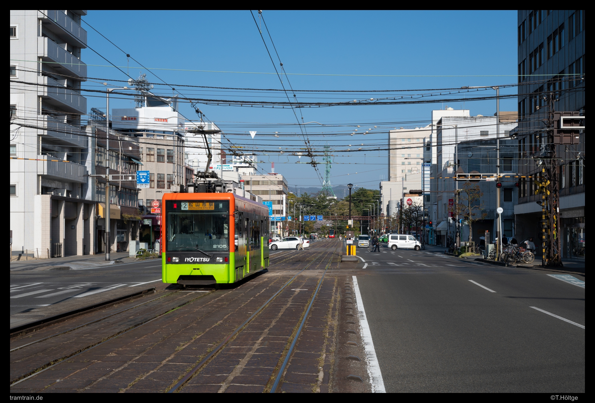 Auf der Straße vor der JR Station (05) verläuft die Loop-Line mit den Ringlinien 1 und 2 und der hier endenden Linie 5. Der gesamte Nordwestbogen von hier zum Abzweig zum Dogo Onsen, also rund die Hälfte der Loop, ist eingleisig mit Ausweichen trassiert.