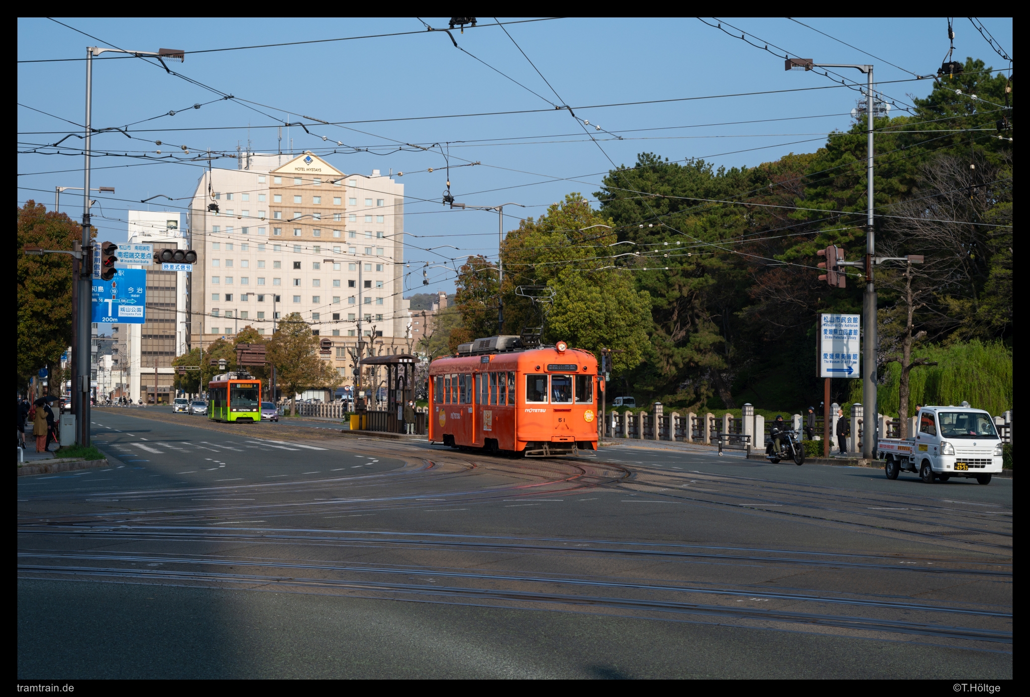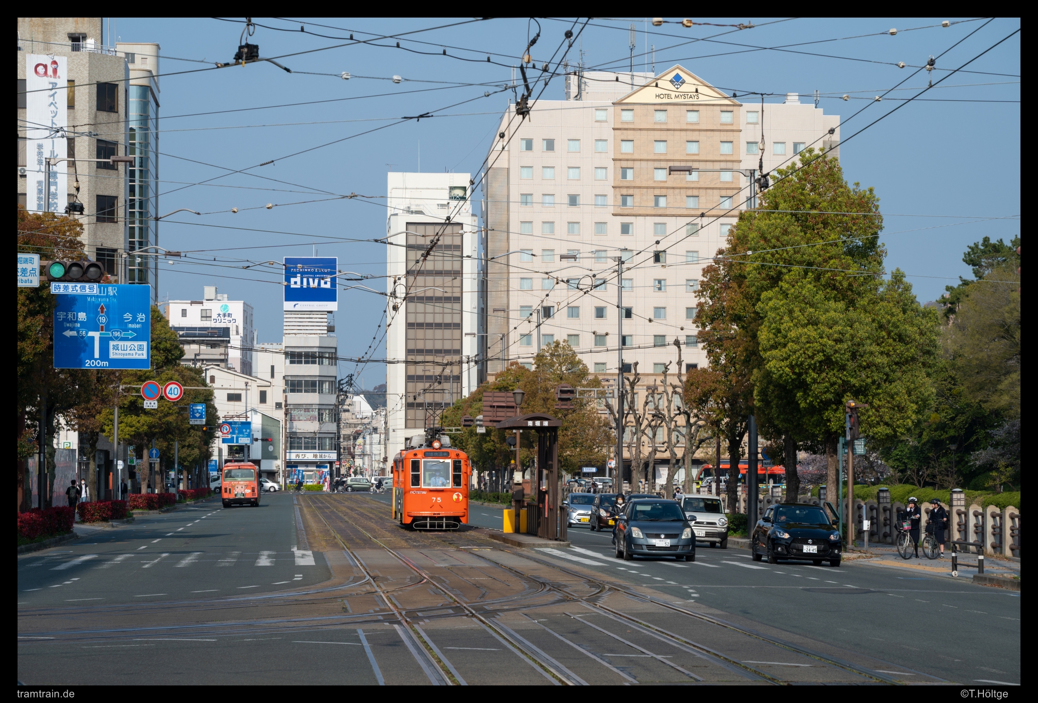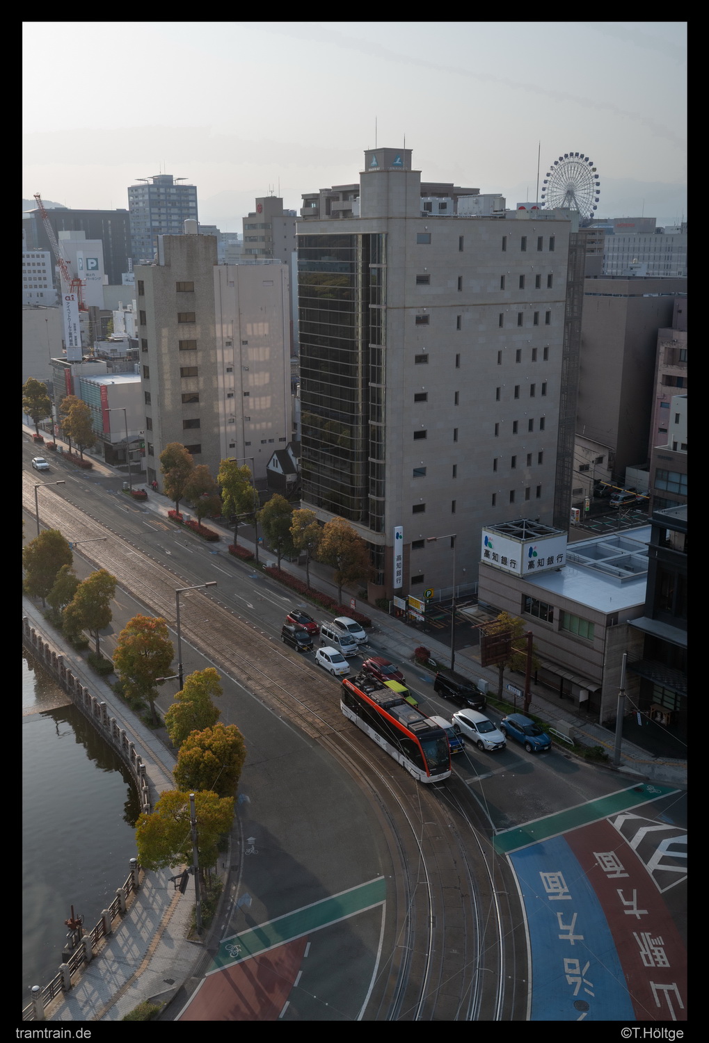 Eine Haltestelle weiter dem Ring gefolgt stehen wir dort, wo wir erstmal die Frühspitze auschecken wollten, an der Haltestelle Minami-Horibata (02), an der sich der Abzweig vom Ring zur Matsuyama City Station befindet. Ein Blick auf den Netzplan oben verrät, dass wir hier alle fünf Linien im Blick haben. Schon nach kurzer Zeit rollt erstmals der Grund für das frühe Aufstehen vor der Kulisse unseres Hotels heran, einer der MoHa50-Altwagen. Davor kommt noch der Little Dancer 5016 durch, der als Linie 5 als einziges keinen Abstecher zur City Station macht, sondern geradeaus weiter am Wassergaben der zentralen Parkanlage entlangfährt.