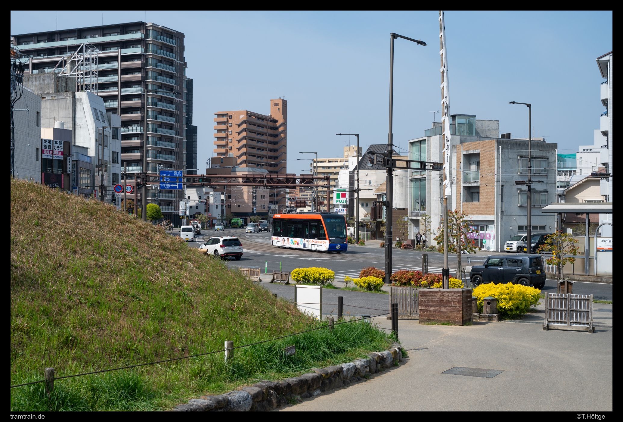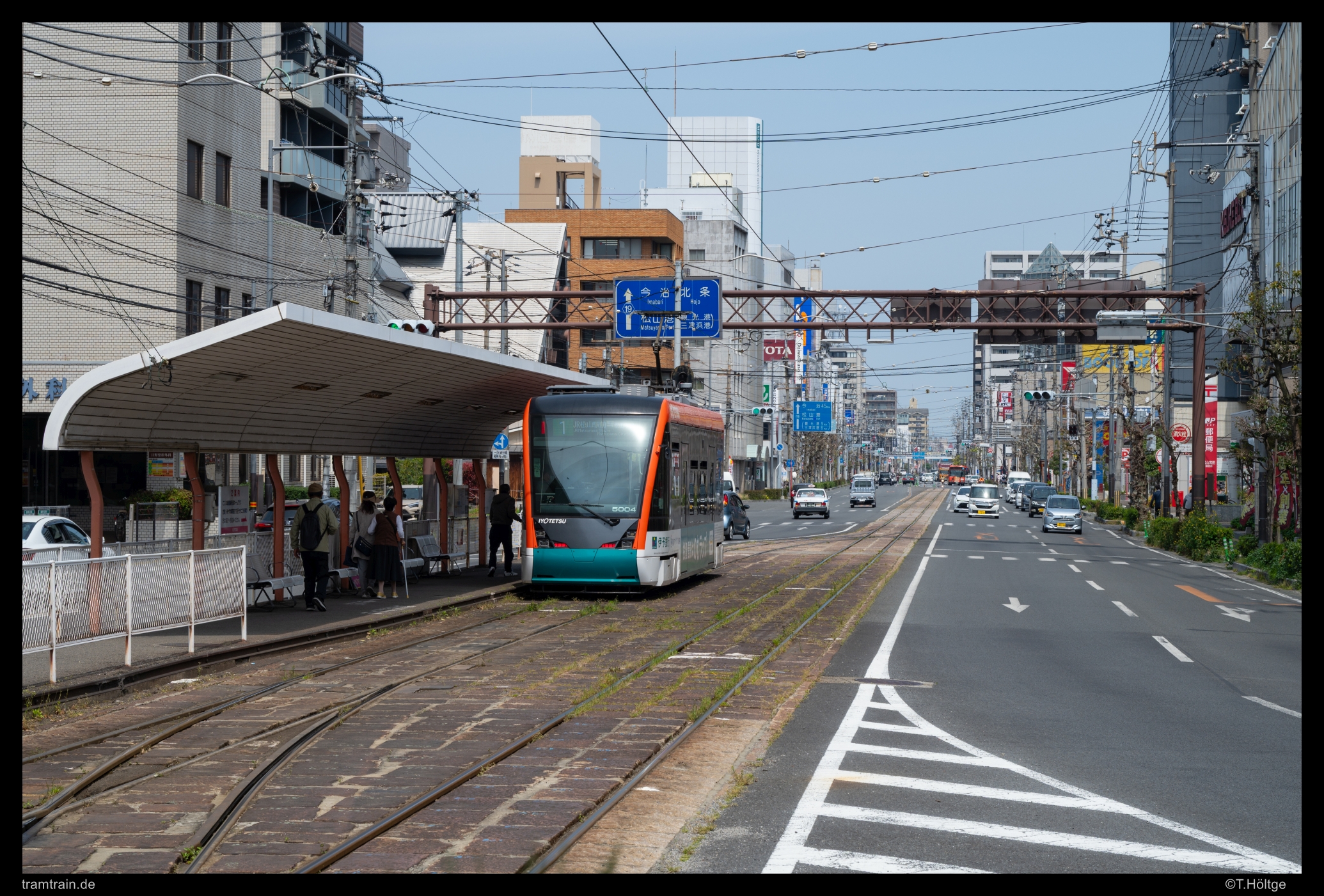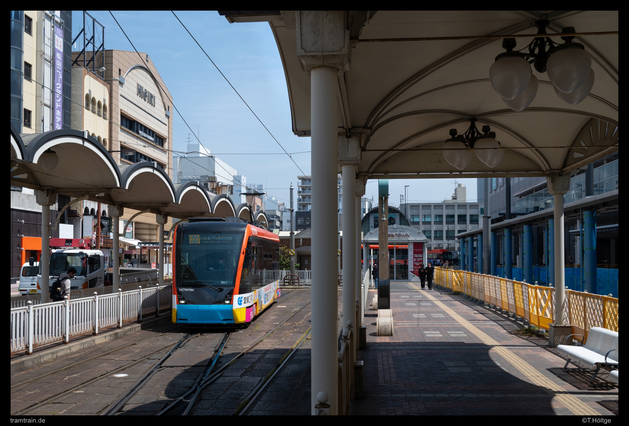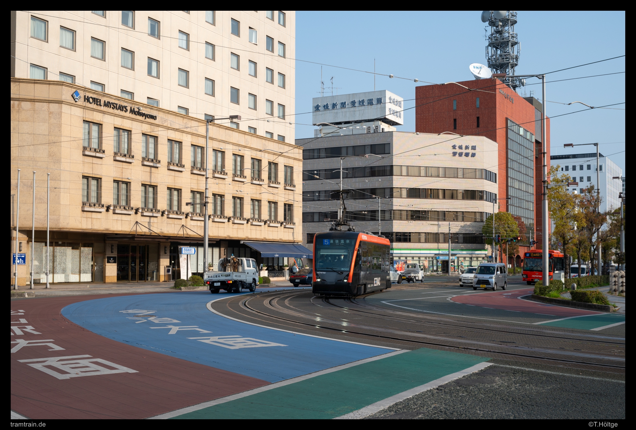 Die Westseite der Loop bereisten wir dann anschließend mittels zweier Einzelfahrten, in einer ersten Etappe bis zum Bahnhof Komachi (07), in einer zweiten weiter bis zur JR Station (05), von der wir zur Haltestelle Otemachi (04) weiterliefen. Am Bahnhof Komachi trifft die Straßenbahn auf das ebenfalls kapspurige Vorortnetz der Iyotetsu, an das auch an der City Station Übergang besteht. In Komachi treffen beide allerdings in einem Bahnhof aufeinander und kreuzen sich im Anschluss niveaugleich. Die Strecke der Vorortbahn schneidet kurz das Innere der Loop und kreuzt diese an der Station Otemachi erneut auf dem Weg zur City Station, während die Straßenbahn den Schwenk über die JR Station mitnimmt. Ebenfalls am Bahnhof Komachi findet sich das einzige Depot der Straßenbahn.