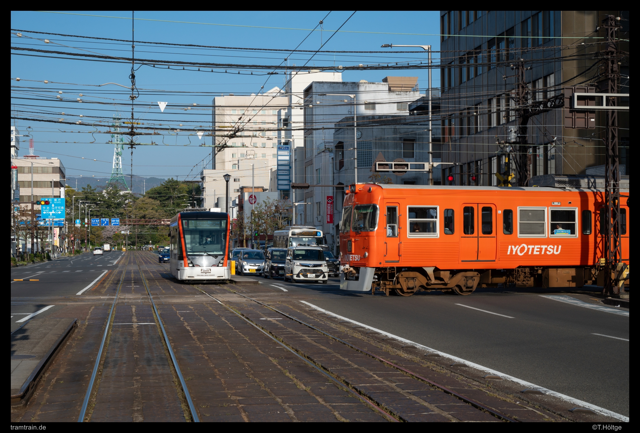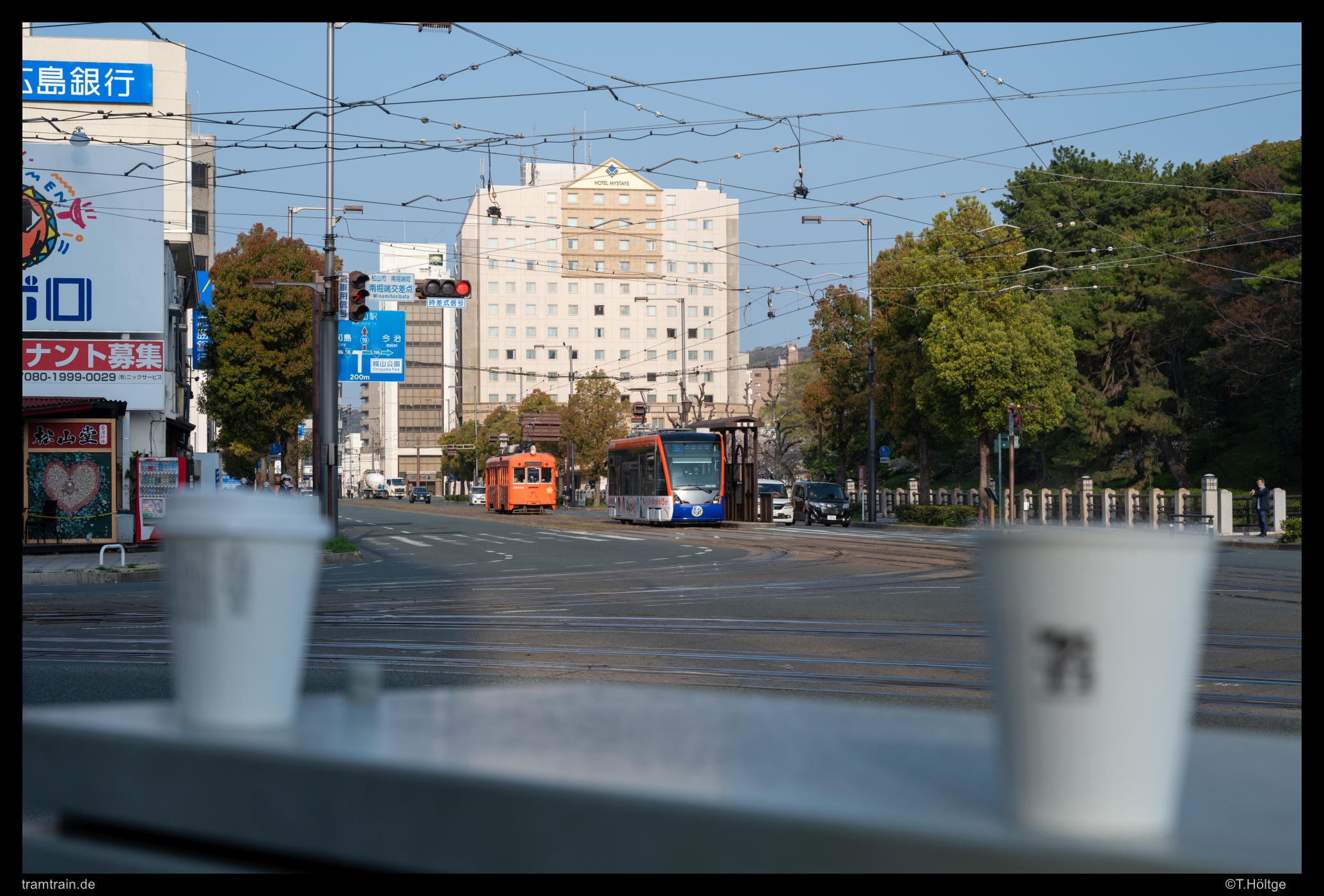 Wir verschoben uns nach der ersten Aufnahme an unserem Hotel direkt eine Haltestelle weiter an den Abzweig zur Matsuyama City Station, denn dort würden wir alle Linien im Blick haben. Noch schnell in den 7-Eleven auf der Ecke für einen ersten Kaffee und eine Waffel, dann stellten wir uns sonnentechnisch günstig in den südwestlichen Quadranten des Abzweiges.