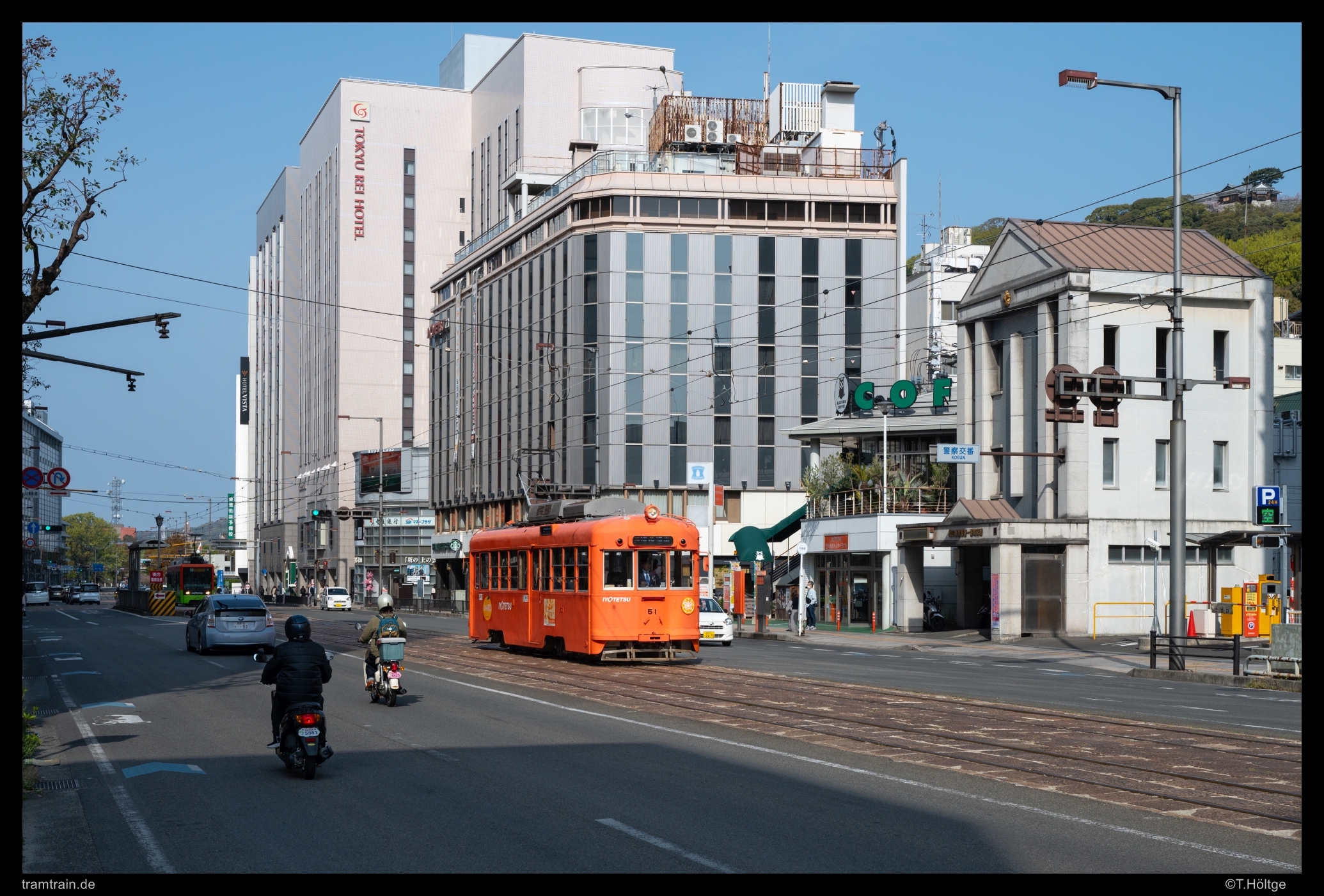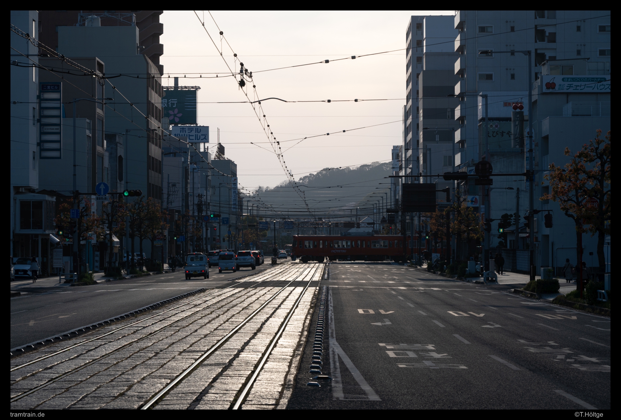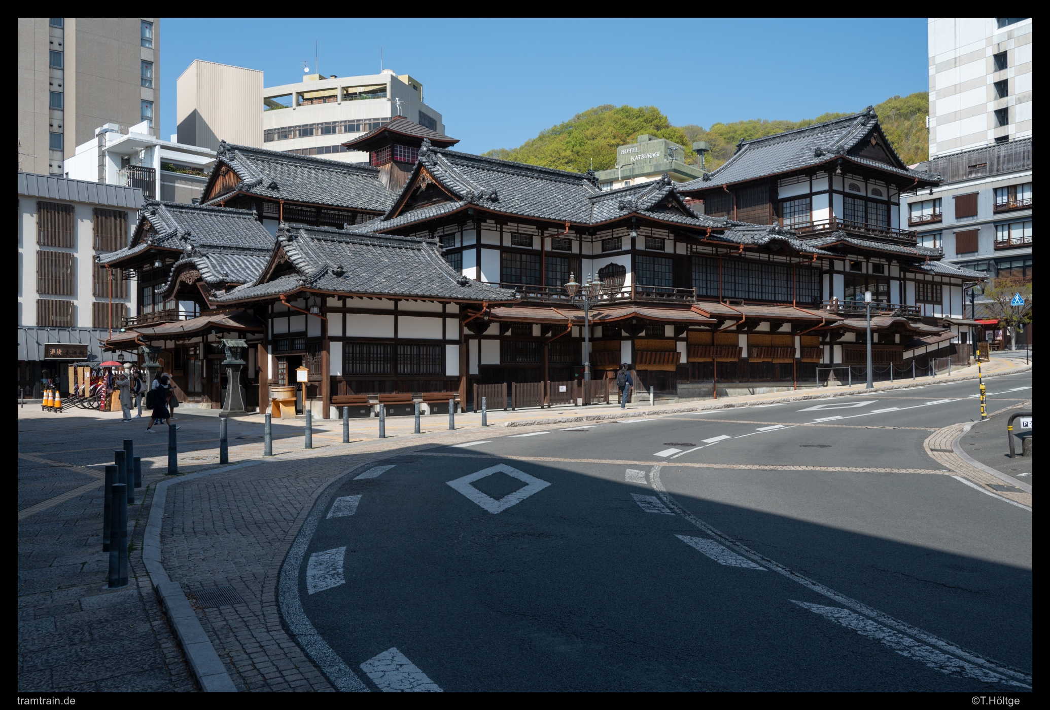 Für die Aufnahme am prächtigen Empfangsgebäude Dogo Onsen waren wir extra noch einmal hierher zurückgefahren. Passend, das dann gerade der 51 an der Reihe war. Auch unter der Normalbevölkerung genießt die Straßenbahn in Japan viel größeres Interesse, als das bei uns der Fall ist. Da fällt man oft nur auf, weil man mit der großen Kamera fotografiert und nicht mit dem Smartphone (und natürlich, weil man Europäer ist…).