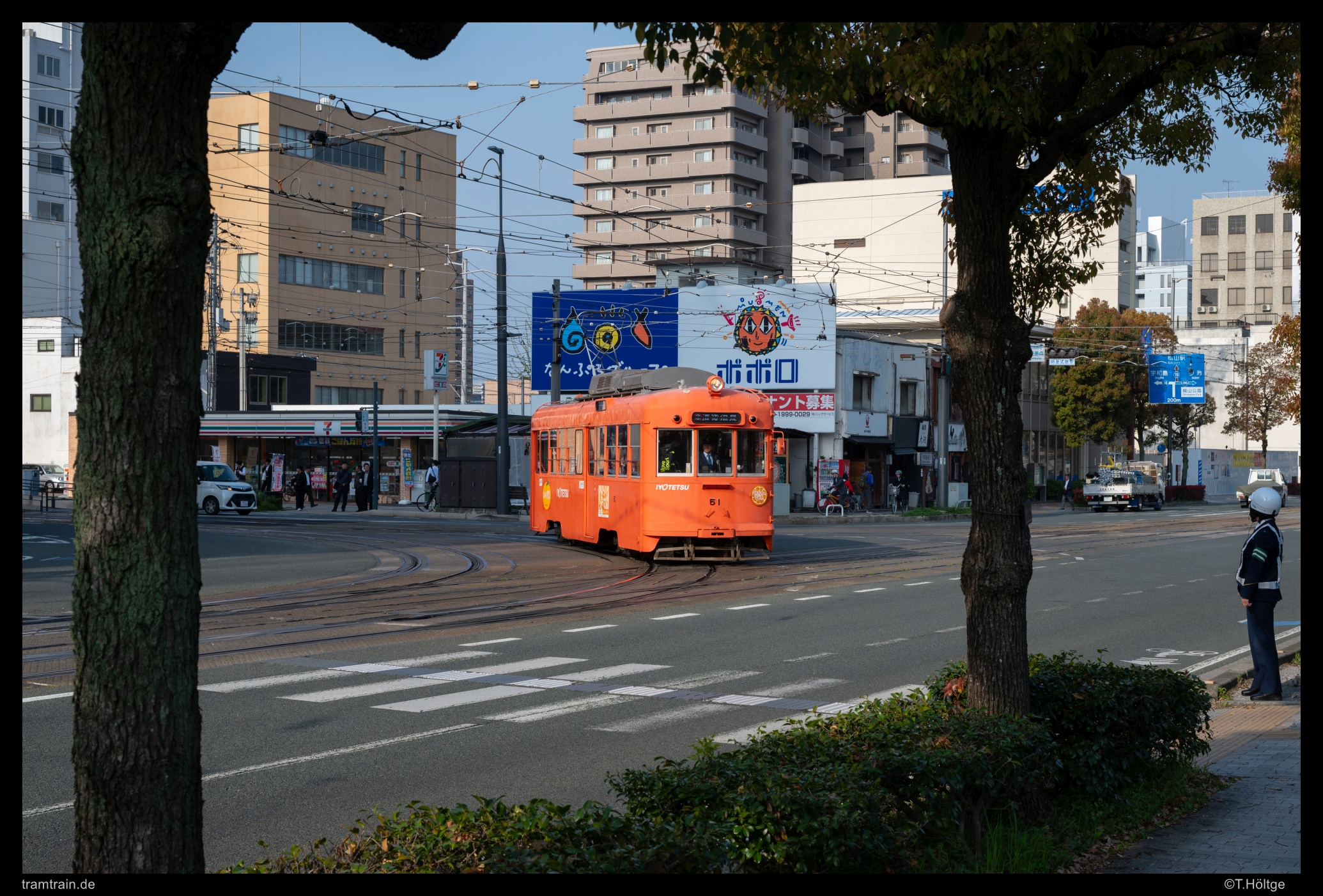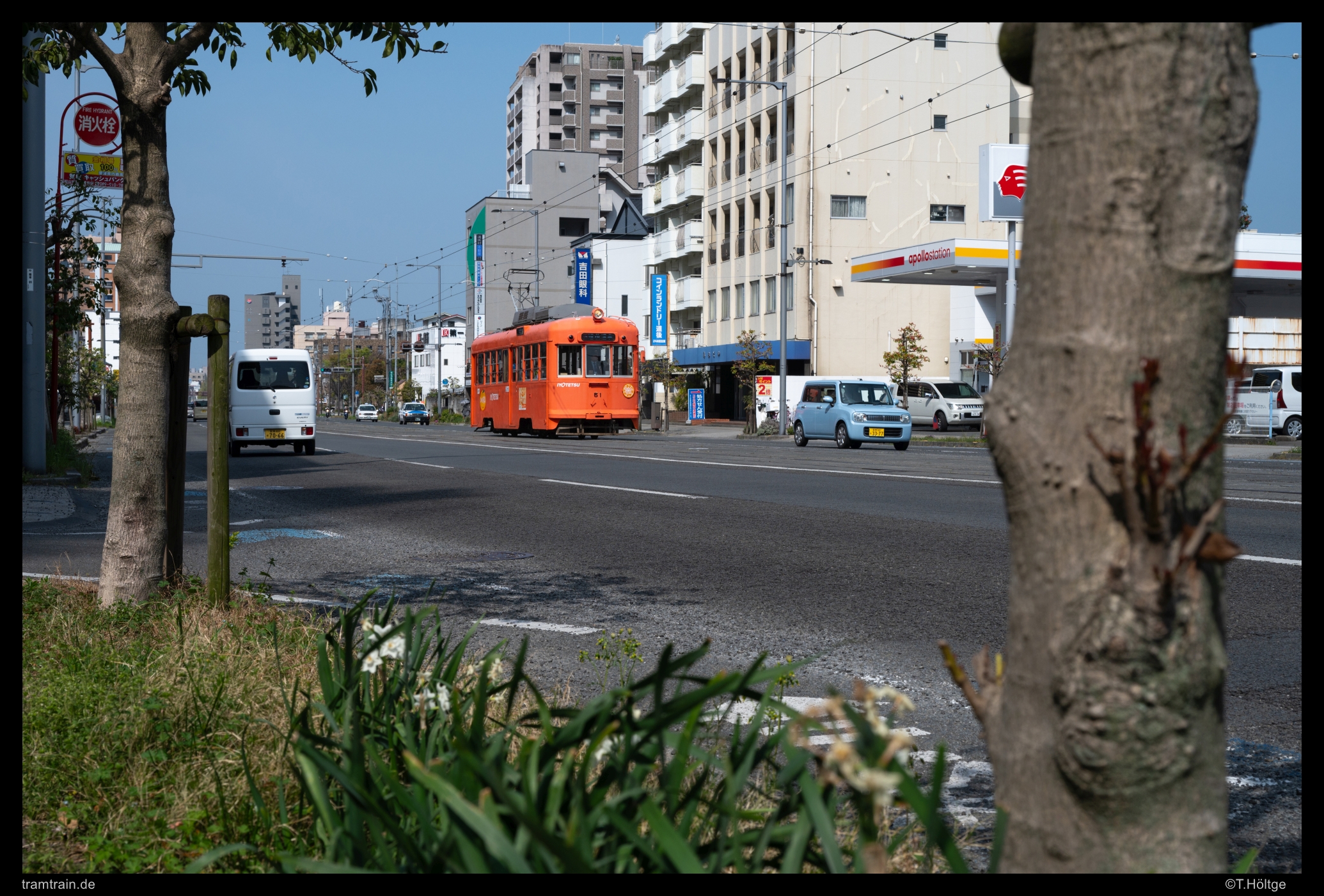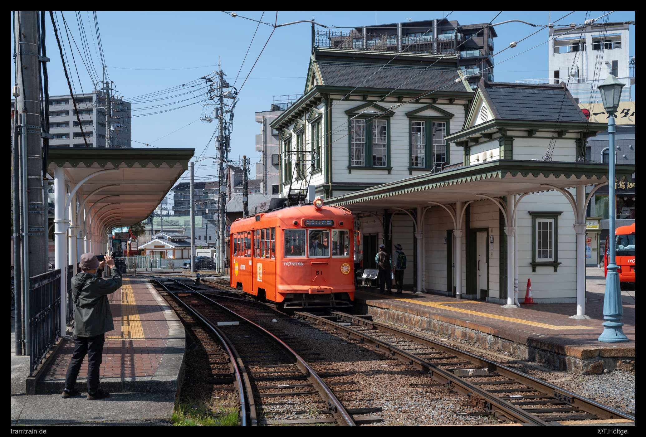 Für die Aufnahme am prächtigen Empfangsgebäude Dogo Onsen waren wir extra noch einmal hierher zurückgefahren. Passend, das dann gerade der 51 an der Reihe war. Auch unter der Normalbevölkerung genießt die Straßenbahn in Japan viel größeres Interesse, als das bei uns der Fall ist. Da fällt man oft nur auf, weil man mit der großen Kamera fotografiert und nicht mit dem Smartphone (und natürlich, weil man Europäer ist…).