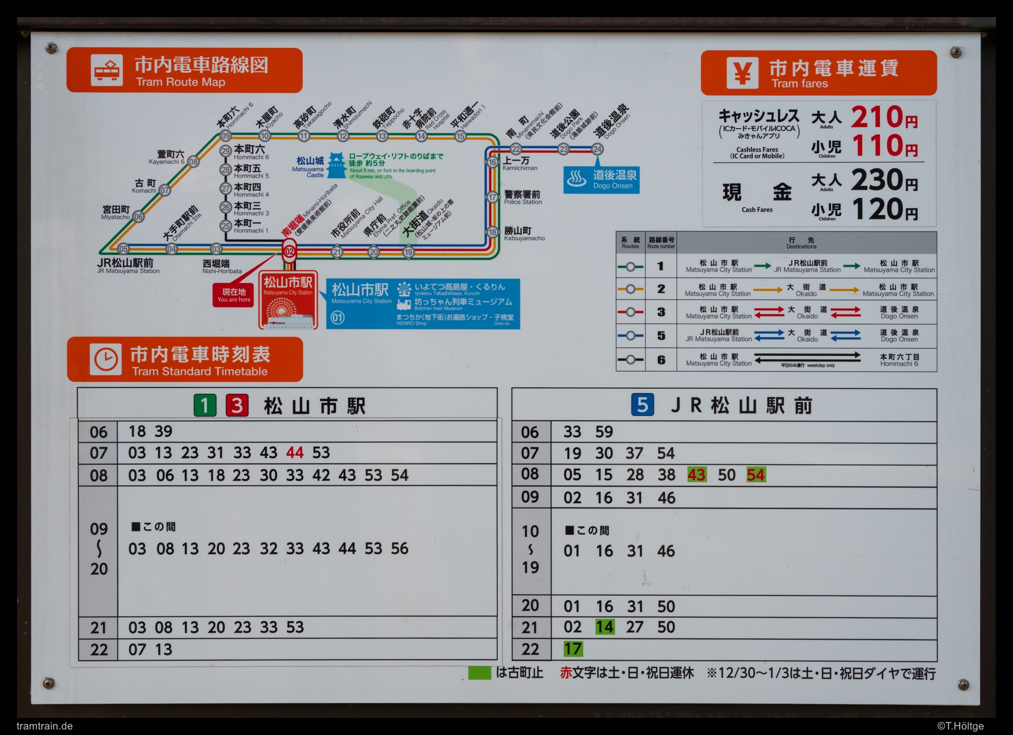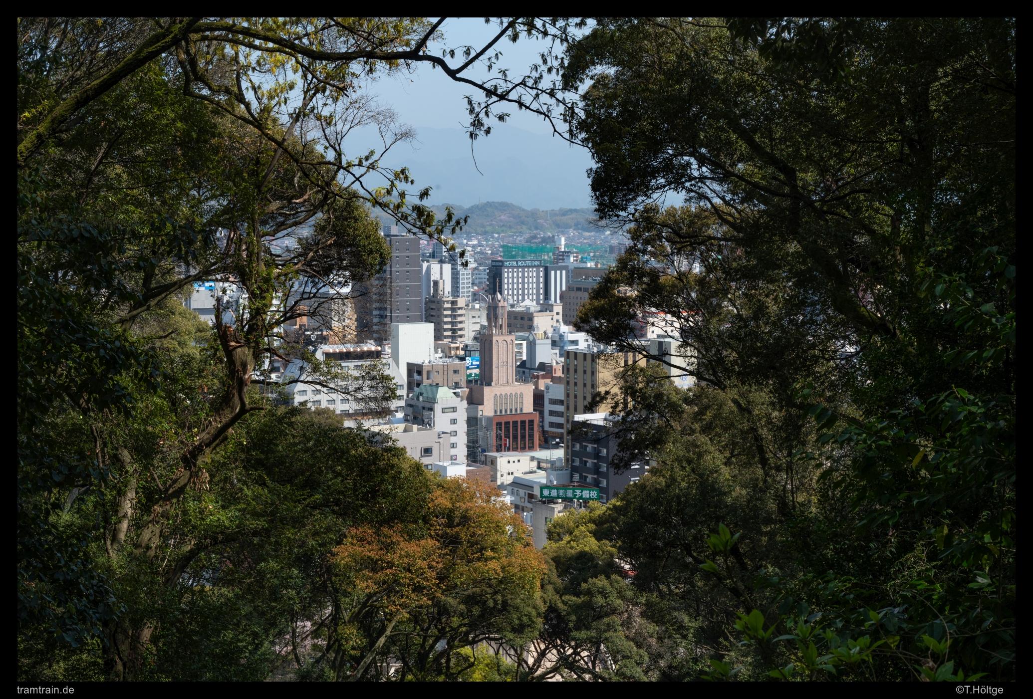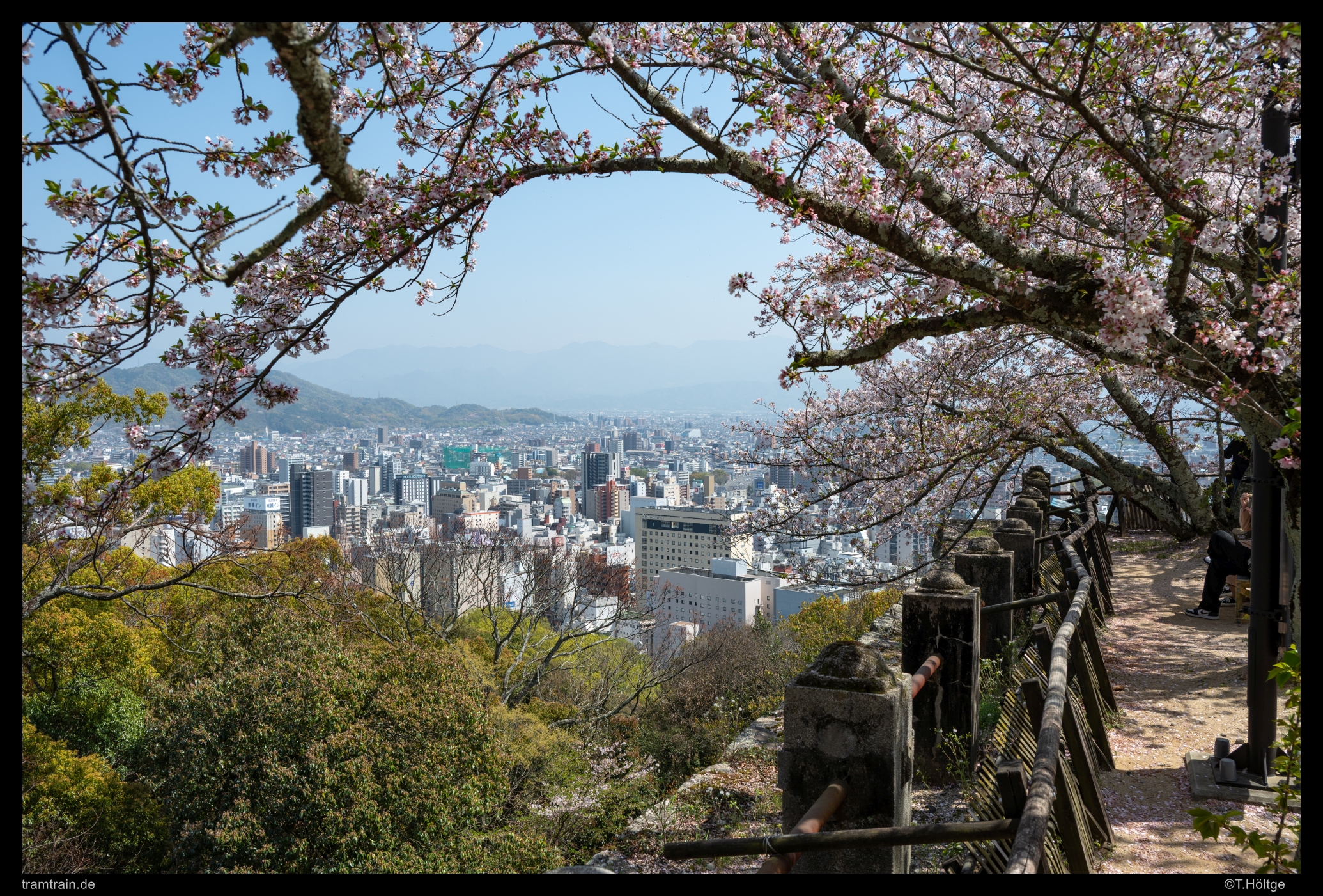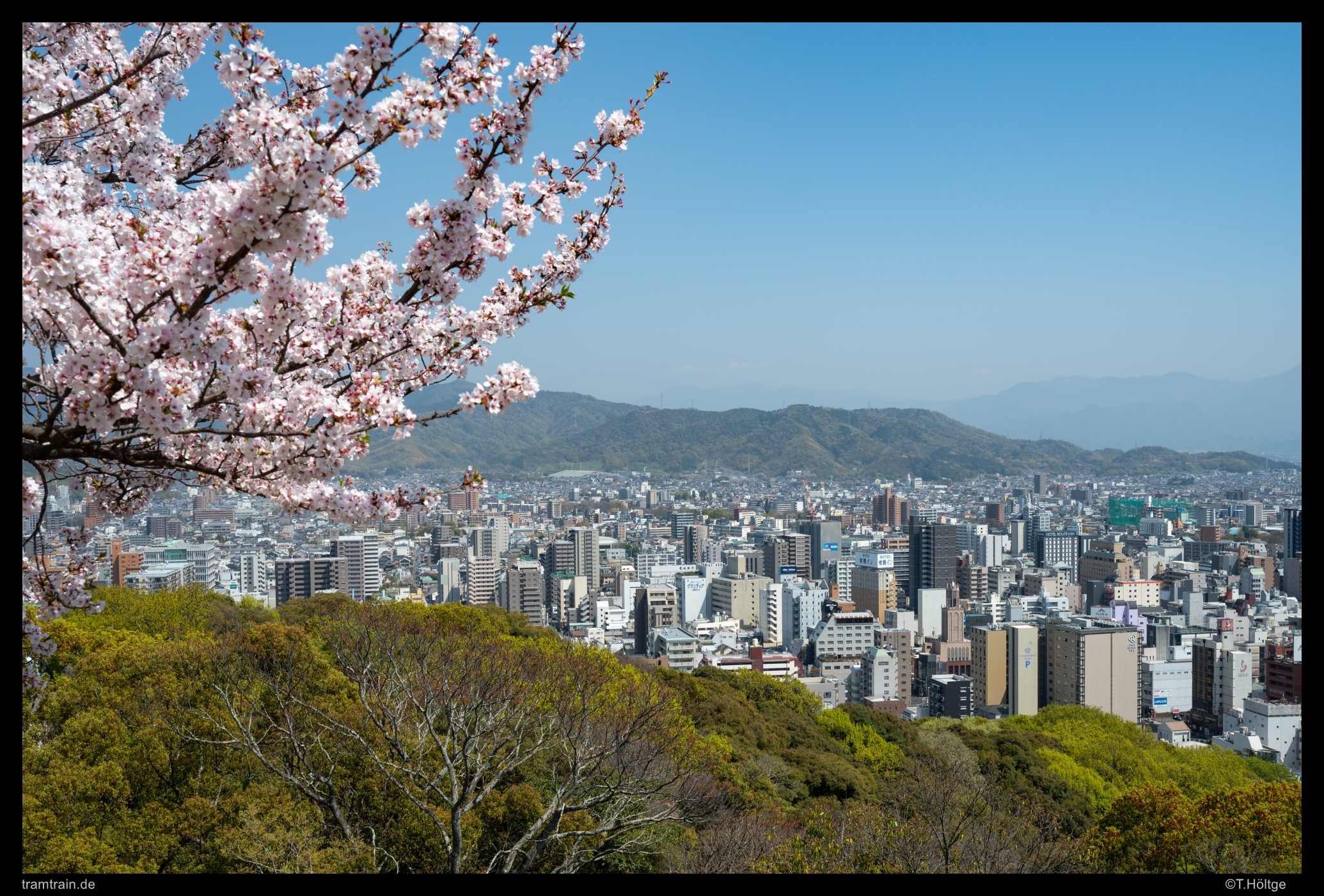 Wie immer begrenzen dicht bewaldete Hänge das Stadtgebiet auf drei Seiten, das Meer auf der Vierten. Die Innenstadt ist aber ein ganzes Stück vom Meer weggerückt in Richtung der Berghänge – hinter dem Dogo Onsen geht es quasi direkt in die Hügel. Nur dieser Innenstadtbereich rund um den Hügel des Castles wird von dem kleinen Straßenbahnnetz erschlossen, den Rest übernehmen die Vorortlinien der Iyotetsu, der Busverkehr und die JR-Linie.