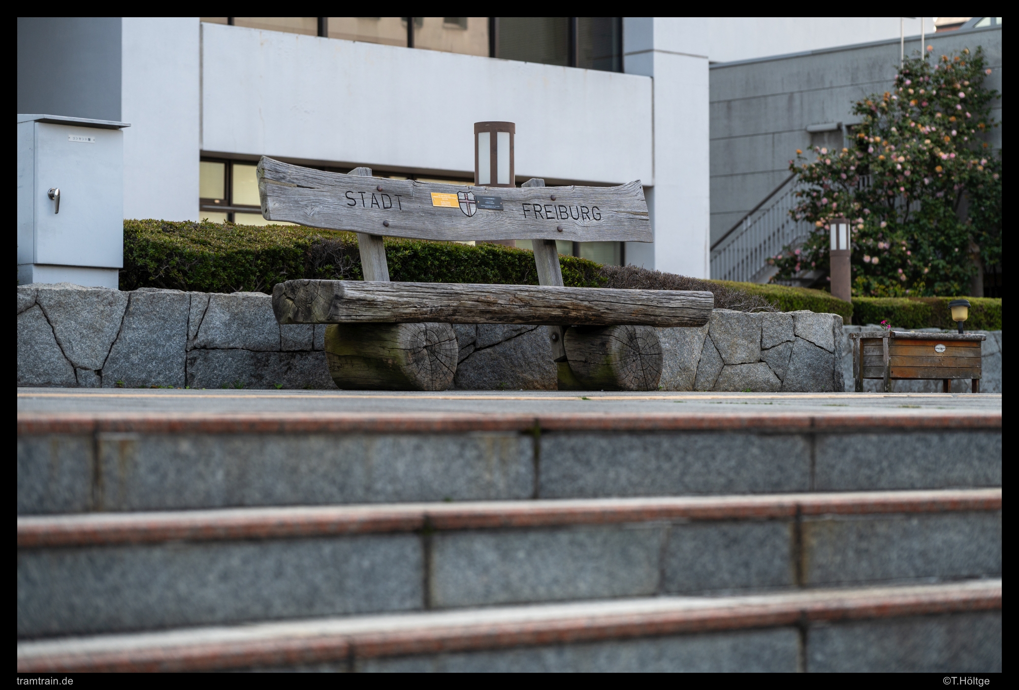 Unterdessen hatten wir auch den Wagen 2002 gesichtet, womit von allen drei Altbauserien Fahrzeuge im Einsatz standen. Das war doch mal sehr erfreulich. Nachdem damit auch schon die Fahrzeugaufnahmen aller Bauserien im Kasten waren, war die halbe Miete eigentlich schon eingefahren und wir konnten uns direkt der Netzerkundung widmen. Wir liefen daher einfach mal den Ring an der Innenstadtstecke entlang, vorbei an der City Hall und dem Verwaltungsgebäude der Präfektur Ehime. Ersteres ließ sich zwar nicht mit der Tram darstellen und war auch eher die Standard-Architektur, dafür fand sich mit einer Sitzbank der Partnerstadt Freiburg ein nettes Detail auf dem kleinen Platz vor der City Hall.